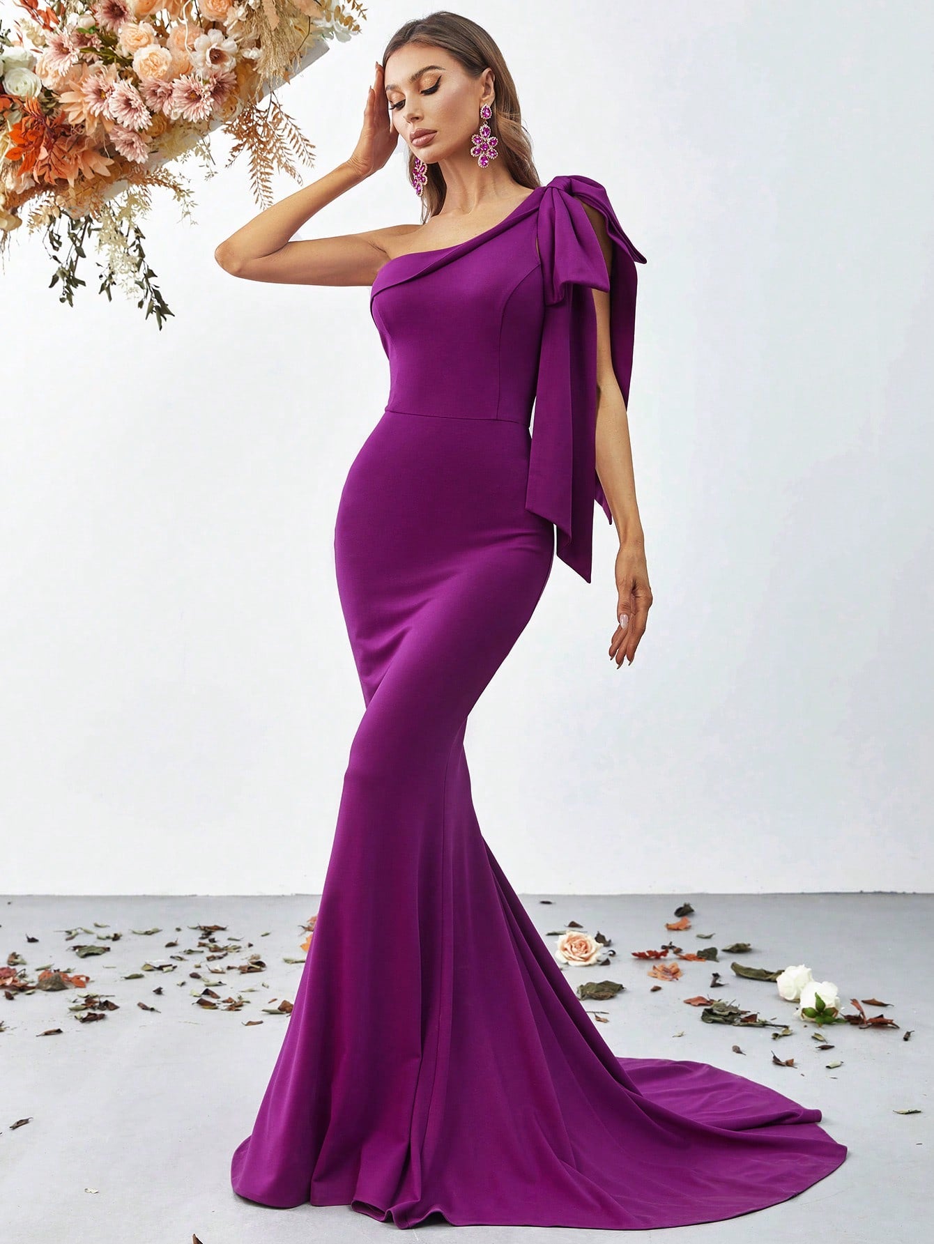 Our elegant bow one-shoulder sleeveless satin mermaid dress is designed to make you feel like a goddess. Crafted from luxurious satin, this dress features a flattering mermaid silhouette with a stylish bow accent on the one-shoulder design. The sleeveless and full-length skirt add glamour and drama to the overall look. This dress is perfect for proms, weddings, galas, and other special occasions.