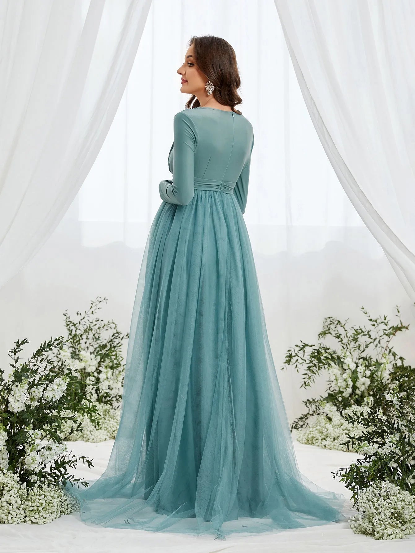 Exude a sense of tranquil elegance in this serene gown, a garment that perfectly embodies the harmony of nature. The dress features a deep V-neckline that gracefully accentuates the décolletage, balanced by long, fitted sleeves for a look of sleek sophistication. The gathered empire waist is flattering to the figure, highlighting the natural waistline before the fabric spills into a flowing, floor-length skirt. This skirt, fashioned from layers of soft tulle, lends a breezy, ethereal quality to the gown, reminiscent of gentle winds through a meadow. Ideal for formal events in the spring or summer, this gown is a celebration of timeless style, gentle femininity, and the understated allure of nature's palette.