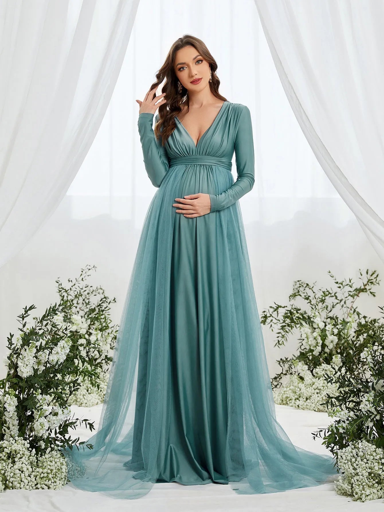 Maternity Plunging Neck Long Sleeve Contrast Mesh Formal Dress