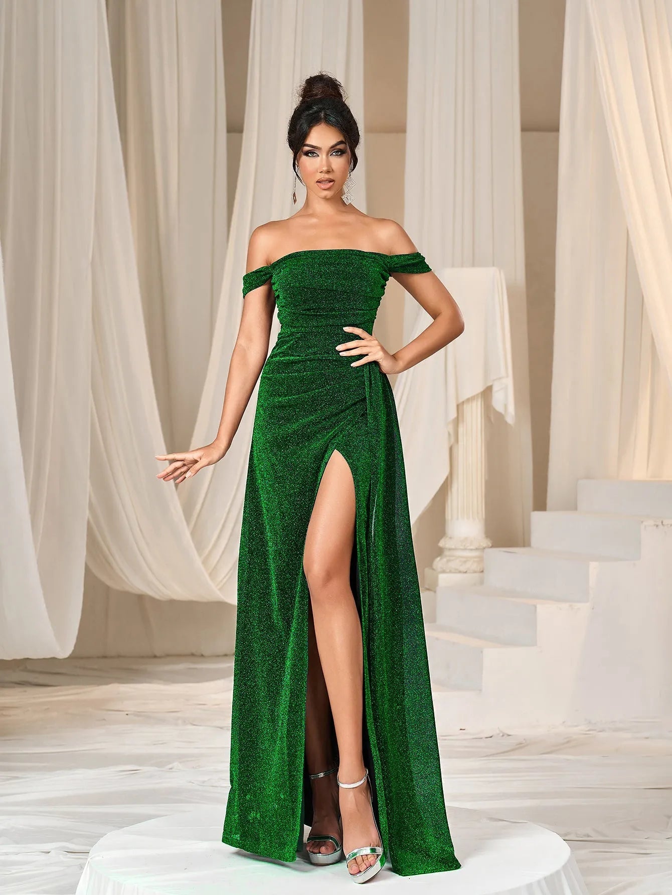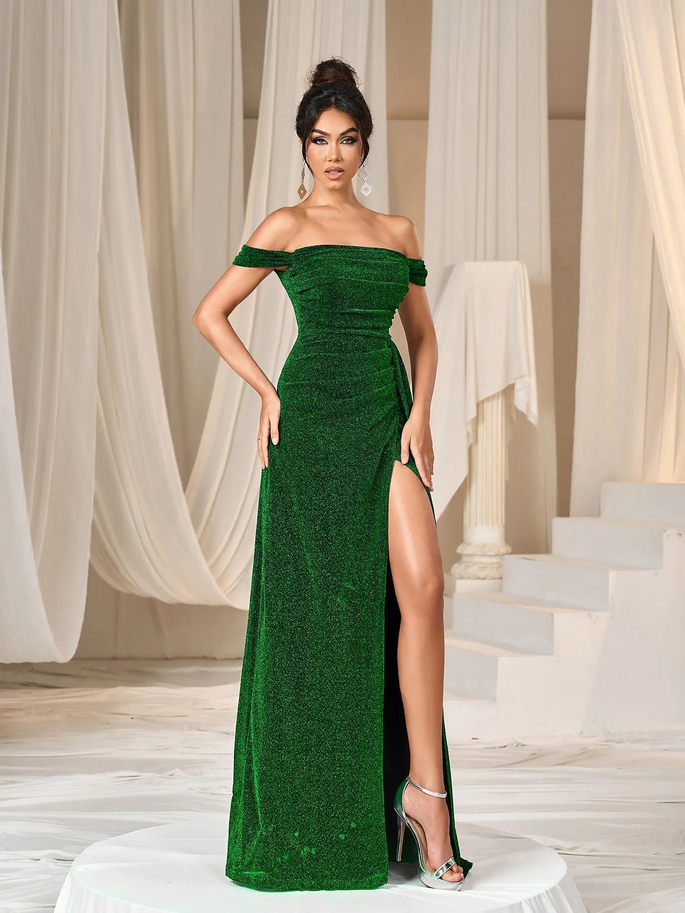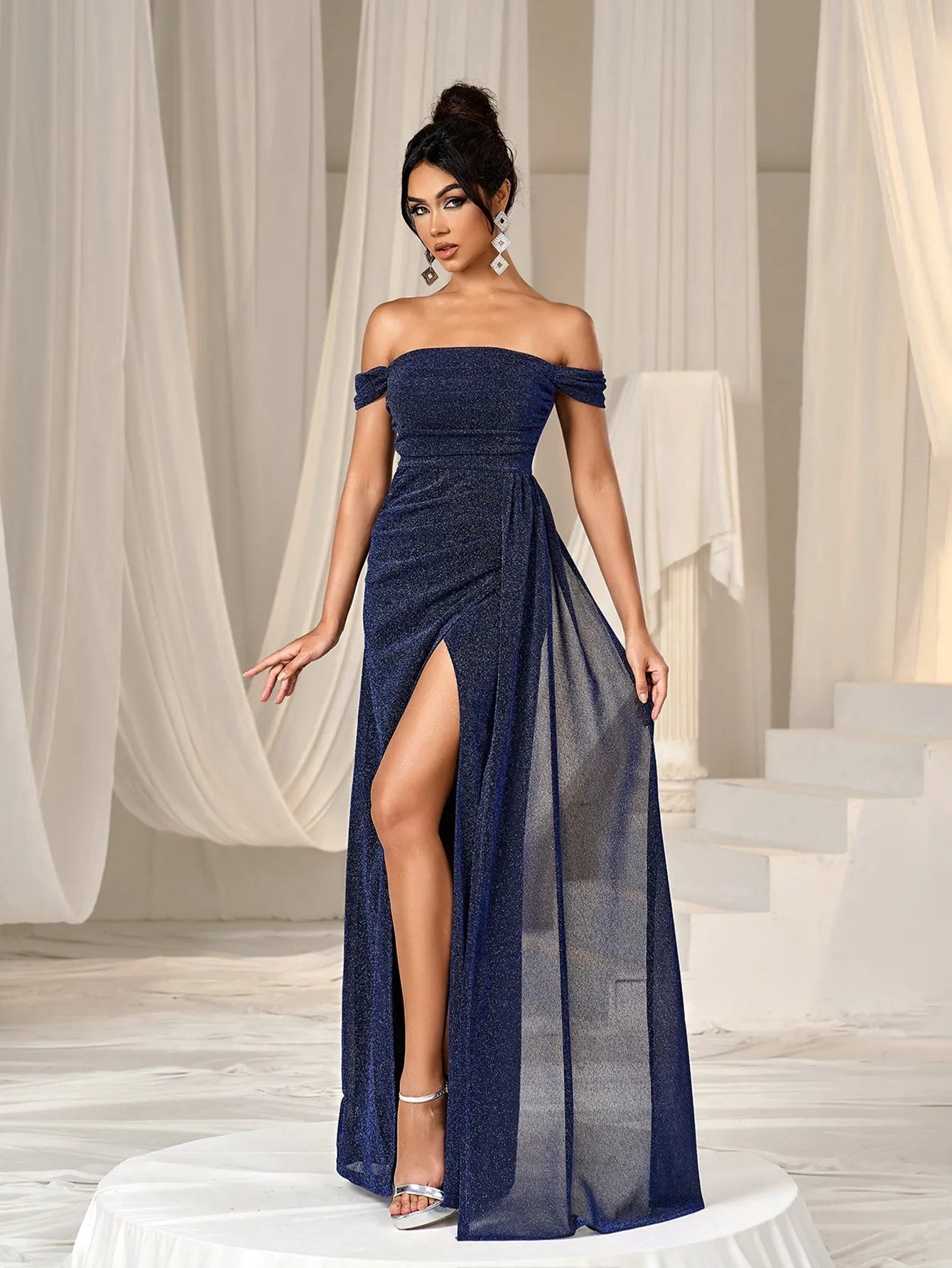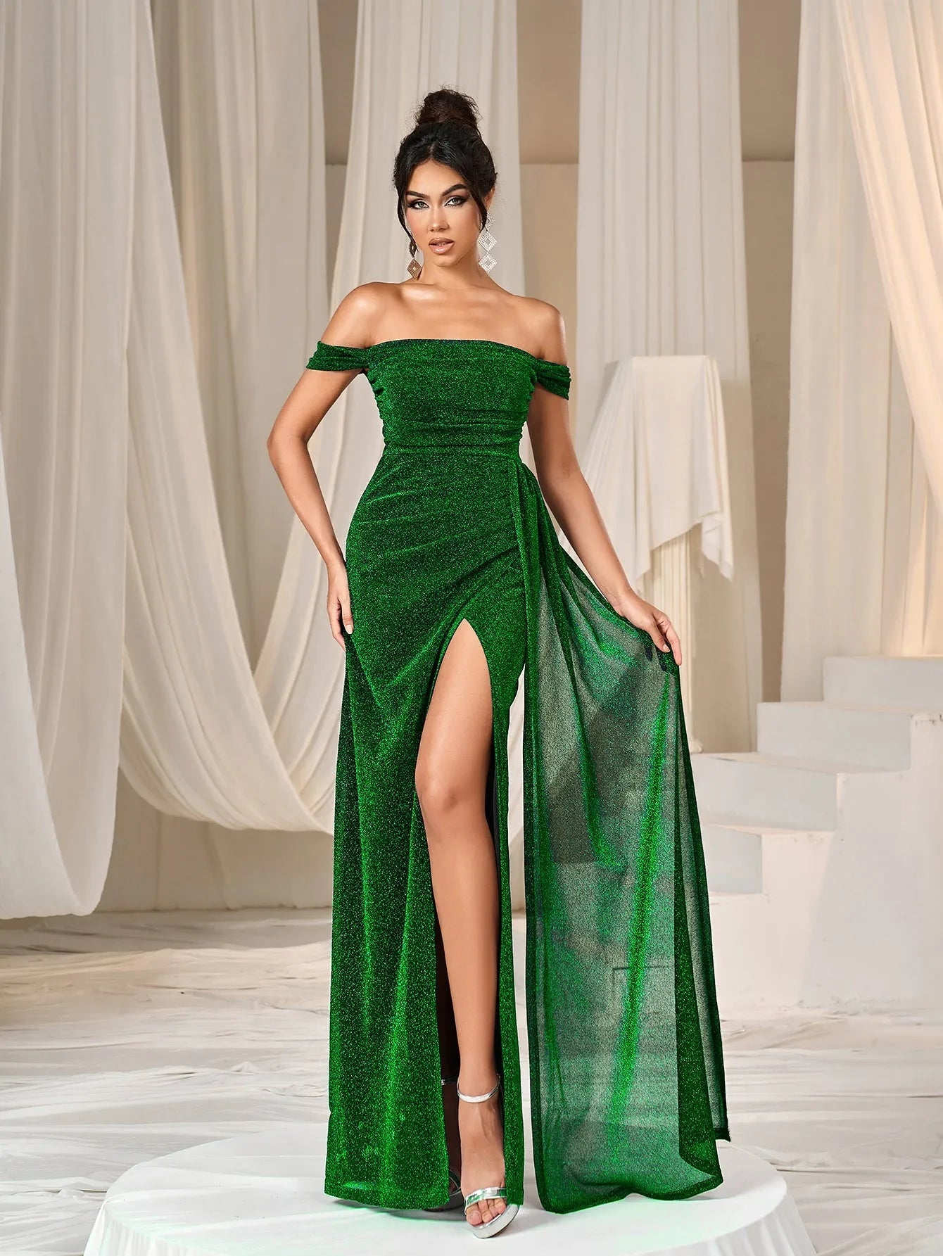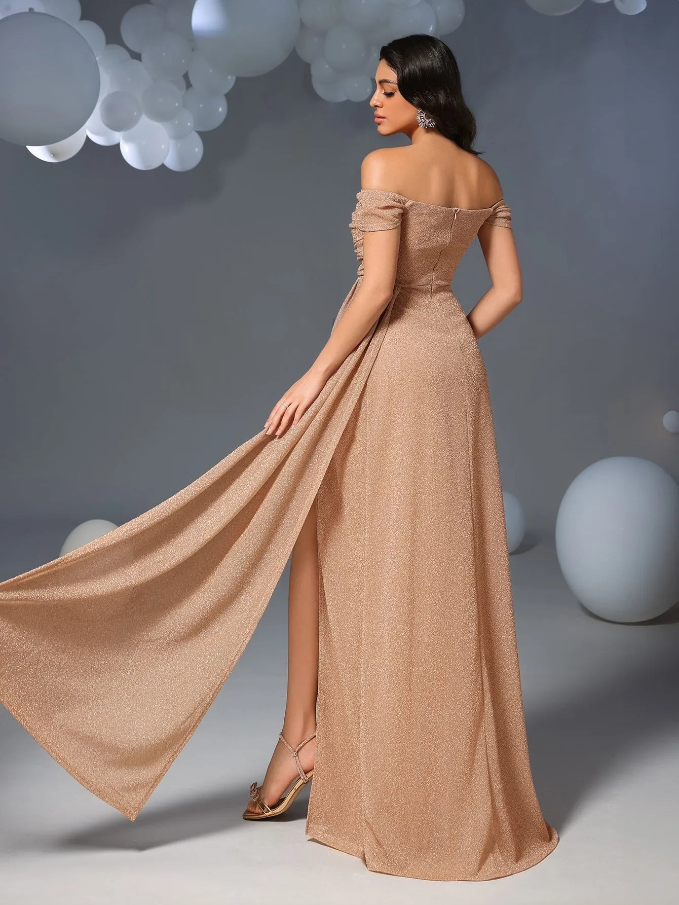 Step into elegance with our shimmering off-shoulder gown, perfect for your next glamorous event. The gown features a stunning off-shoulder neckline, showcasing your décolletage with a sophisticated touch. The fitted bodice gracefully flows into a floor-length mermmaid skirt, while the thigh-high slit adds a daring element of allure. The soft shimmer of the fabric catches the light beautifully, making you the center of attention.