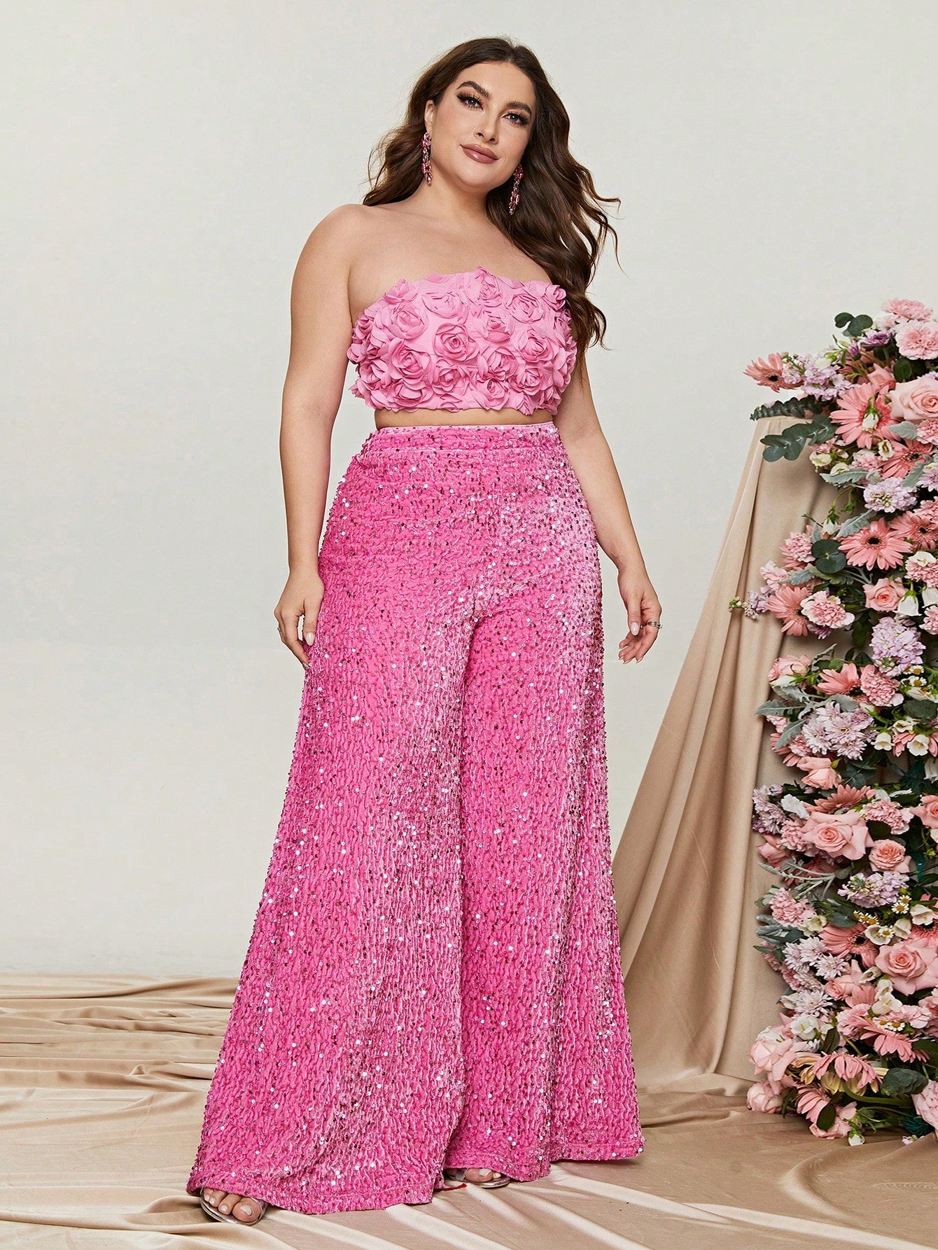 Plus 3D Flowers Tube Top & Wide Leg Sequin Pants