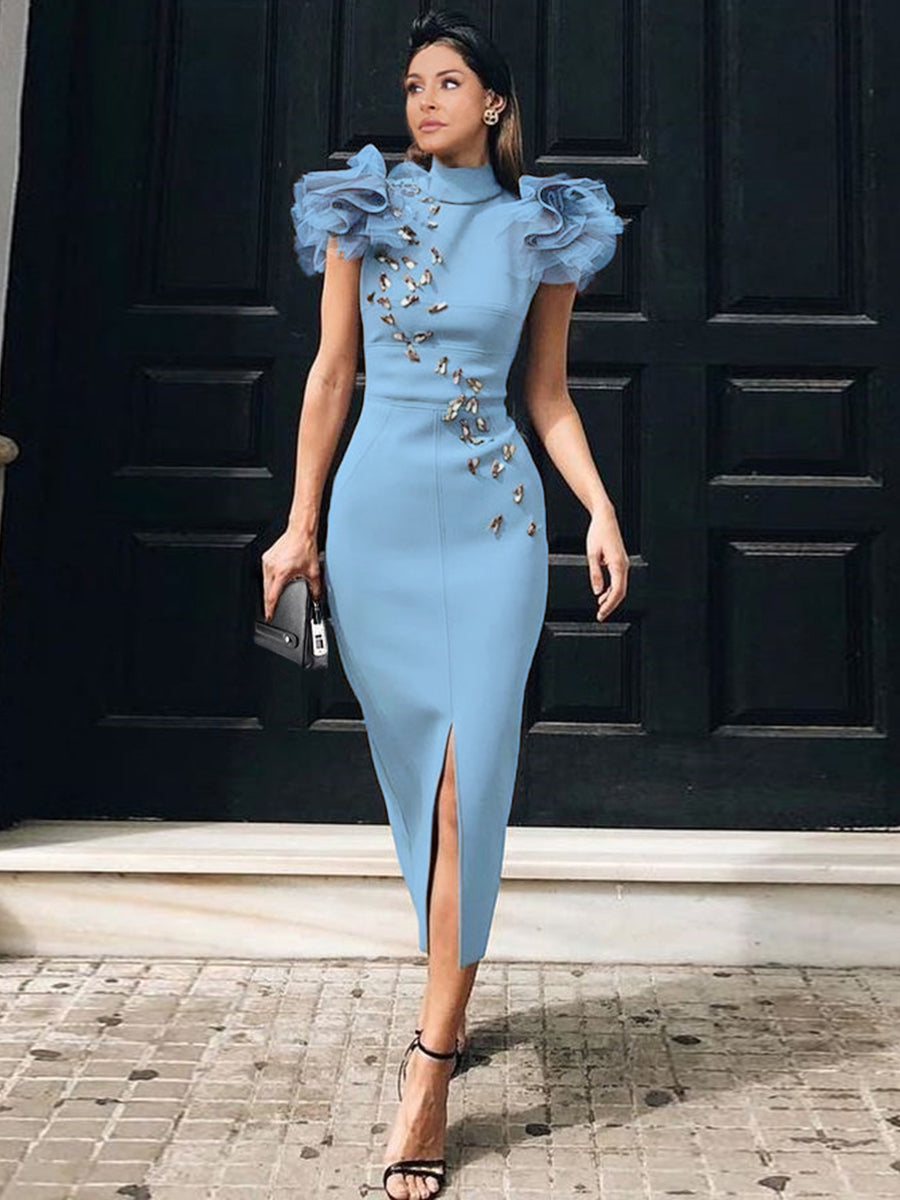 This charming dresses boasts all kinds of chic deets, like a ruffled short sleeves, and thigh-high side slit. Bodycon skirt is perfect for flaunting your figure and midi length keeps things modest. Hidden zipper at back bodice. Featuring a universally flattering fit, this dress is perfect for upcoming celebrations as it provides a comfortable yet fashionable style.