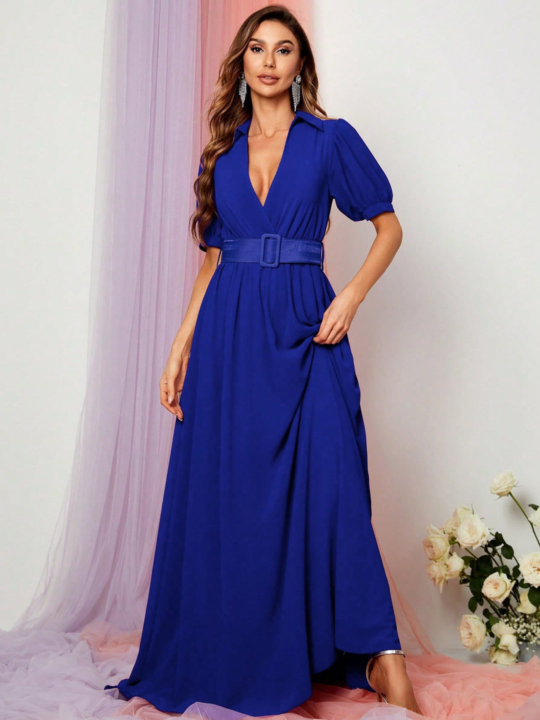 Deep V Neck Puff Sleeve Belted Maxi Dress