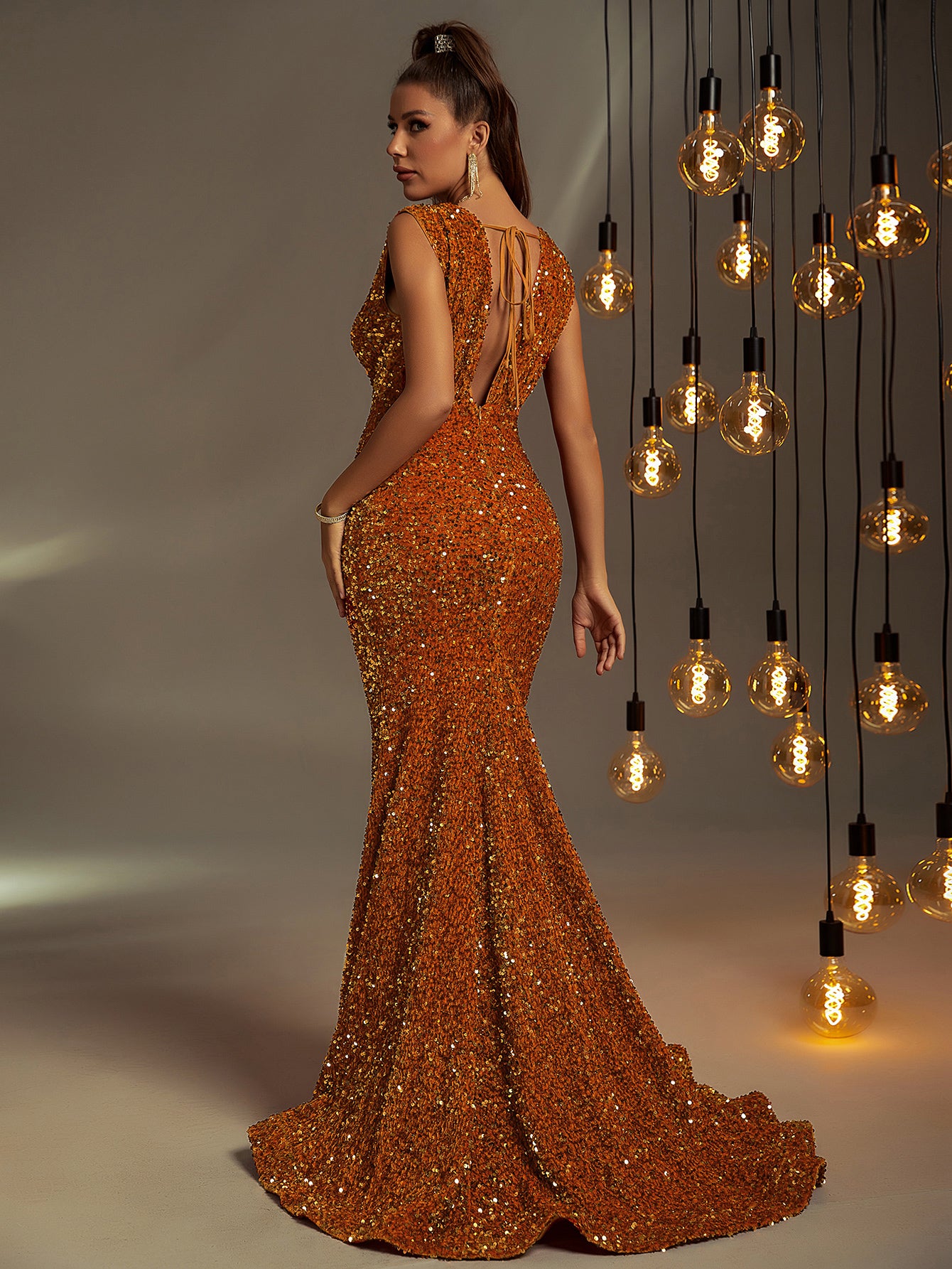 This dress is perfect for any special occasion. It features a deep V neckline, sleeveless design, and is adorned with sparkling sequins. The back of the dress is tied at the back of the neck, creating a beautiful backless look. The dress is sure to make you stand out in any crowd.