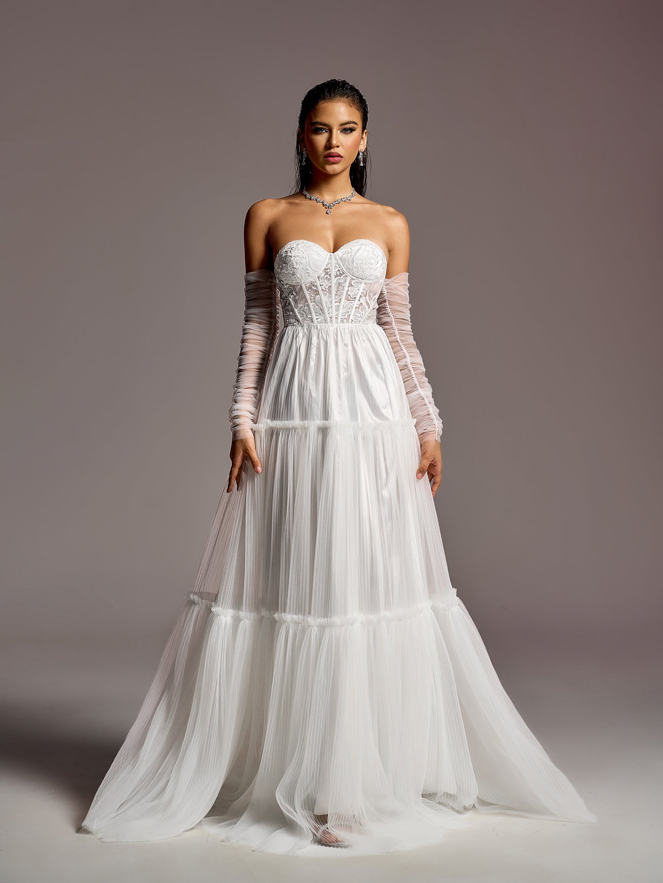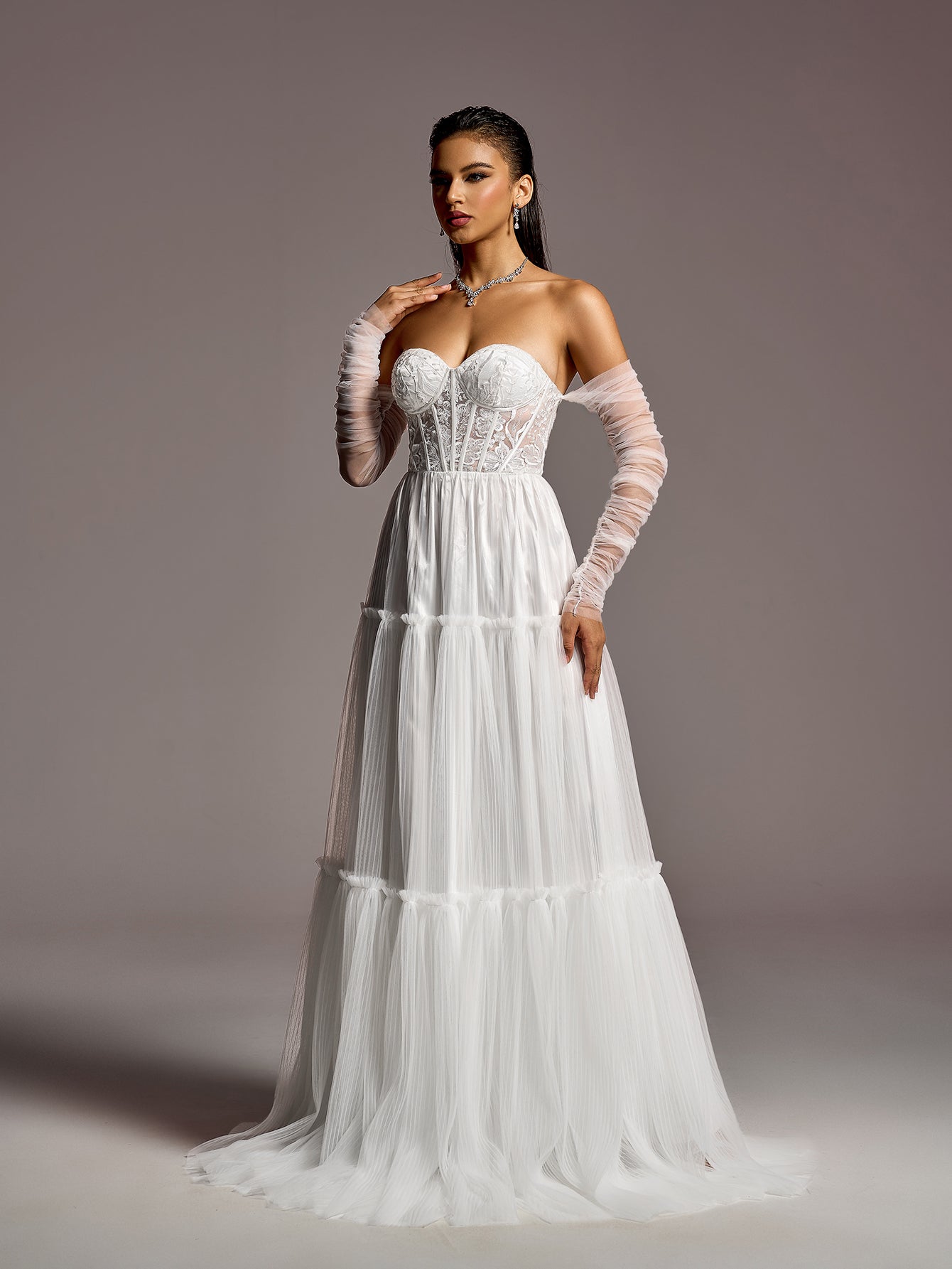 Ethereal Elegance: Our stunning bridal gown is crafted to make you feel like a vision of pure grace. The gown boasts a strapless sweetheart neckline that accentuates your décolletage, complemented by a fitted bodice that seamlessly transitions into a flowing, layered tulle skirt. The long, sheer sleeves add a touch of sophistication, while the full-length hemline creates a dramatic, floor-sweeping effect.