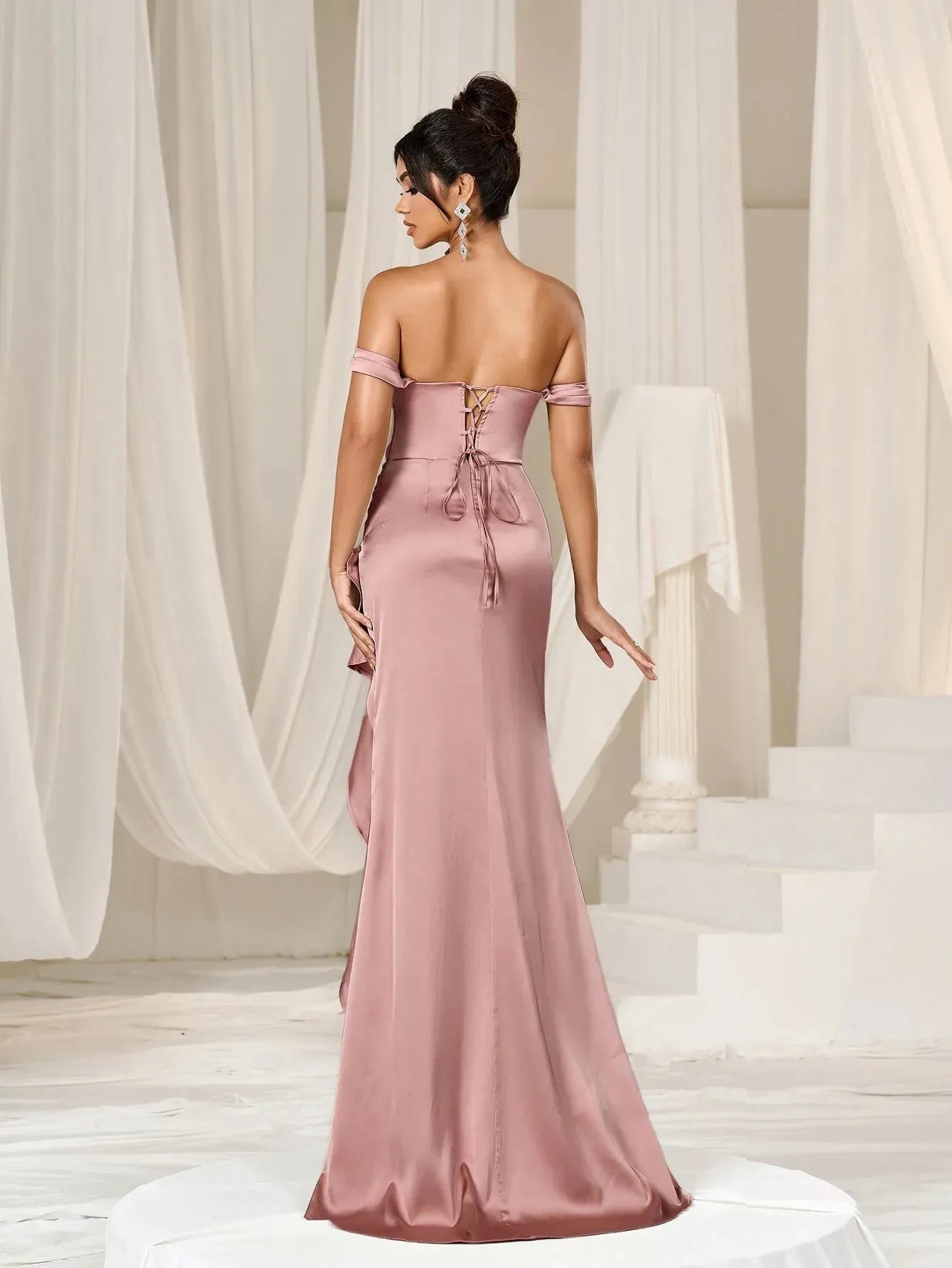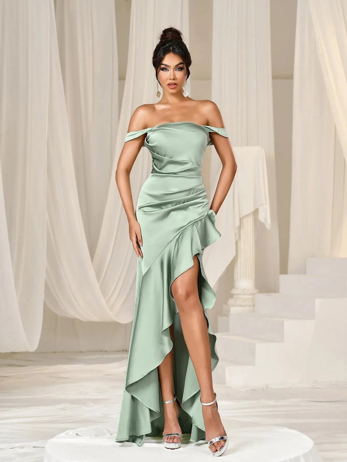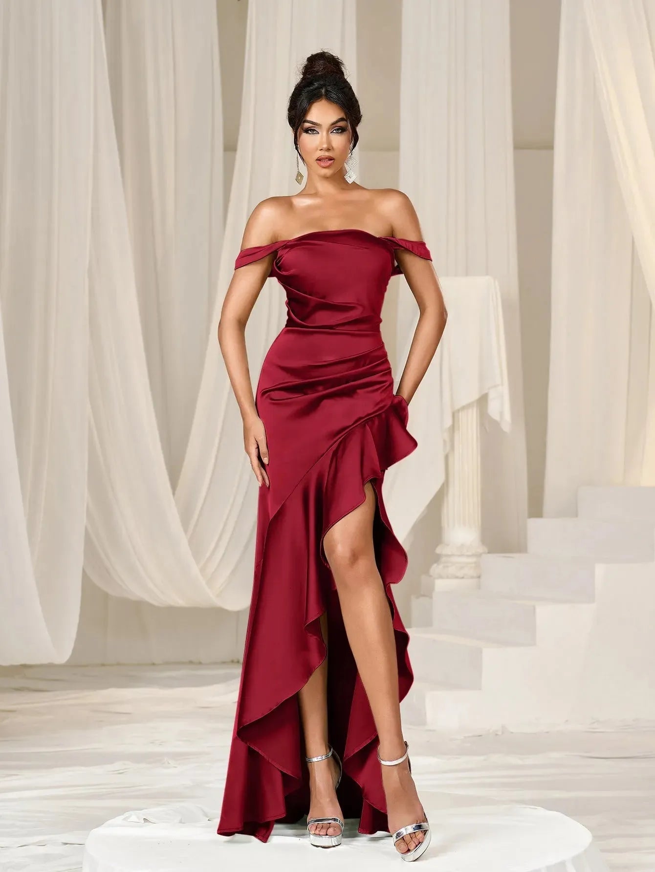 Turn heads with our exquisite satin gown. This enchanting dress features an off-shoulder design that gracefully highlights your neckline and shoulders. The fitted bodice and ruched detailing enhance your figure, while the high-low hemline adds a touch of modern elegance. The back features a lace-up detail, ensuring a perfect fit and adding an extra layer of sophistication.
