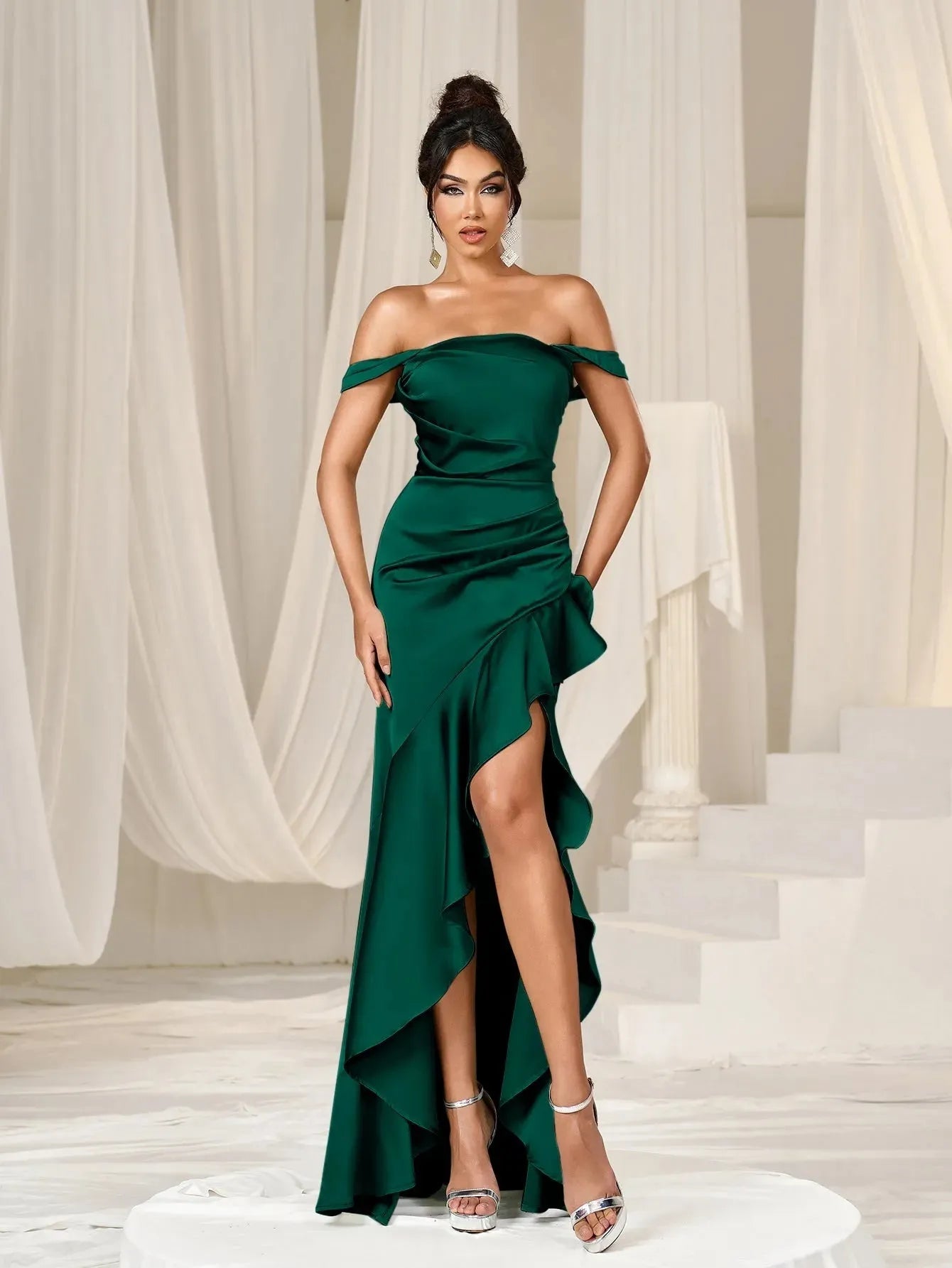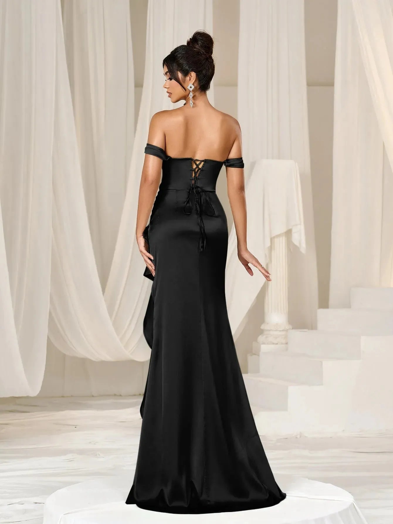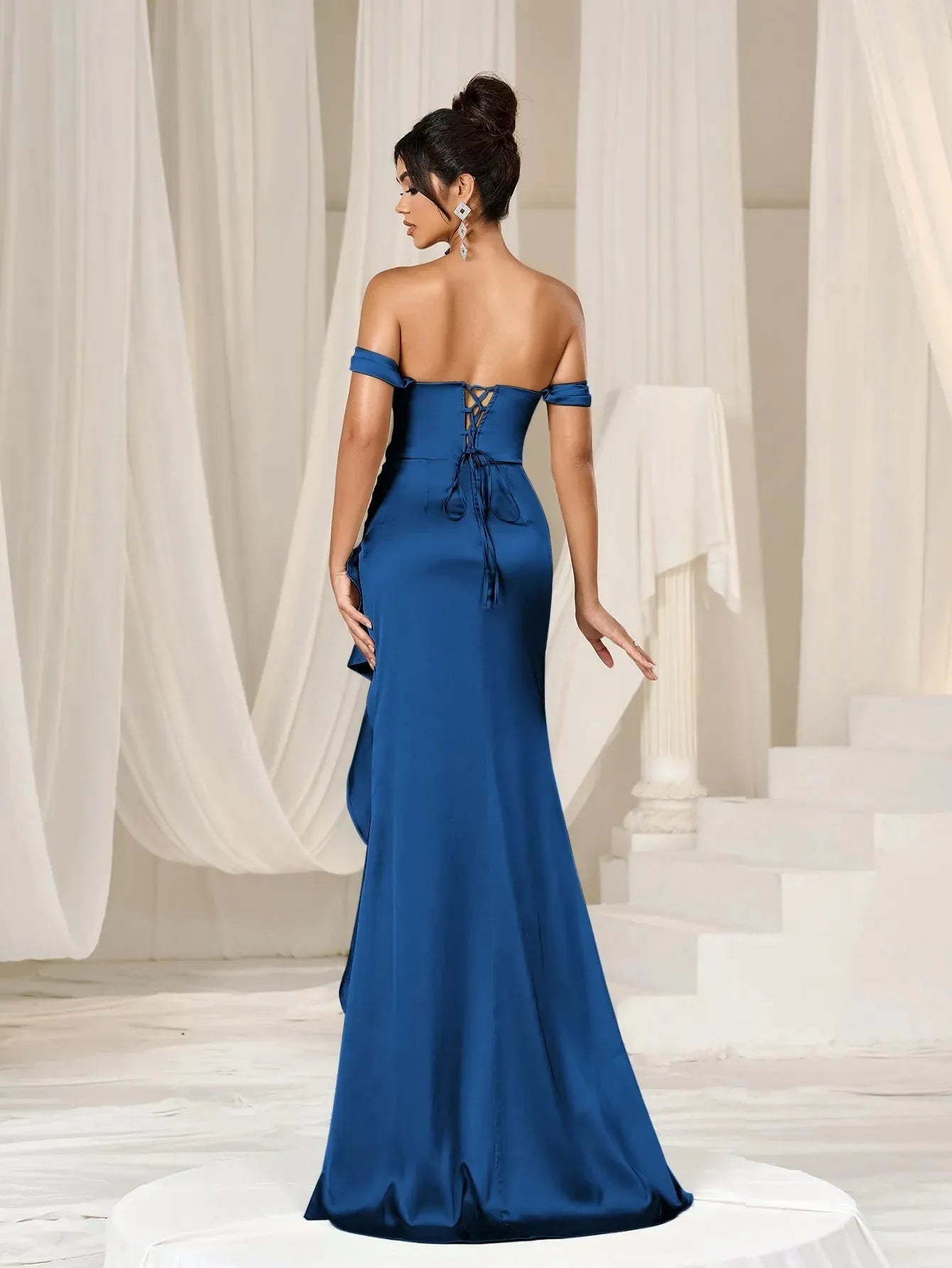 Turn heads with our exquisite satin gown. This enchanting dress features an off-shoulder design that gracefully highlights your neckline and shoulders. The fitted bodice and ruched detailing enhance your figure, while the high-low hemline adds a touch of modern elegance. The back features a lace-up detail, ensuring a perfect fit and adding an extra layer of sophistication.