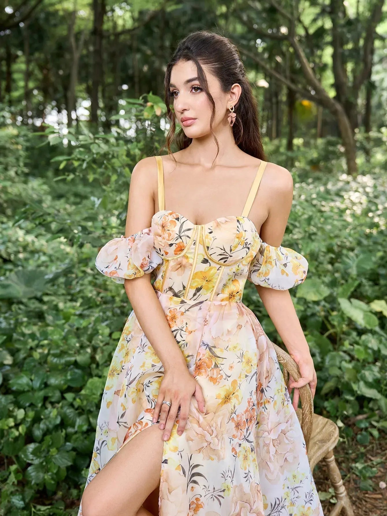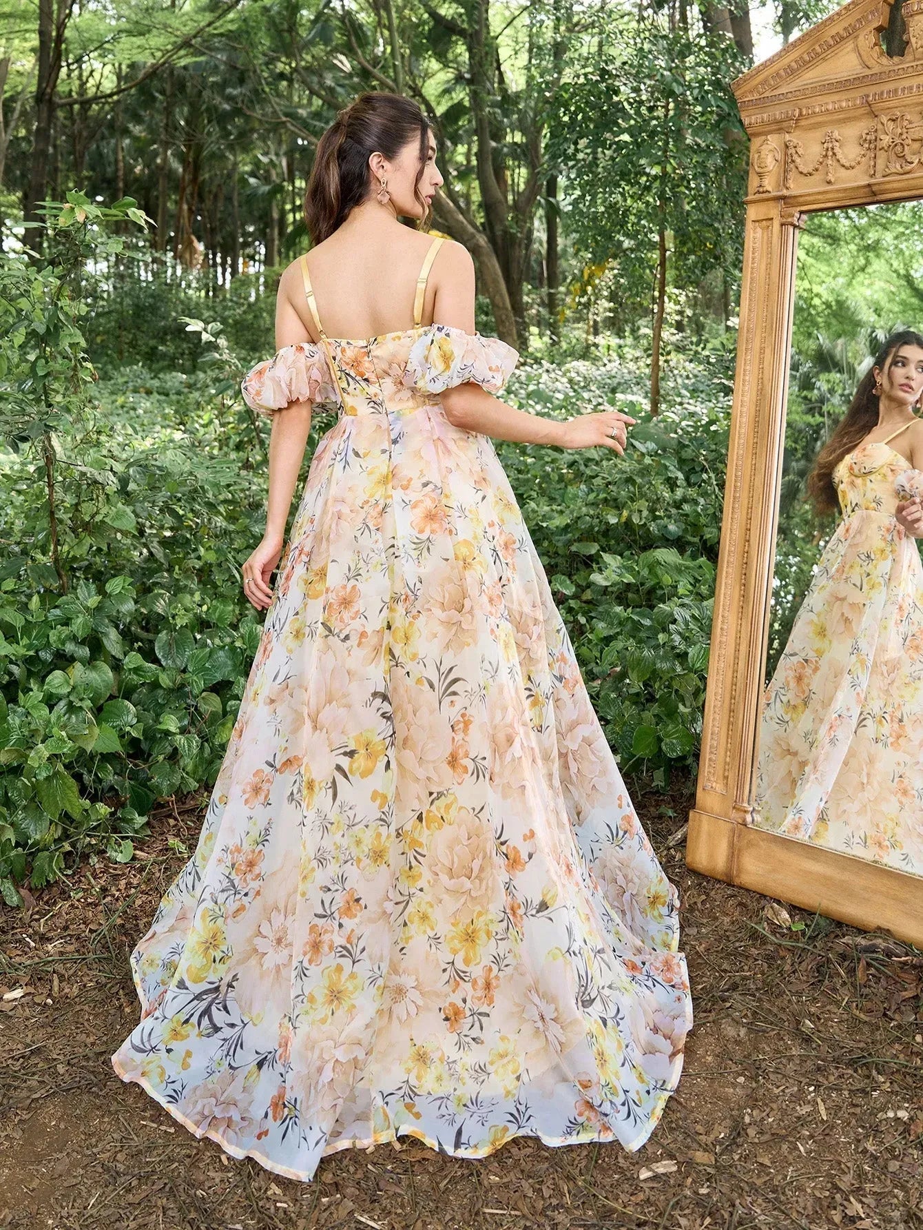 Elegant Off Shoulder Puff Sleeves Floral Printed Organza Slip Prom Dress