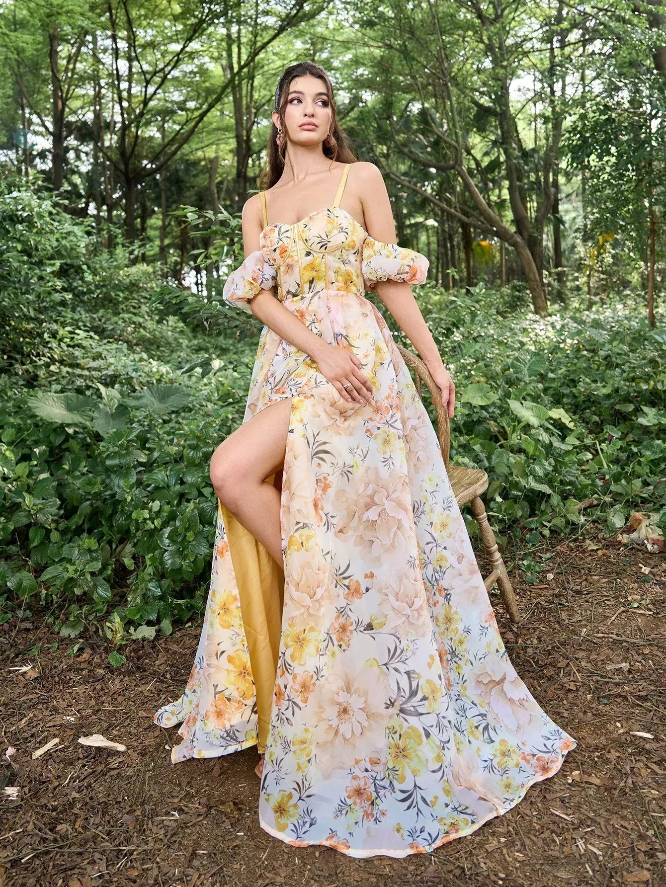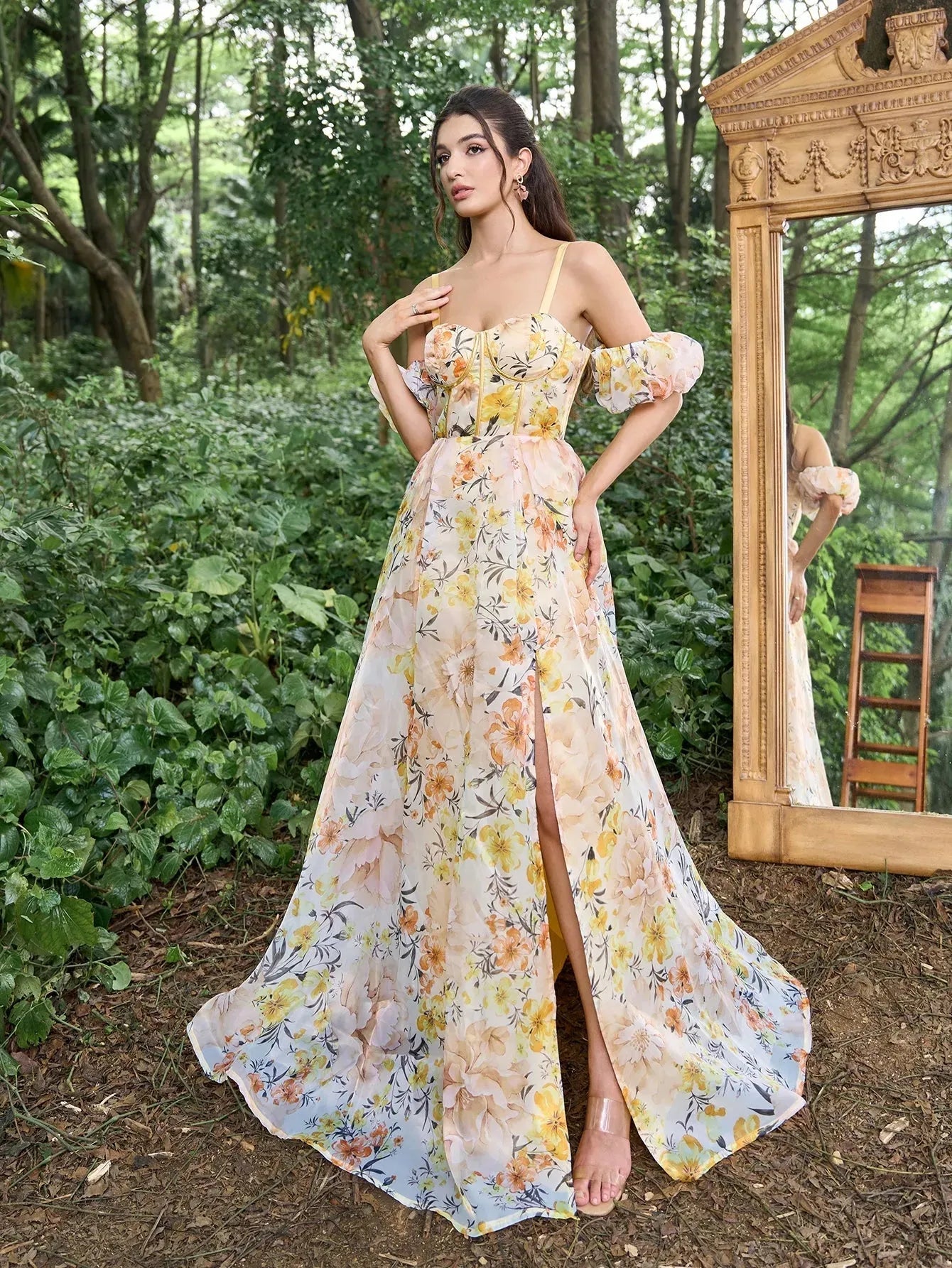 Step into elegance with our floral gown, designed for those who appreciate a touch of romance in their wardrobe. This stunning dress features a sweetheart neckline and delicate off-shoulder puff sleeves, adding a playful yet sophisticated element to the overall look. The fitted bodice is enhanced with a corset-style back, ensuring a perfect fit, while the flowy A-line skirt, adorned with vibrant floral prints, drapes beautifully to create a graceful silhouette. The high slit adds a hint of allure, making this gown a perfect choice for outdoor events or garden weddings.