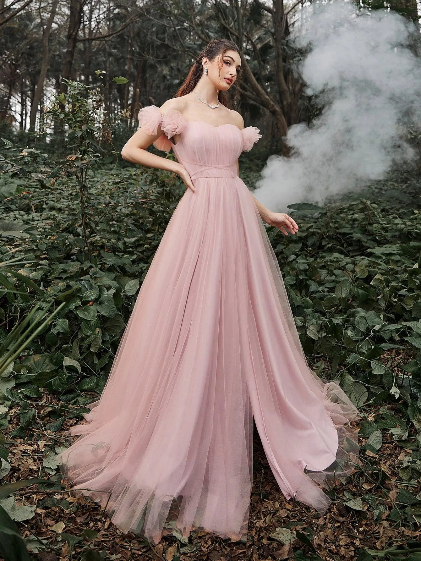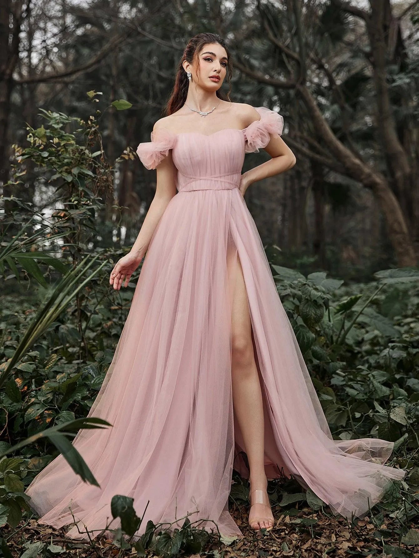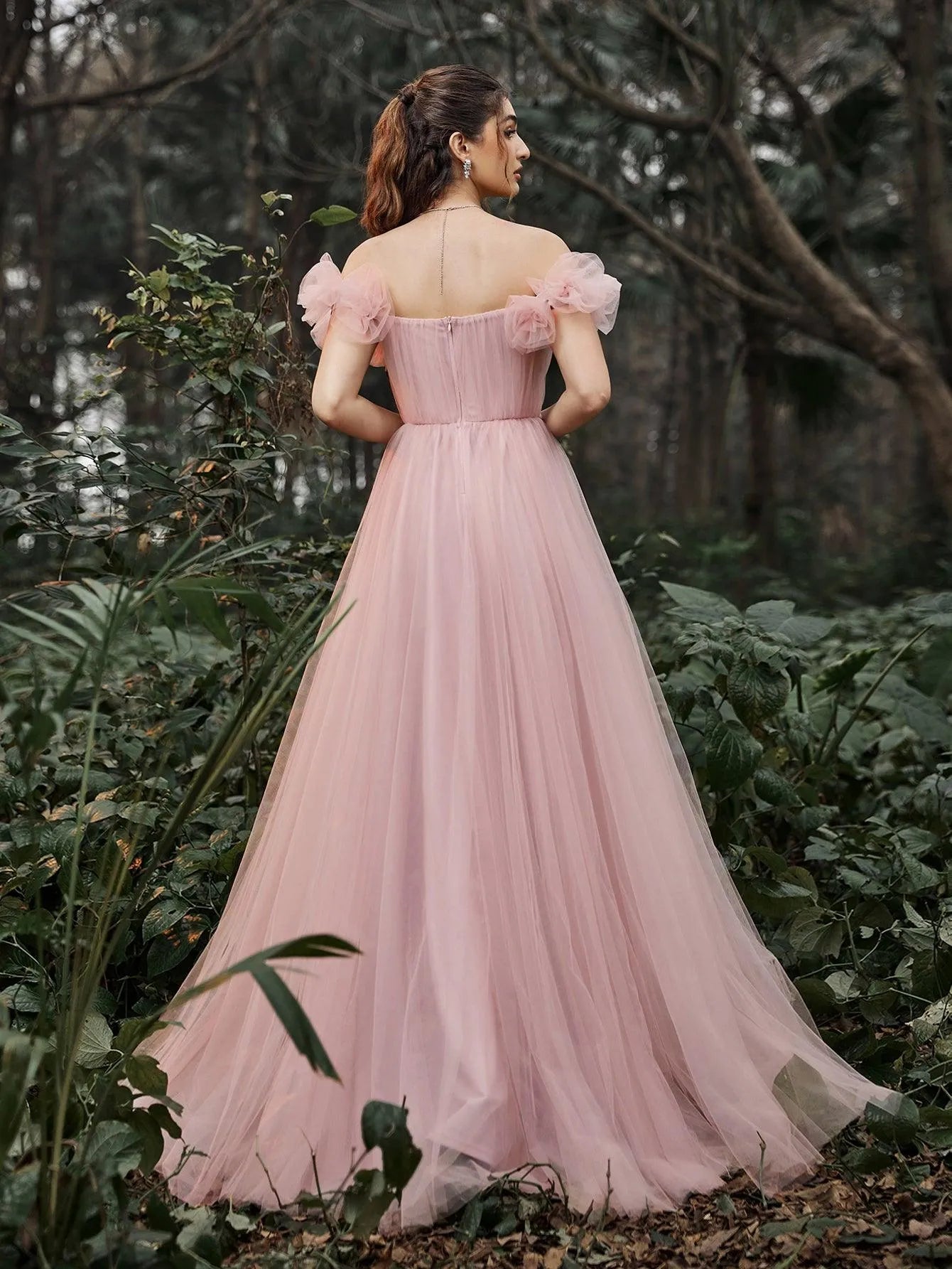 Embrace your inner fairy tale with the off-shoulder gown. This enchanting dress features a delicate off-shoulder neckline with charming tulle puff sleeves, ensuring a whimsical and elegant look. The bodice is fitted to accentuate your silhouette, while the skirt flows gracefully with a soft blush hue and a romantic side slit. Perfect for making a grand entrance at weddings, garden parties, and other special occasions.