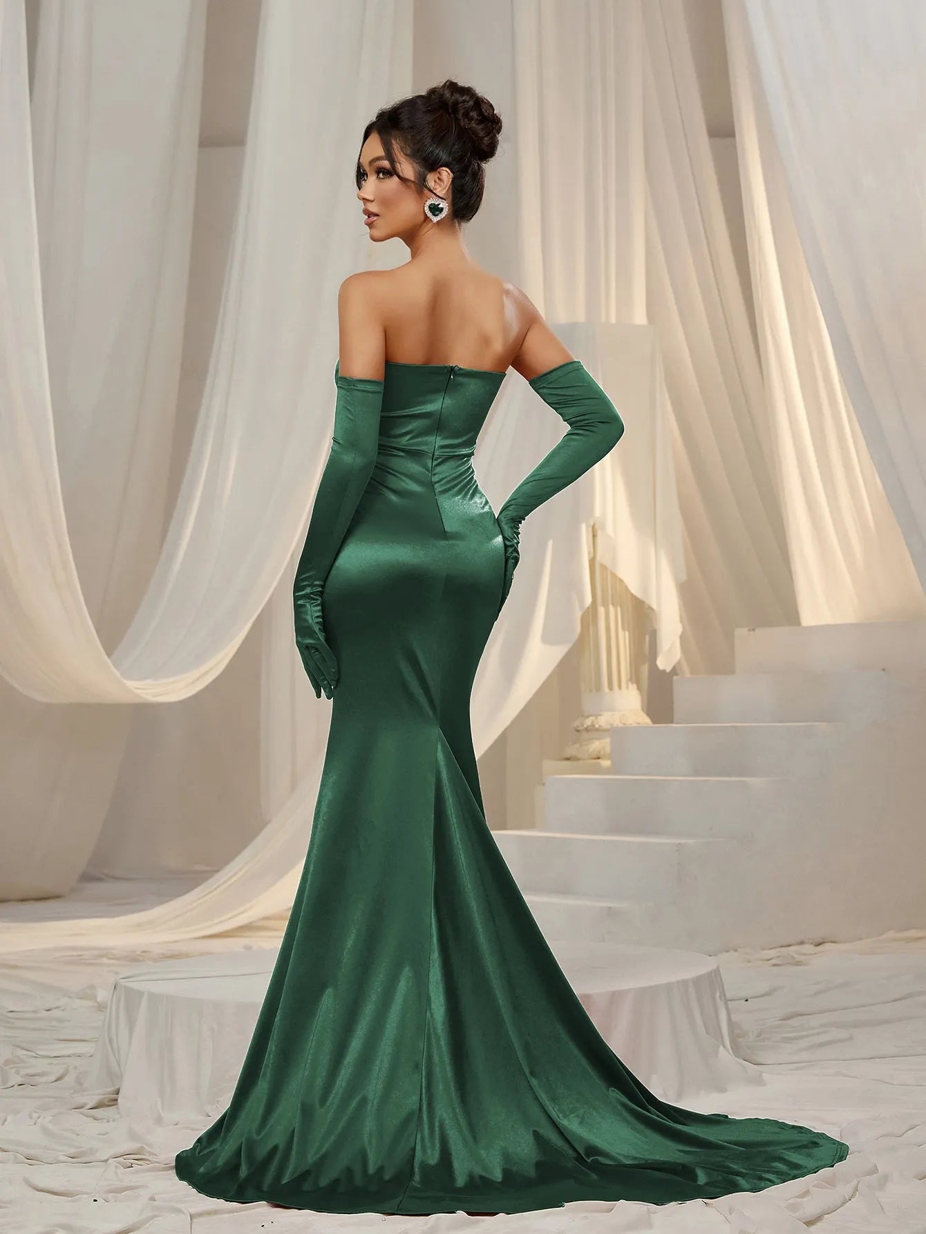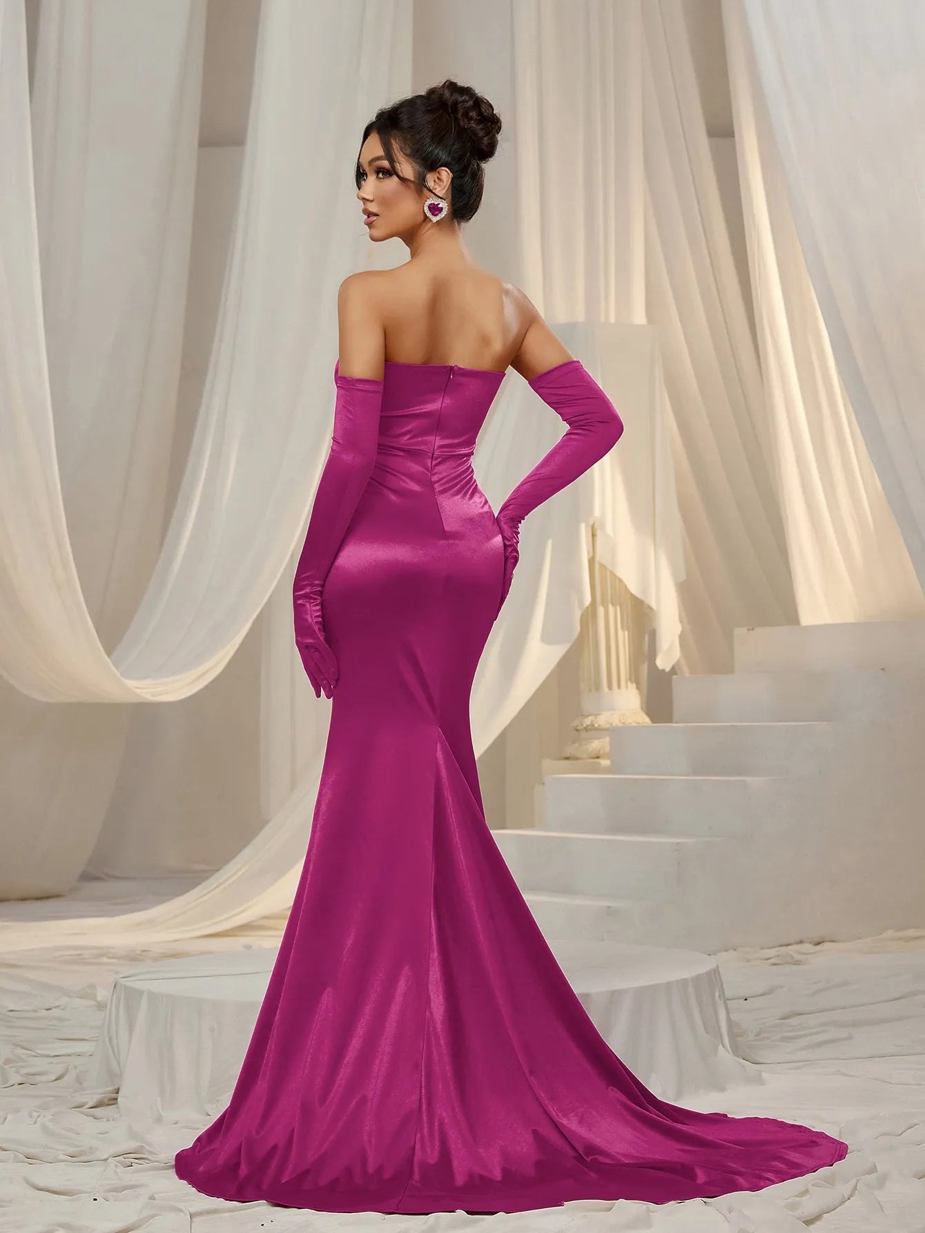 Turn heads with this ravishing satin gown, designed for ultimate glamour and confidence. The gown features a corset-style bodice that accentuates your curves and a daring thigh-high slit for added allure. Complete with matching opera gloves, this ensemble is the epitome of old-Hollywood elegance. The fitted silhouette flows into a subtle train, creating a dramatic and timeless look.