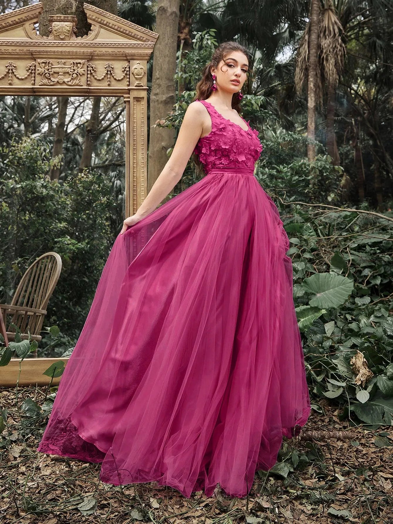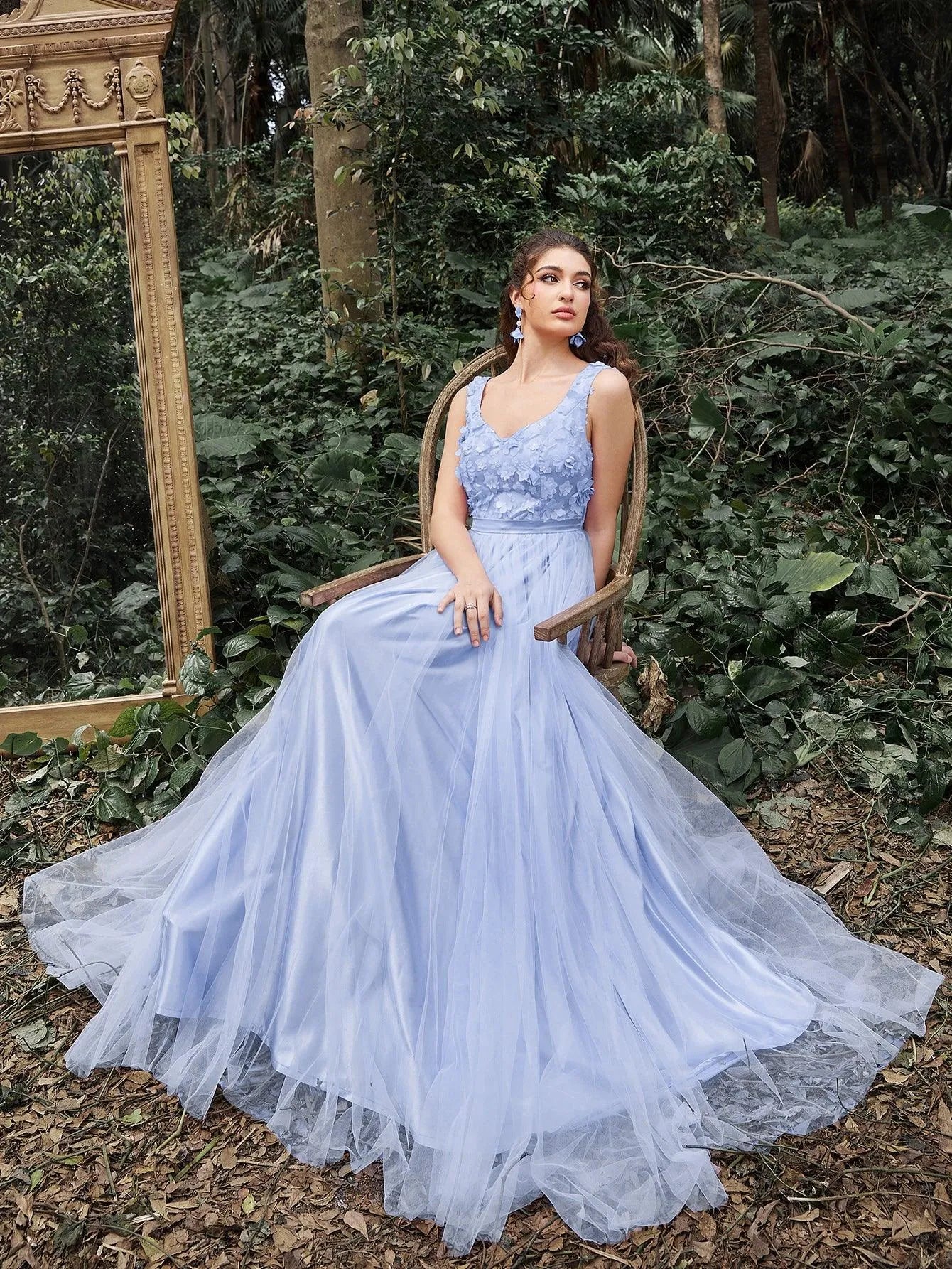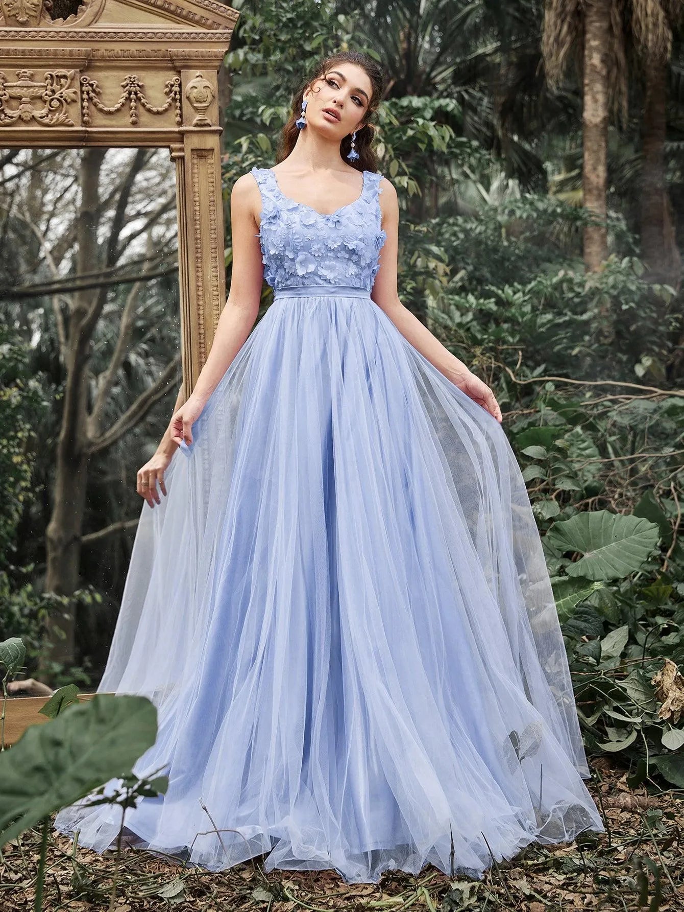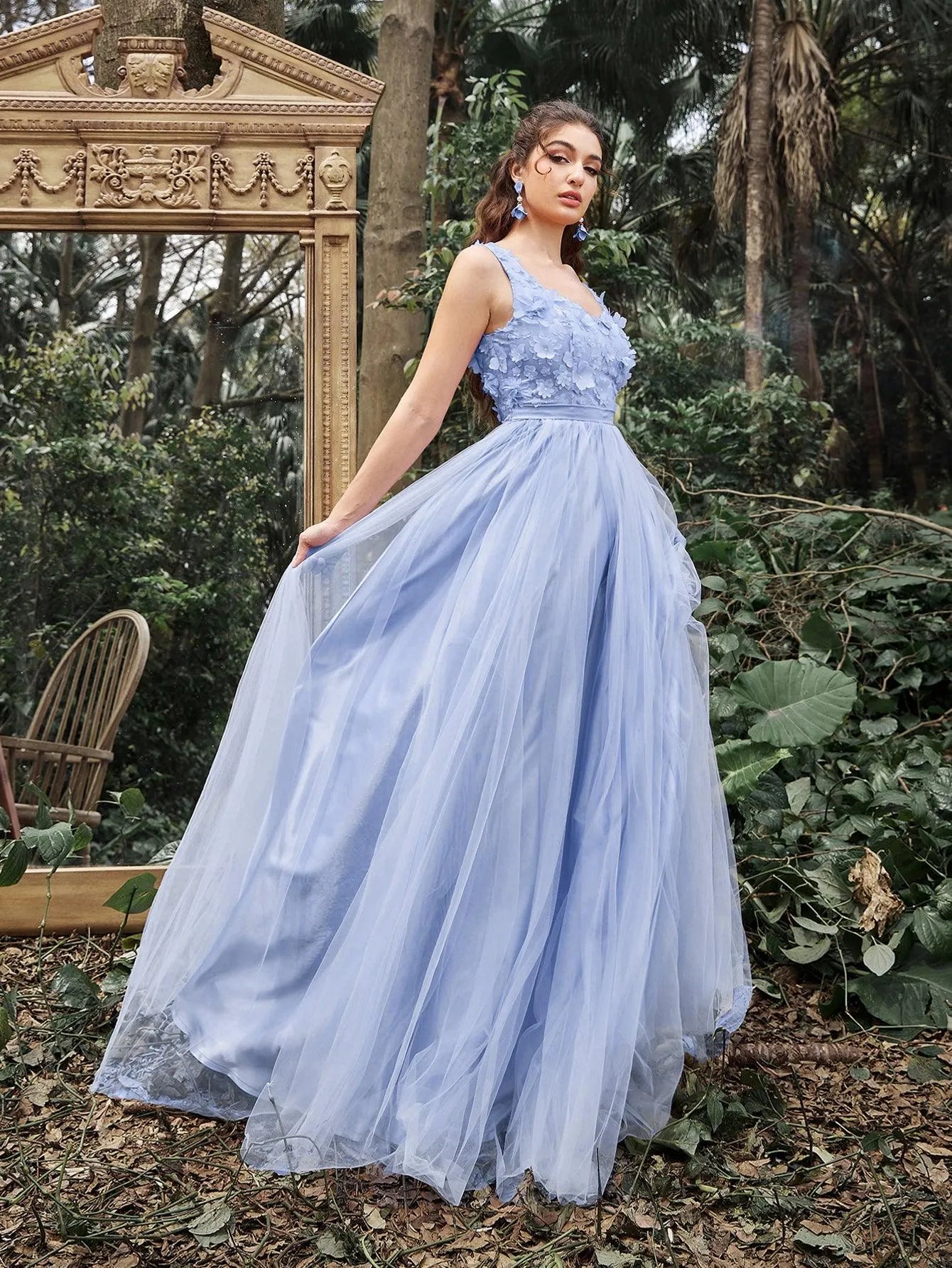 Float like a dream in this enchanting floral evening gown. Crafted from delicate tulle, this gown features a bodice adorned with intricate floral appliques, adding a touch of whimsical charm. The scoop neckline and sleeveless design provide a classic and elegant look, perfect for any special occasion.The fitted bodice flows into a full, flowing skirt that moves gracefully with every step, creating a fairy-tale silhouette. The lace-up back detail ensures a perfect fit while adding an element of romance to the overall design. The soft lilac hue evokes a sense of calm and beauty, making this gown ideal for garden parties, proms, or weddings.