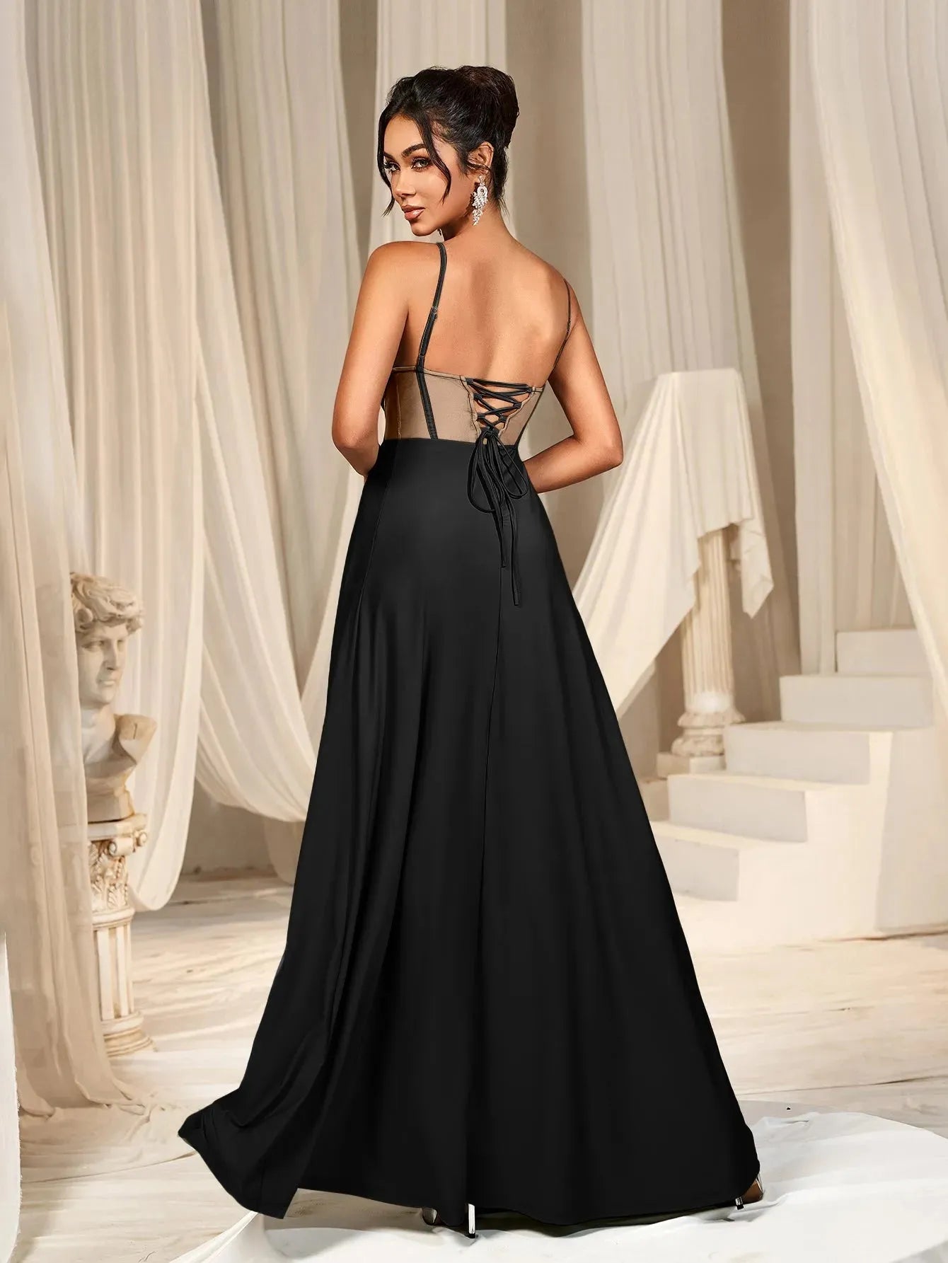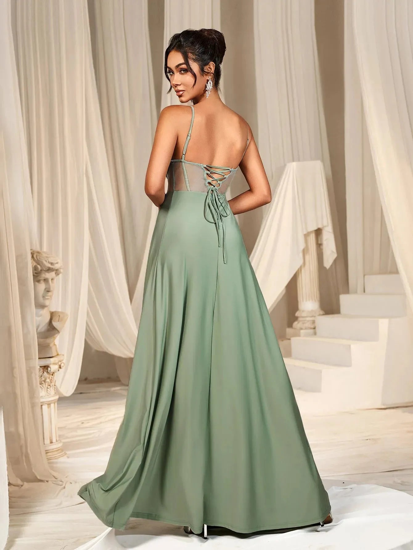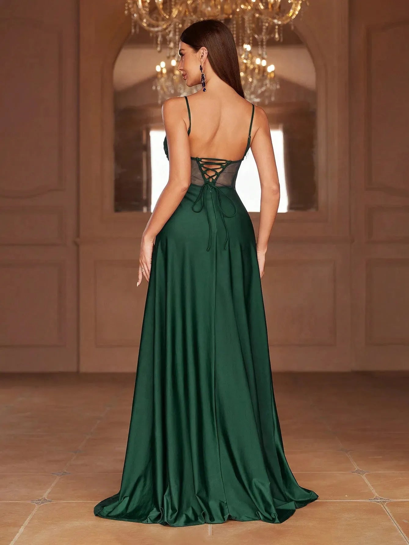 Embrace elegance with our enchanting gown, perfect for any special occasion. This stunning dress features a fitted bodice with delicate spaghetti straps, complemented by sheer mesh panels that add a touch of modern allure. The lace-up back ensures a perfect fit, while the flowing A-line skirt with a high slit adds grace and sophistication to your look.