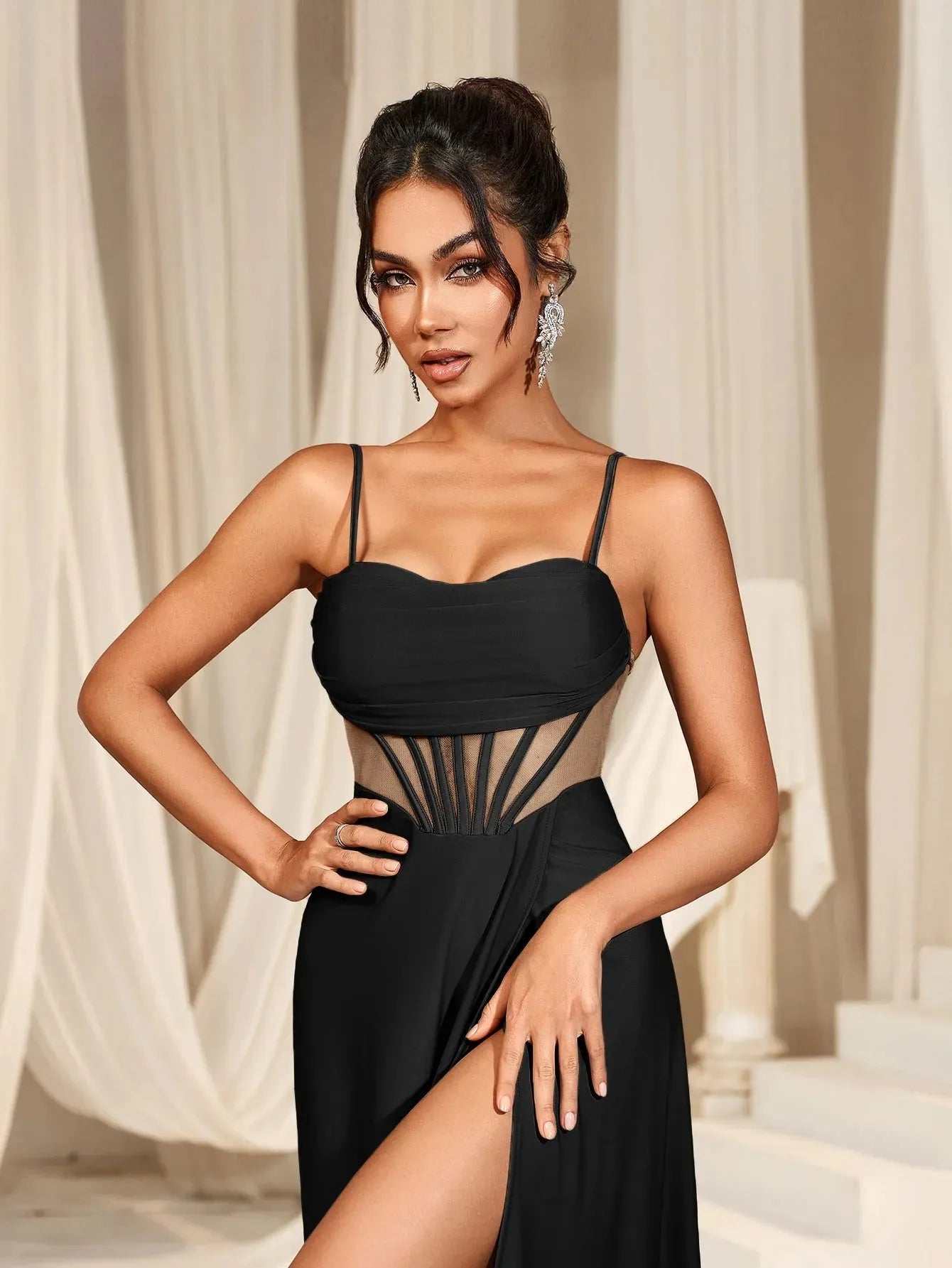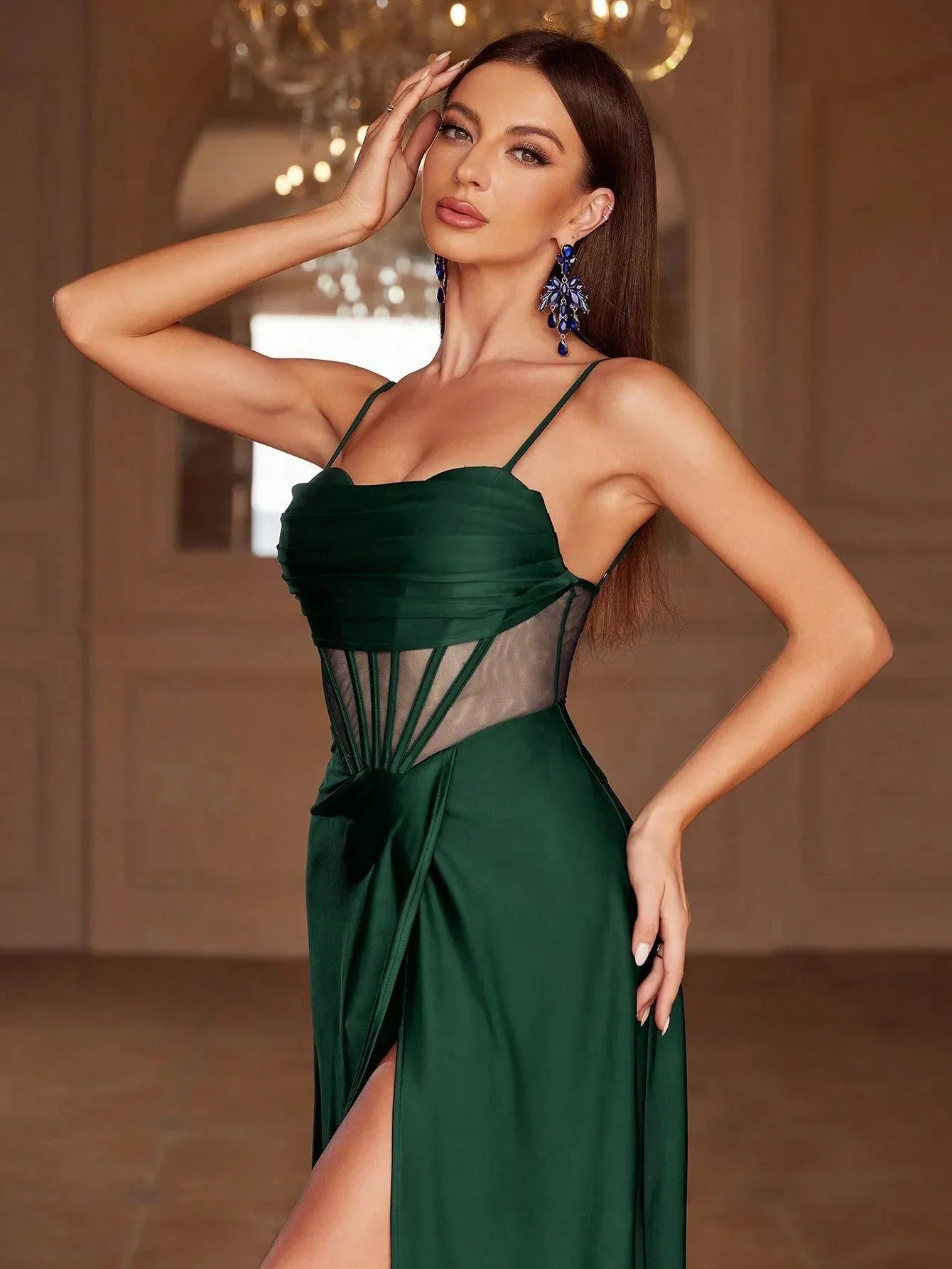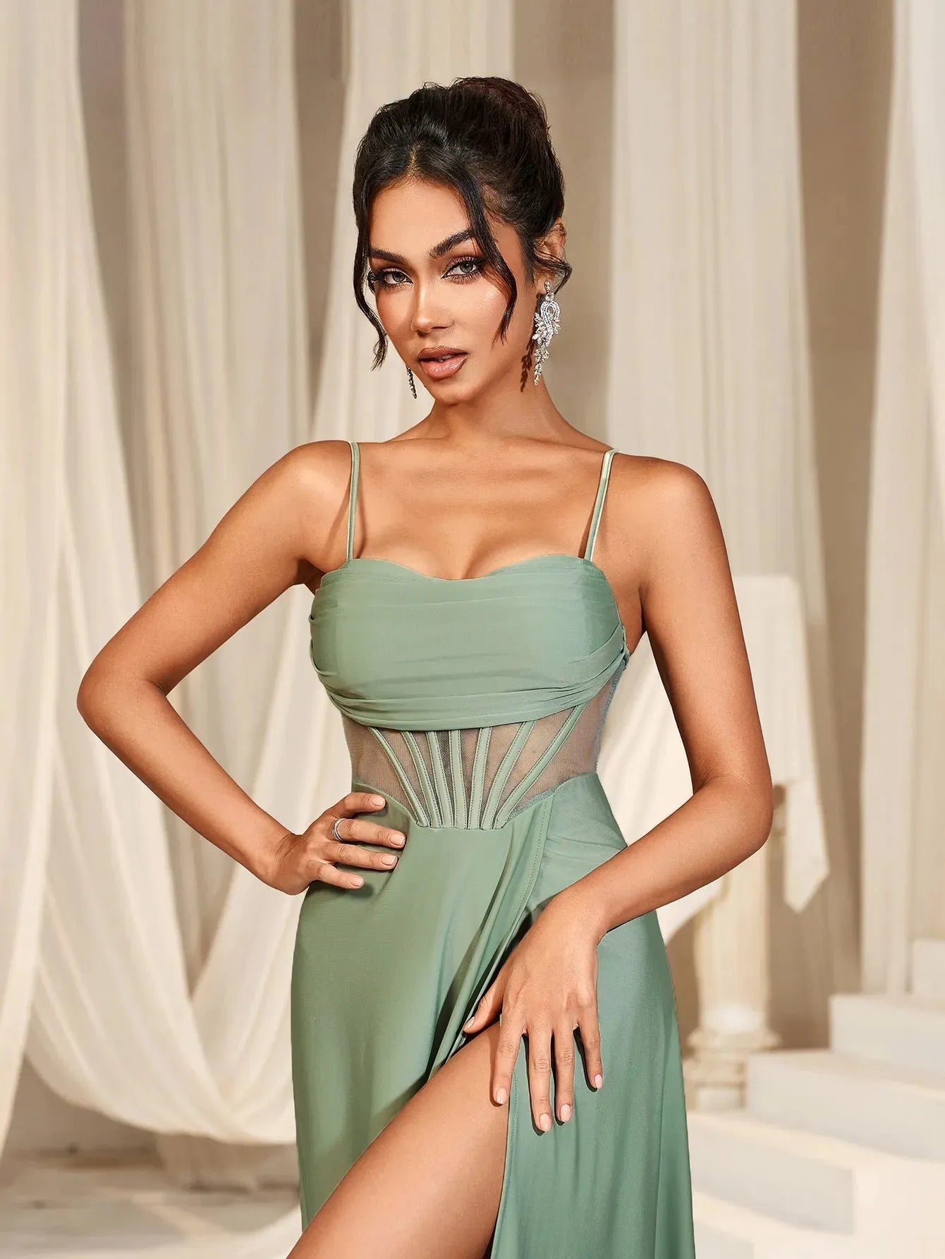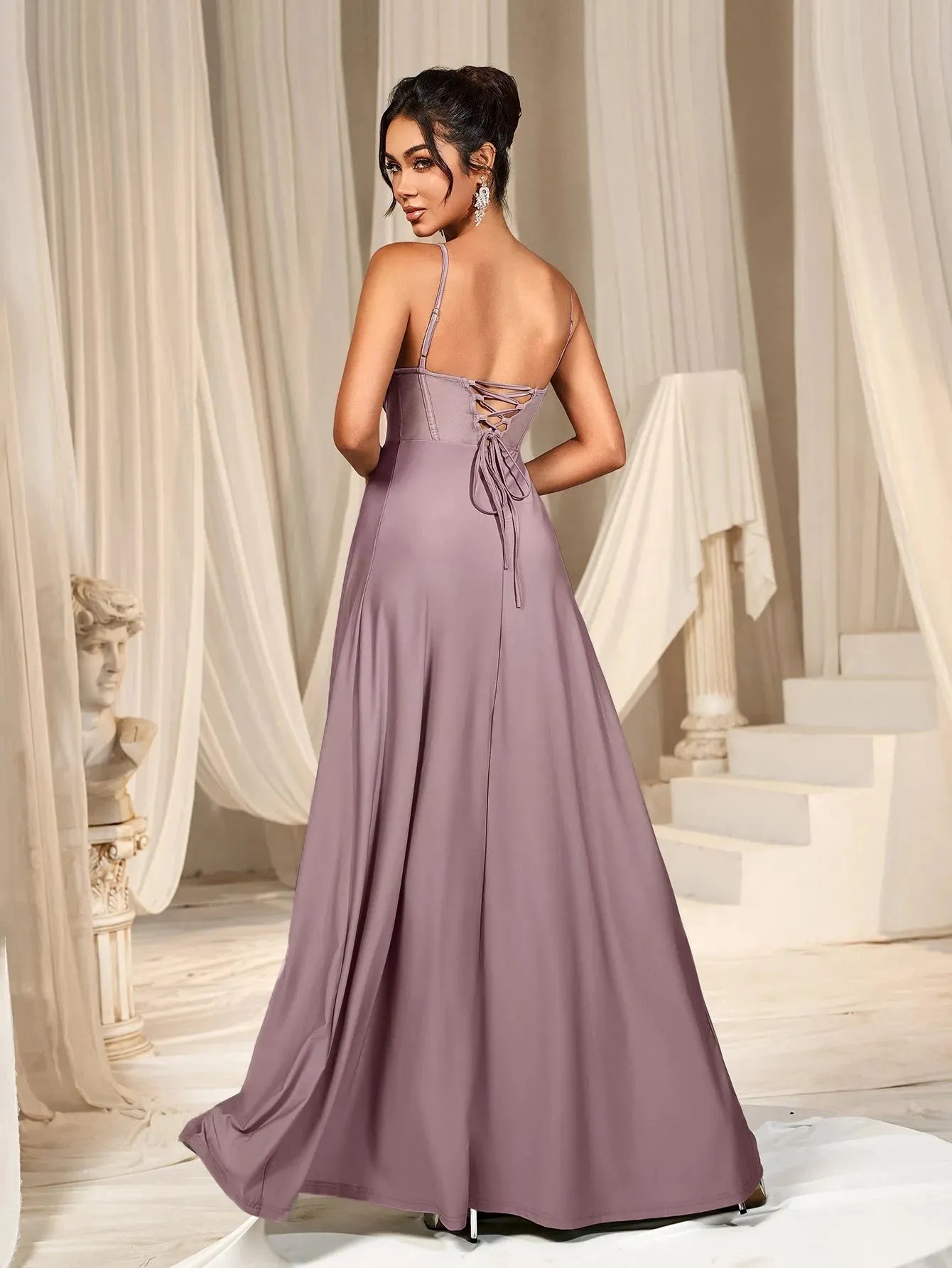 Embrace elegance with our enchanting gown, perfect for any special occasion. This stunning dress features a fitted bodice with delicate spaghetti straps, complemented by sheer mesh panels that add a touch of modern allure. The lace-up back ensures a perfect fit, while the flowing A-line skirt with a high slit adds grace and sophistication to your look.