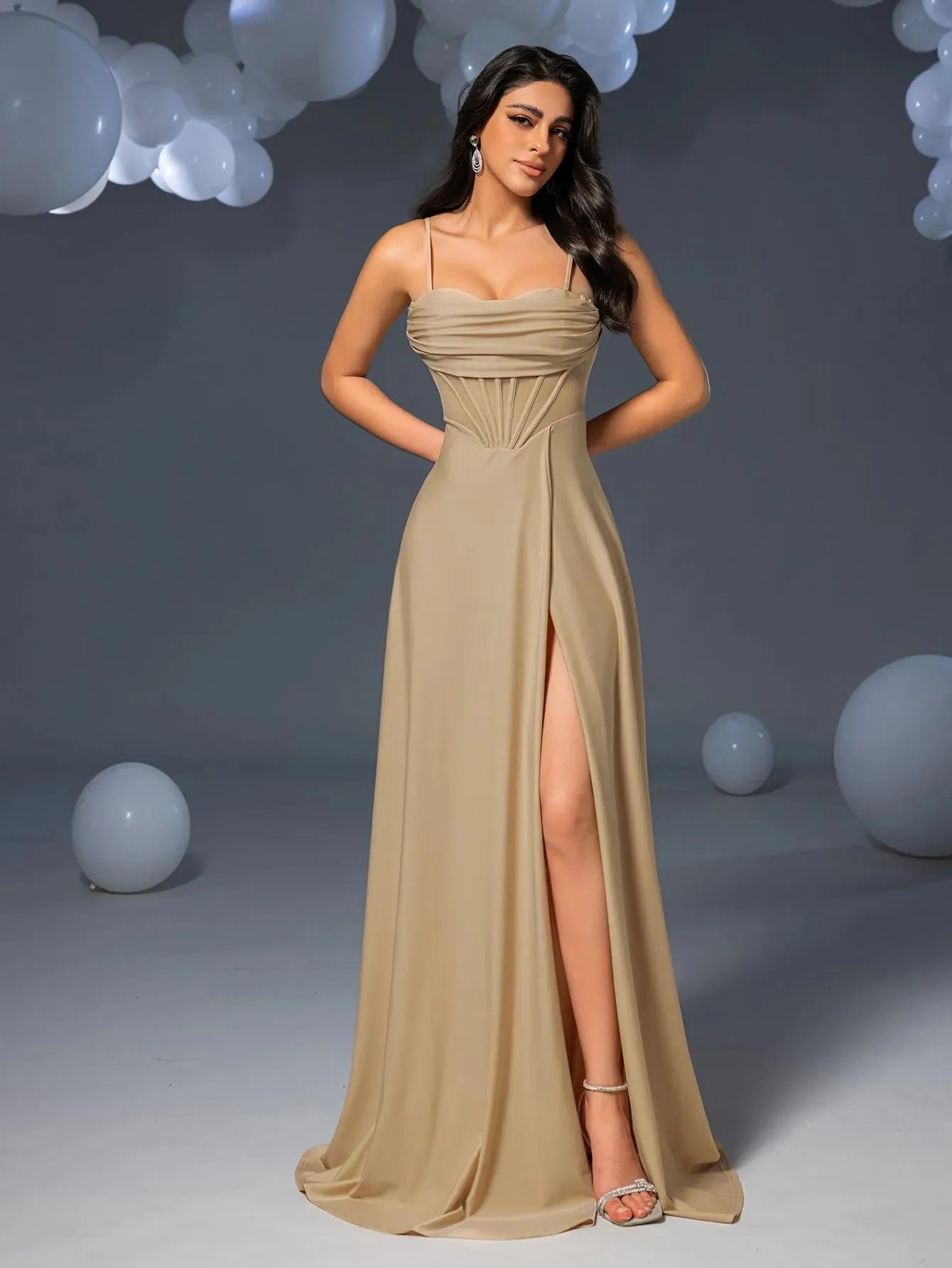 - Neckline: Sweetheart with spaghetti straps
