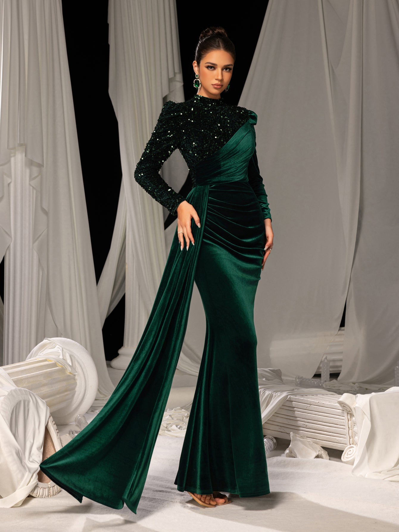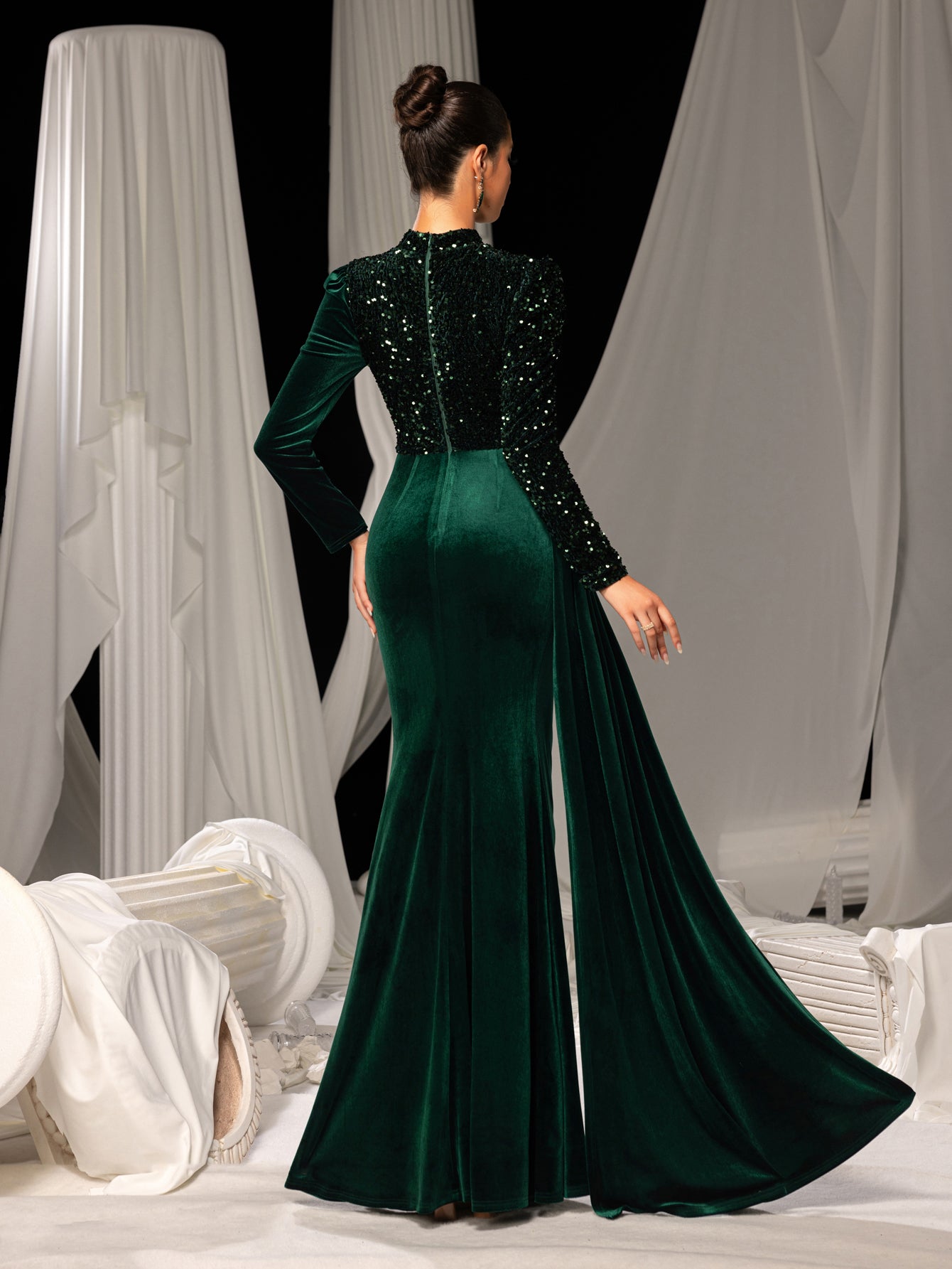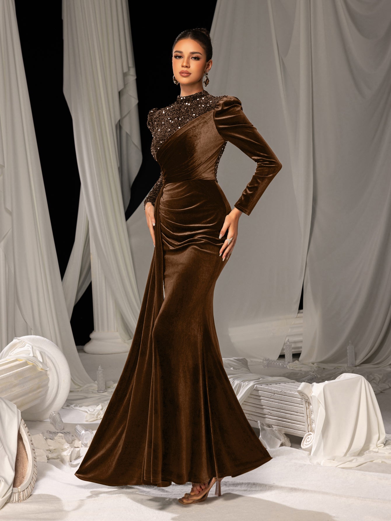 Elegant Velvet Evening Gown with Sequin Detail & Mermaid Silhouette – Luxury Bridal Wear for Weddings or High-End Events, XS-XL