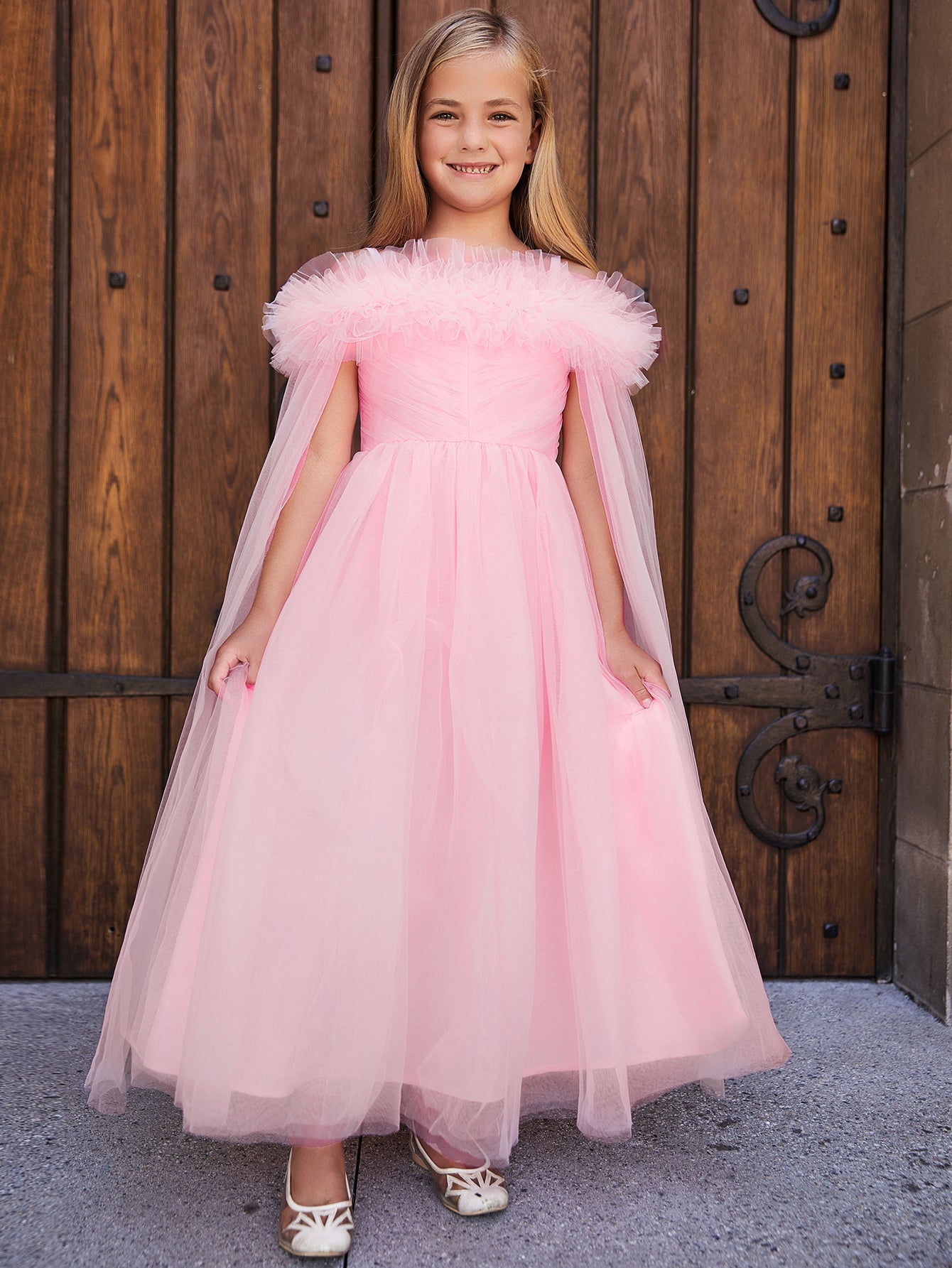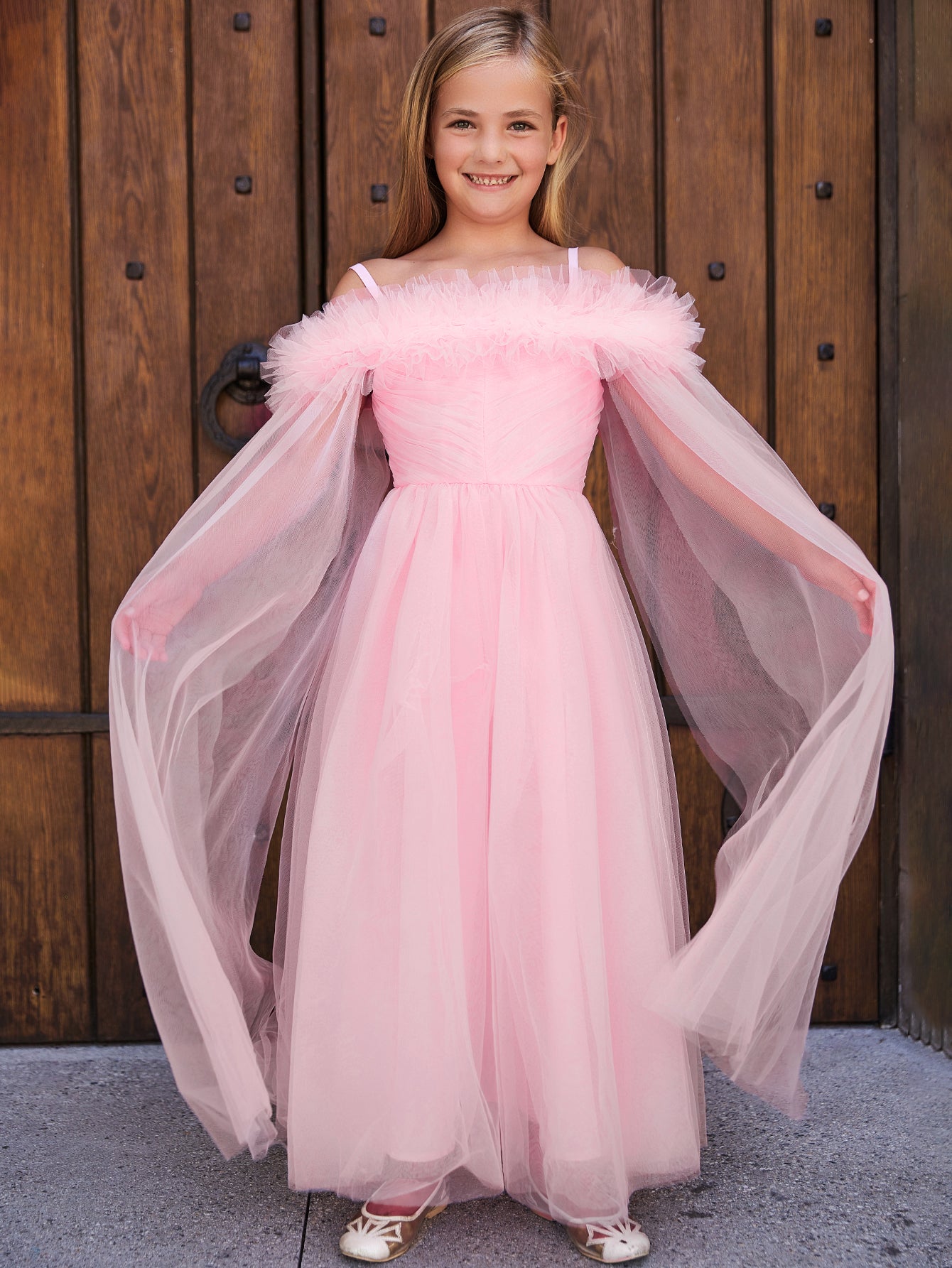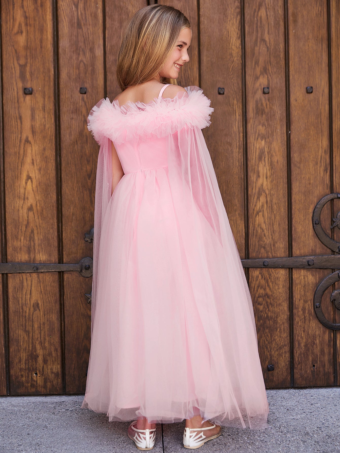 Girl's Ruffle Trim Cold Shoulder Cloak Sleeve Mesh A Line Dress
