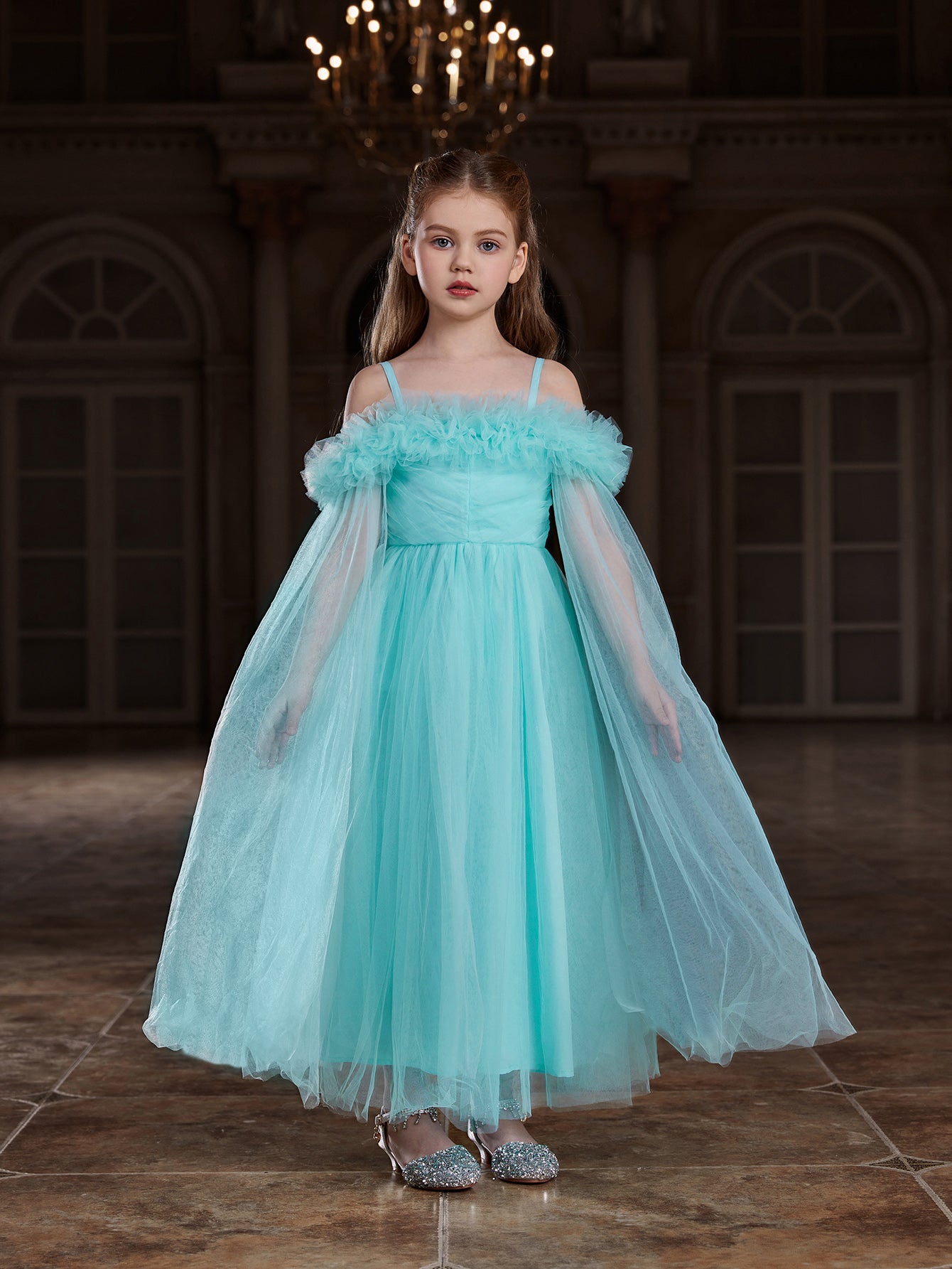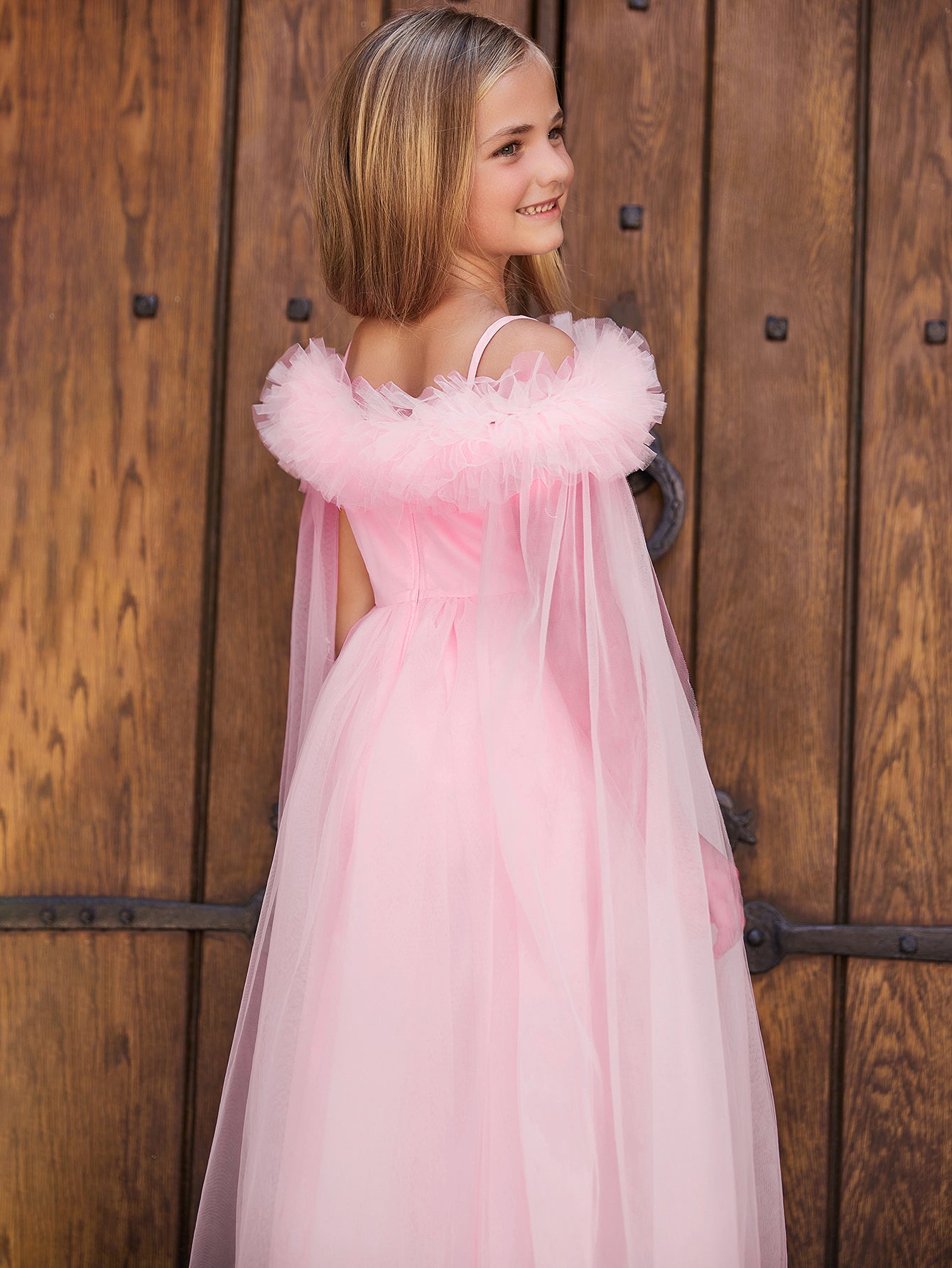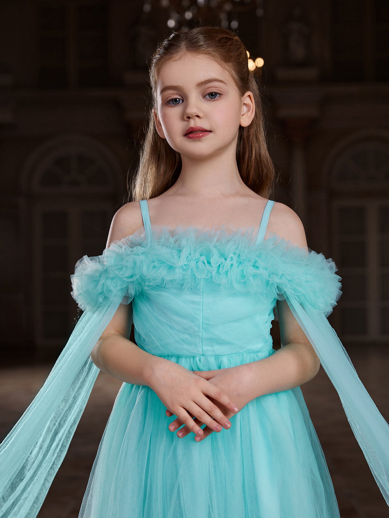 Girl's Ruffle Trim Cold Shoulder Cloak Sleeve Mesh A Line Dress