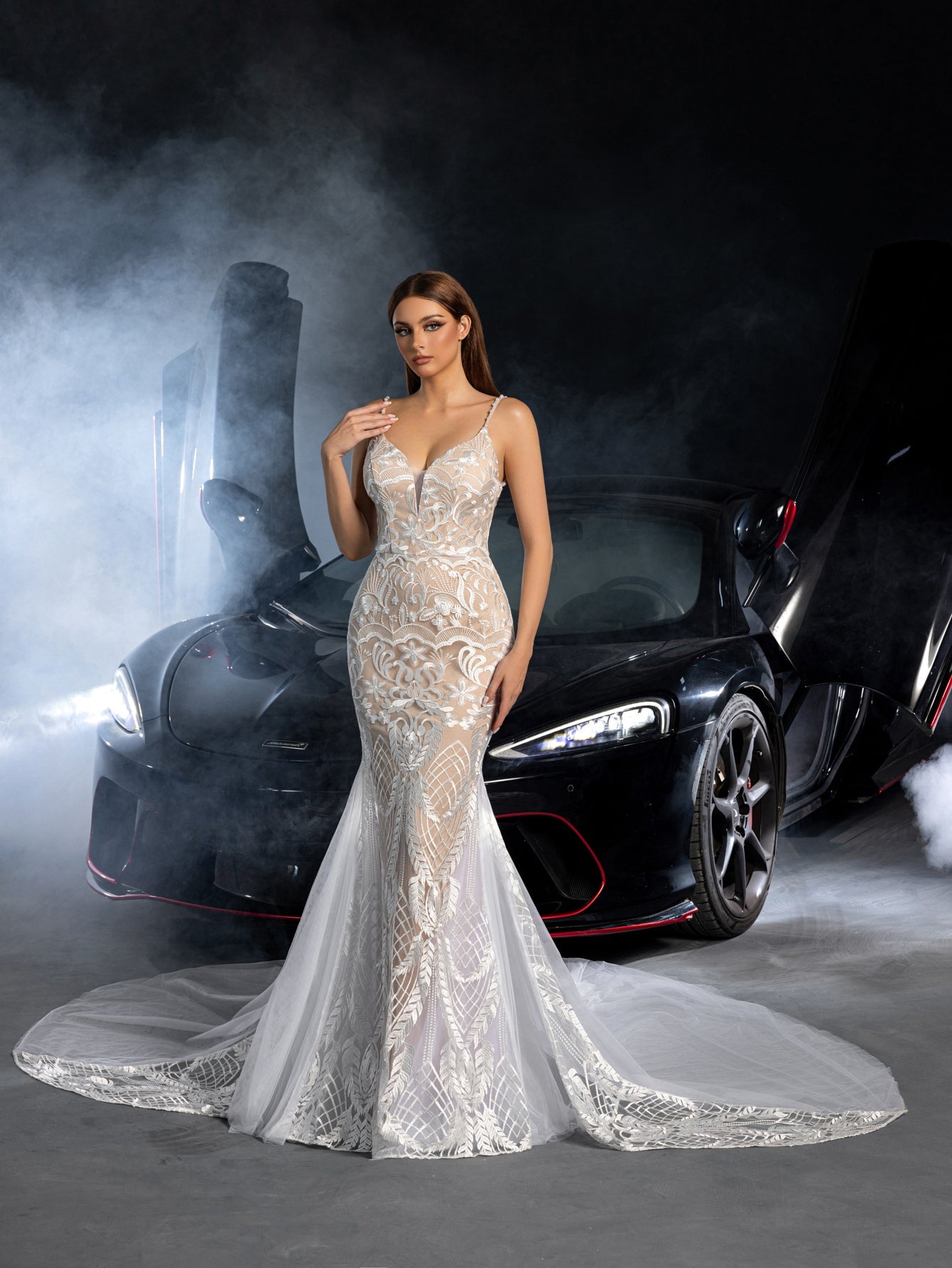 Elevate your special day with our exquisite wedding dress, crafted to embody the essence of bridal elegance. The gown features a plunging sweetheart neckline that accentuates your décolletage, paired with a fitted silhouette that gracefully follows your figure, ensuring a flattering and alluring look. The intricate lace fabric, adorned with delicate beadwork, adds a touch of luxury and sophistication, while the flowing tulle skirt cascades into a dramatic train, perfect for making a grand entrance.