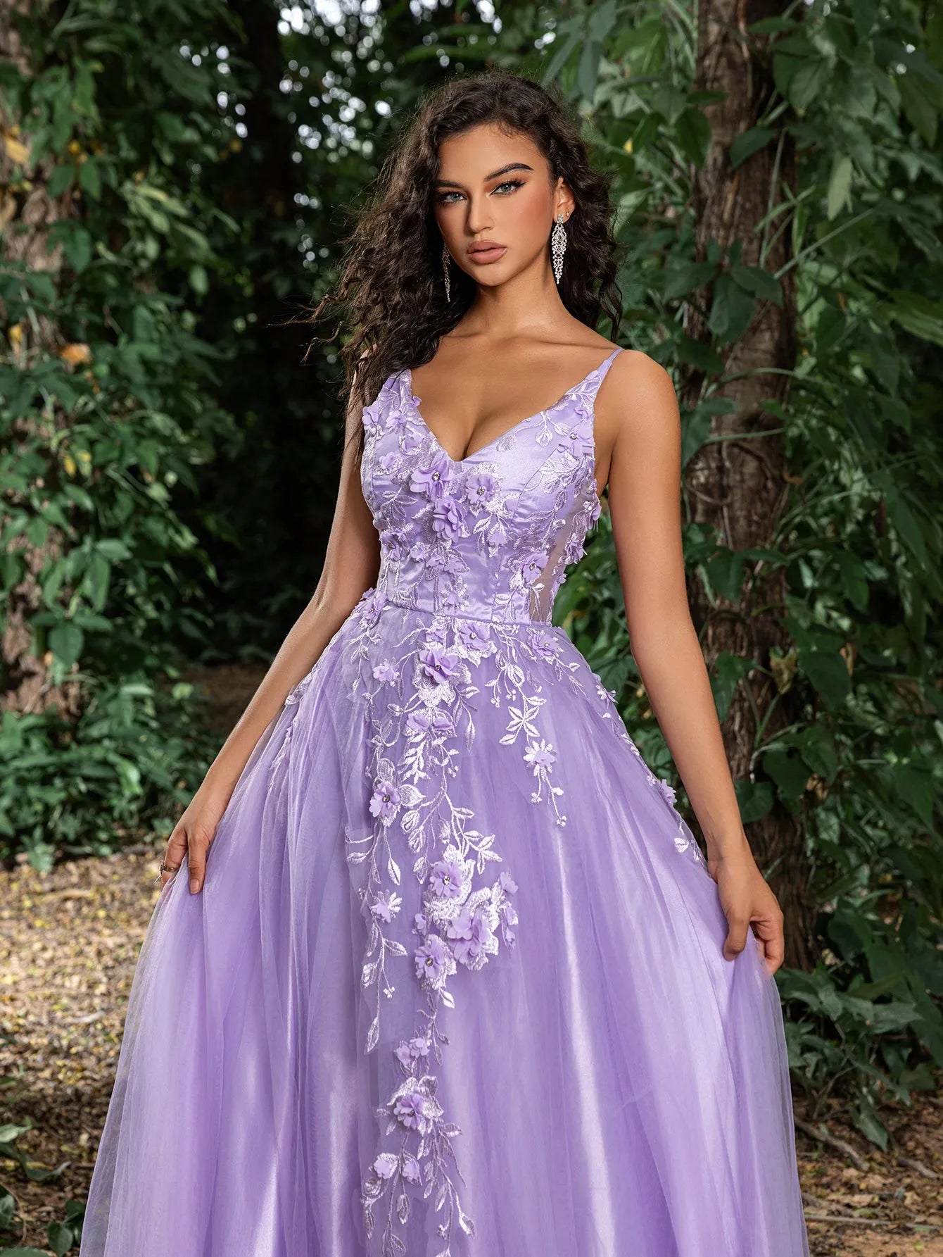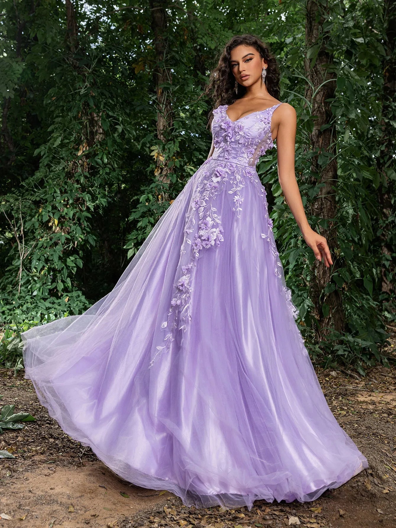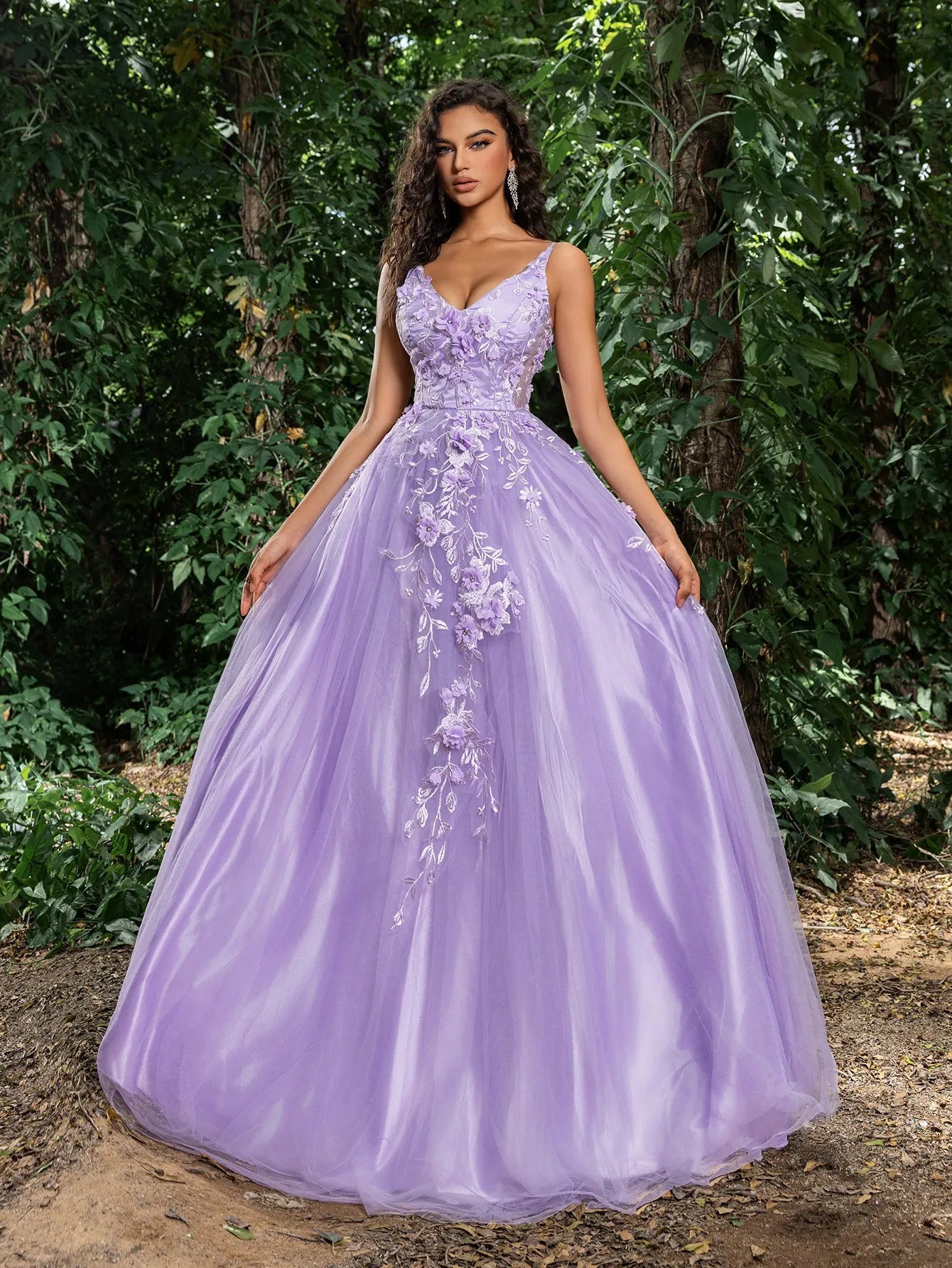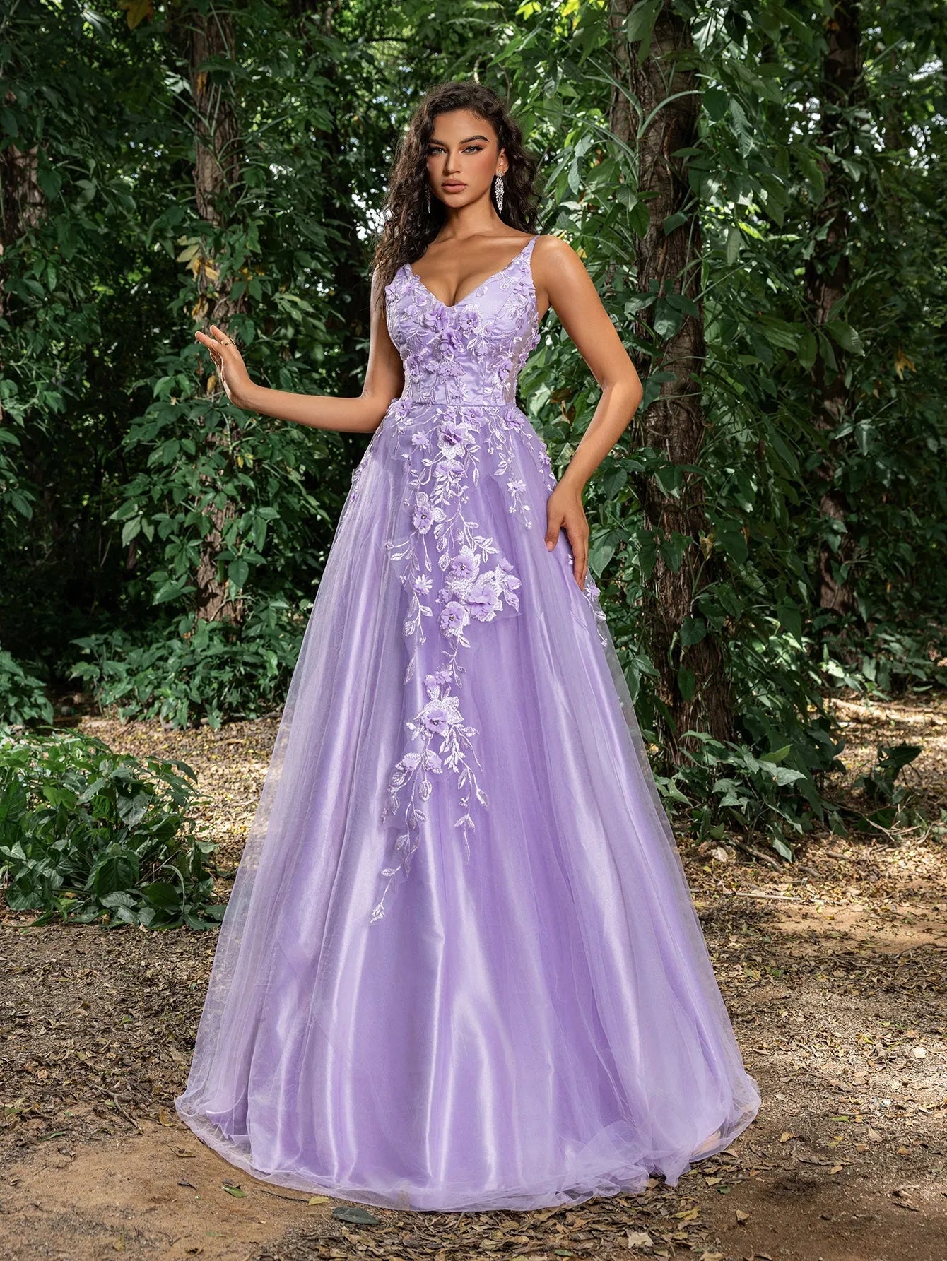 Capture the essence of elegance with this exquisite floral A-Line gown. This glamorous dress features a delicate lace-up back with thin shoulder straps, ensuring a perfect fit and highlighting your silhouette. The bodice is embellished with intricate floral appliqués, creating a romantic and enchanting effect. The gown flows into a graceful A-line silhouette with a tulle skirt, making it perfect for making a grand entrance at weddings, evening galas, and other special occasions.
