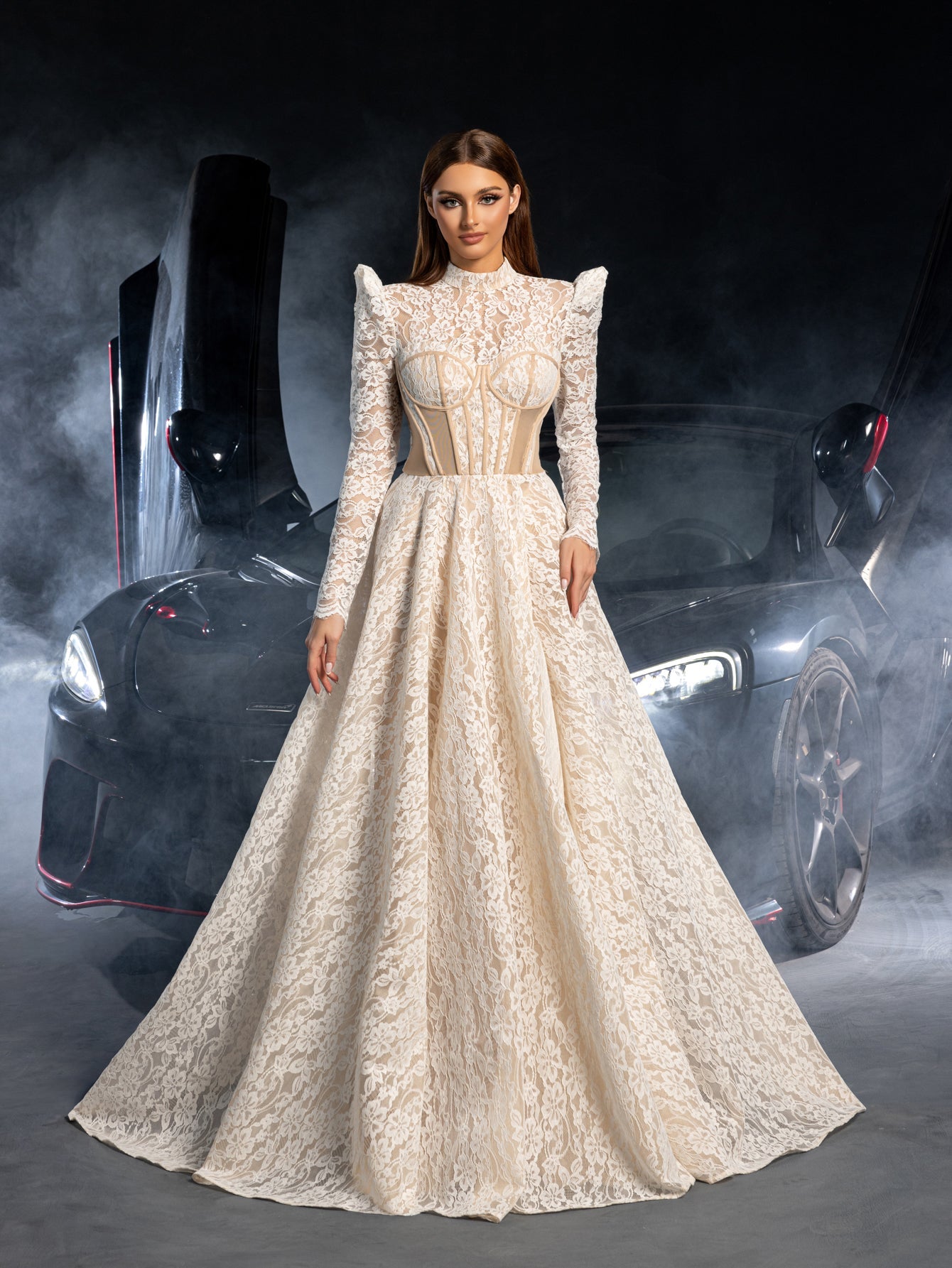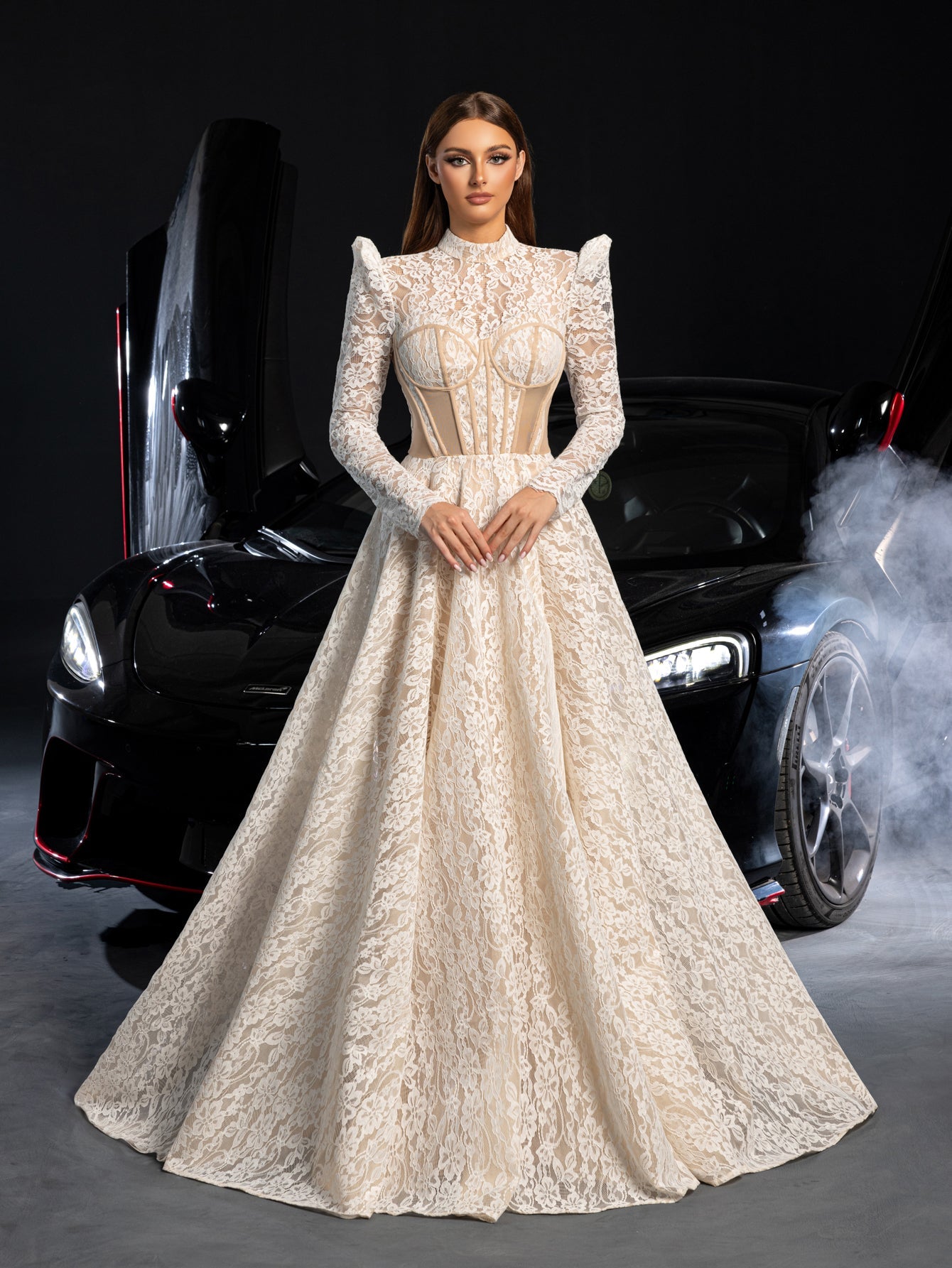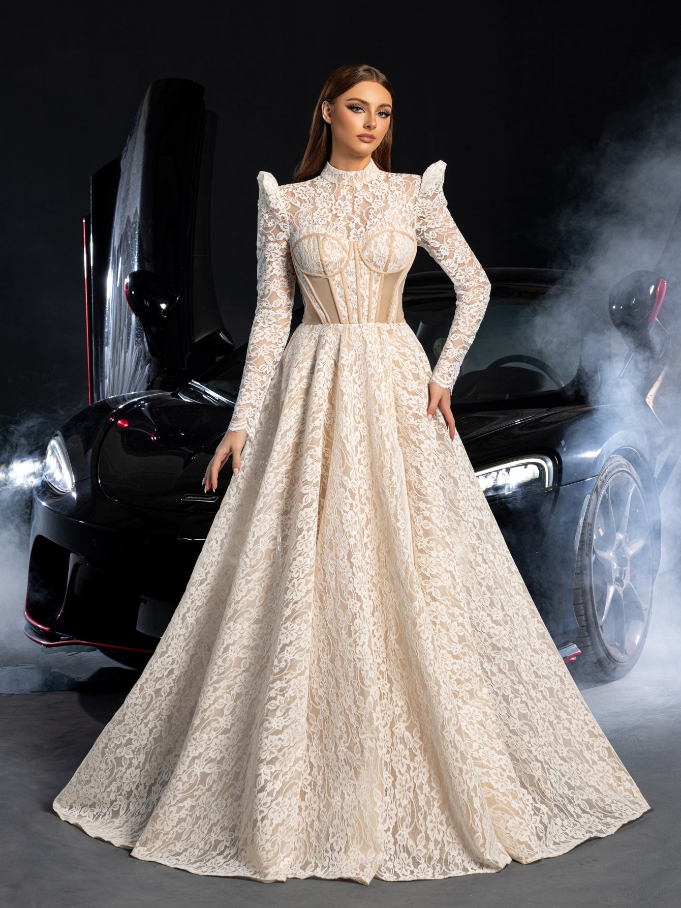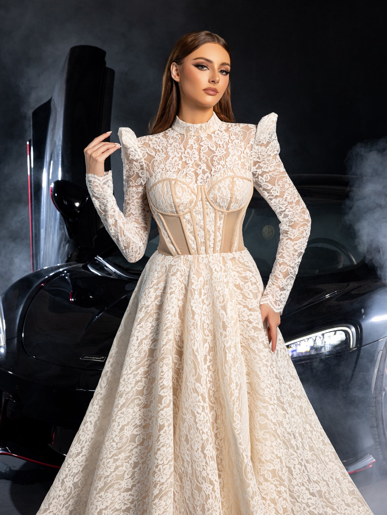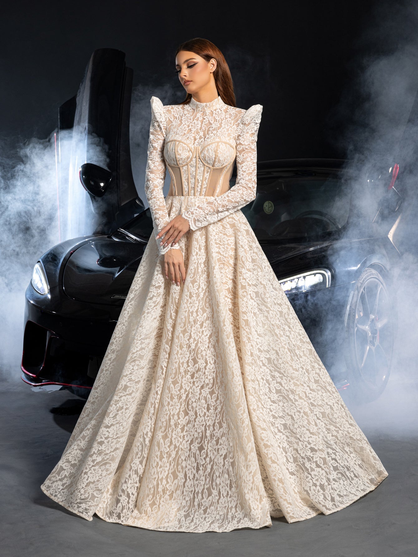Celebrate your special day in unparalleled elegance with our stunning wedding dress. Designed to accentuate your beauty, this gown features a high neckline and long sleeves, offering a touch of classic sophistication. The intricate lace fabric provides a luxurious texture, while the fitted bodice and full skirt create a dramatic silhouette that flows gracefully to the floor.