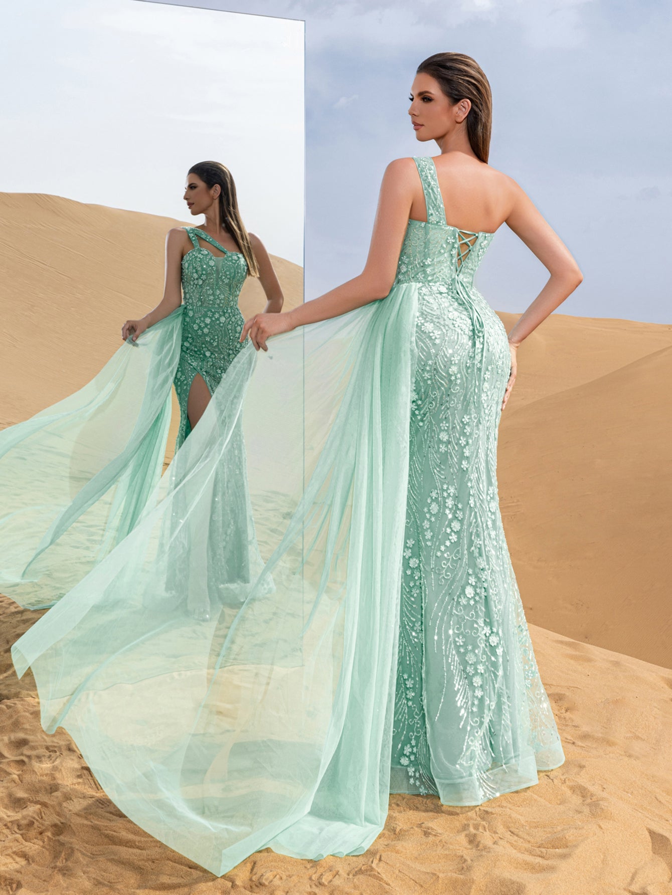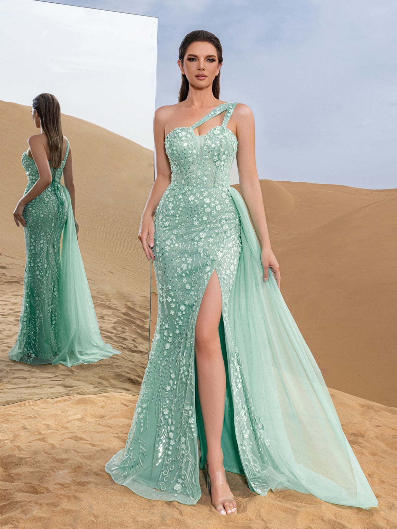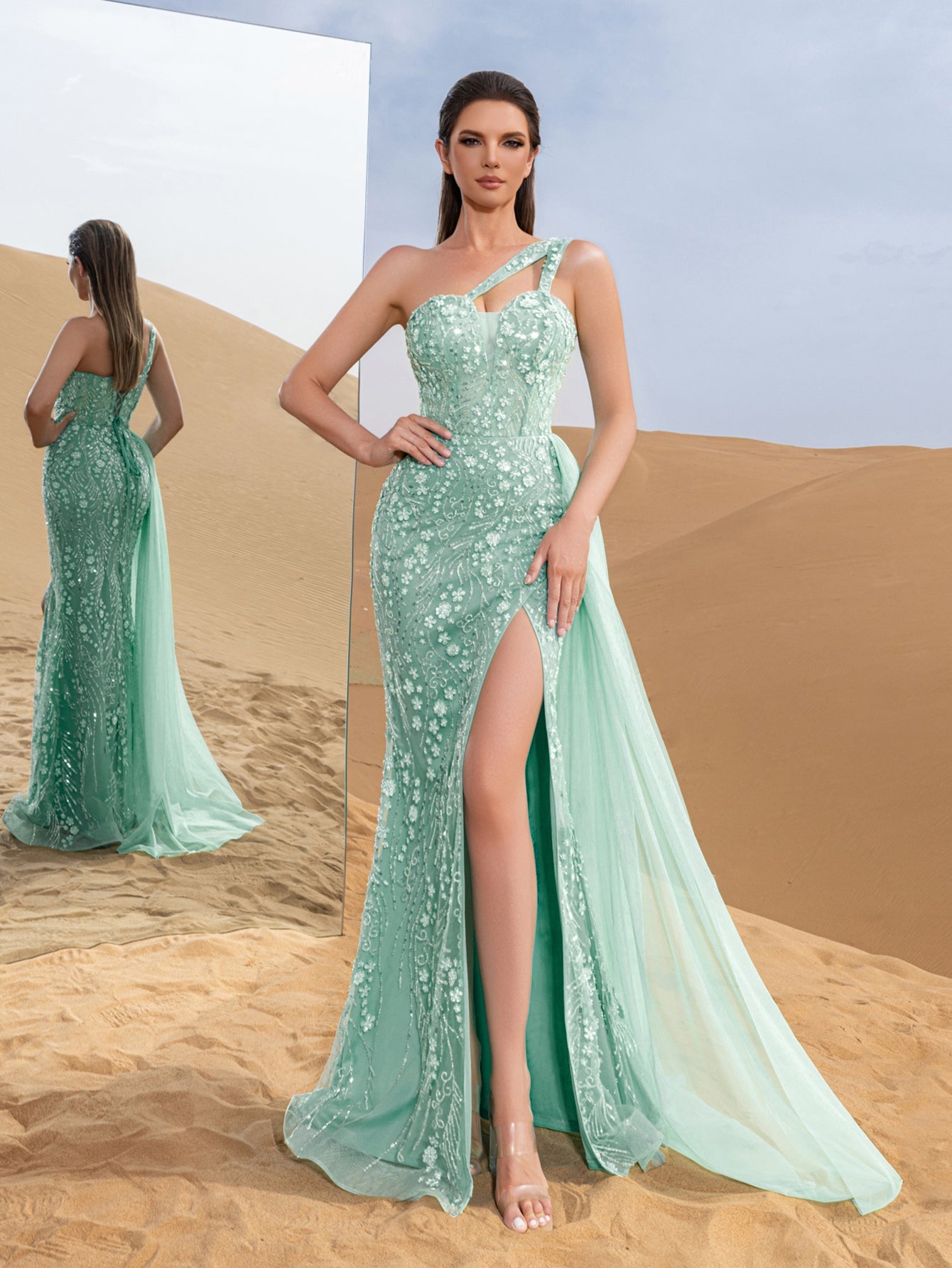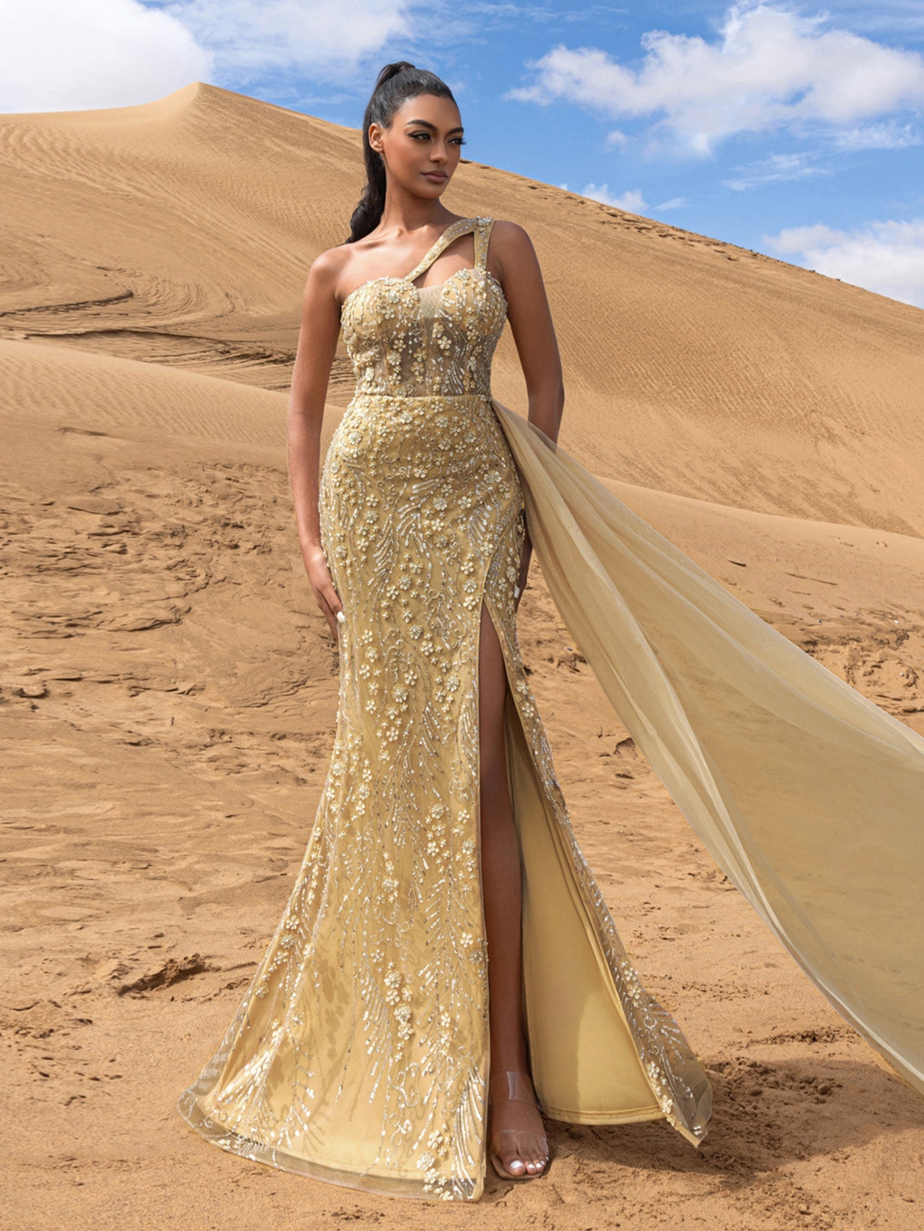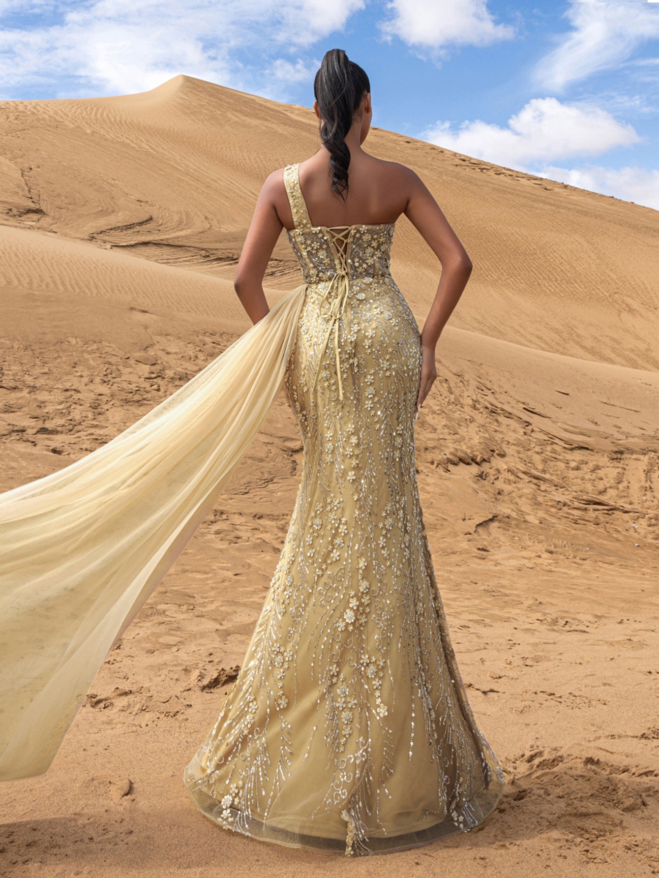 Embrace timeless elegance and luxury with this captivating evening gown, designed to make a striking impression. This stunning piece features intricate beaded sequins arranged in delicate cascading patterns, adding an exquisite shimmer to every step. The sweetheart neckline with an asymmetrical shoulder strap brings soft sophistication to the design, while the fitted silhouette flawlessly hugs the body before gracefully flaring into a mermaid hem. The gown’s ethereal tulle drape adds an enchanting touch, creating a flowing, romantic effect that moves effortlessly.