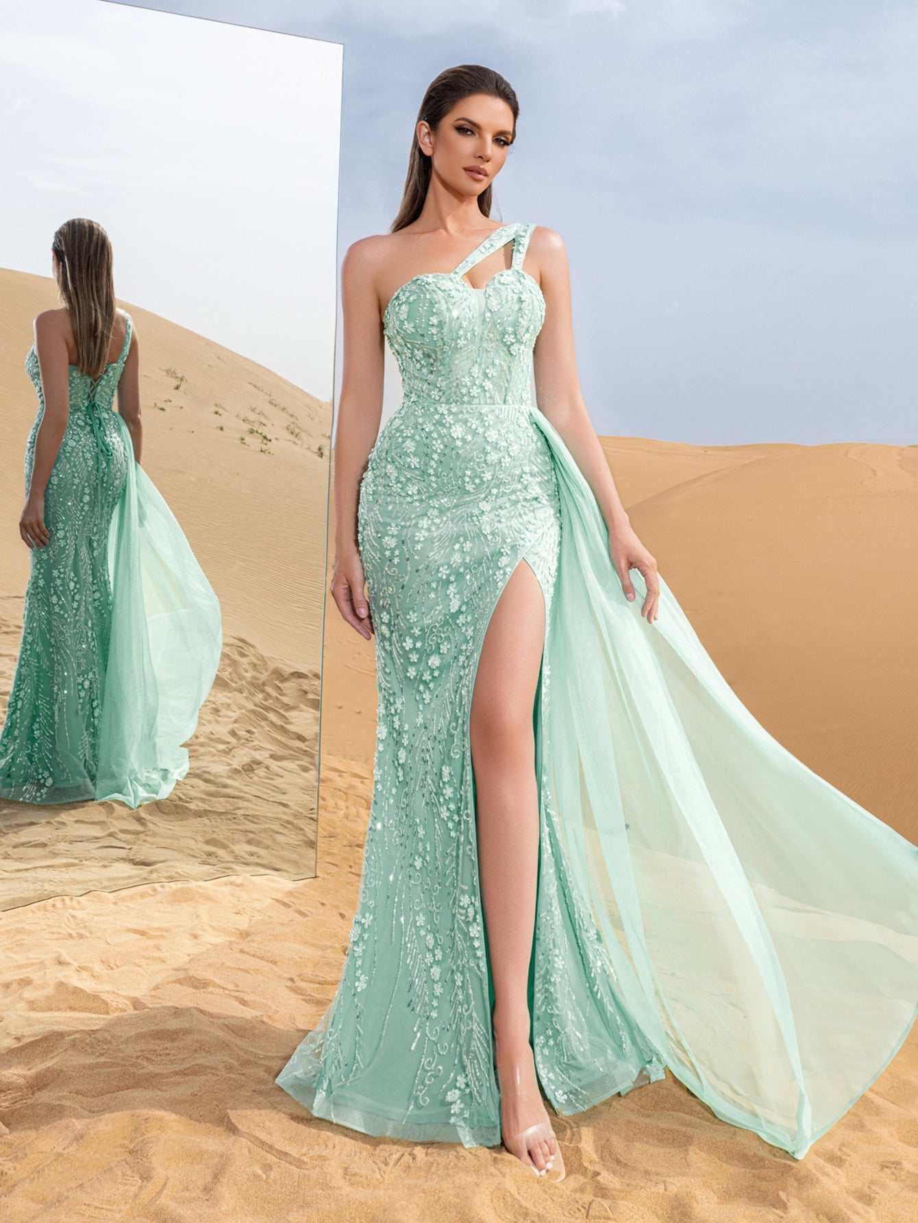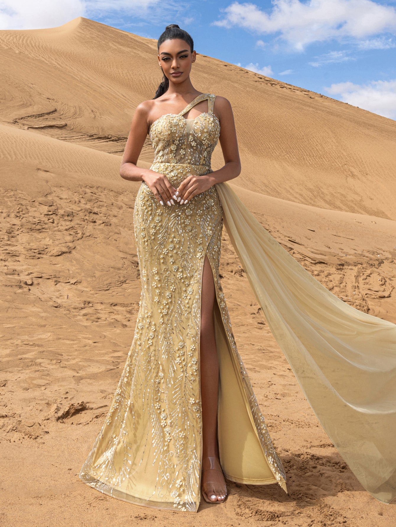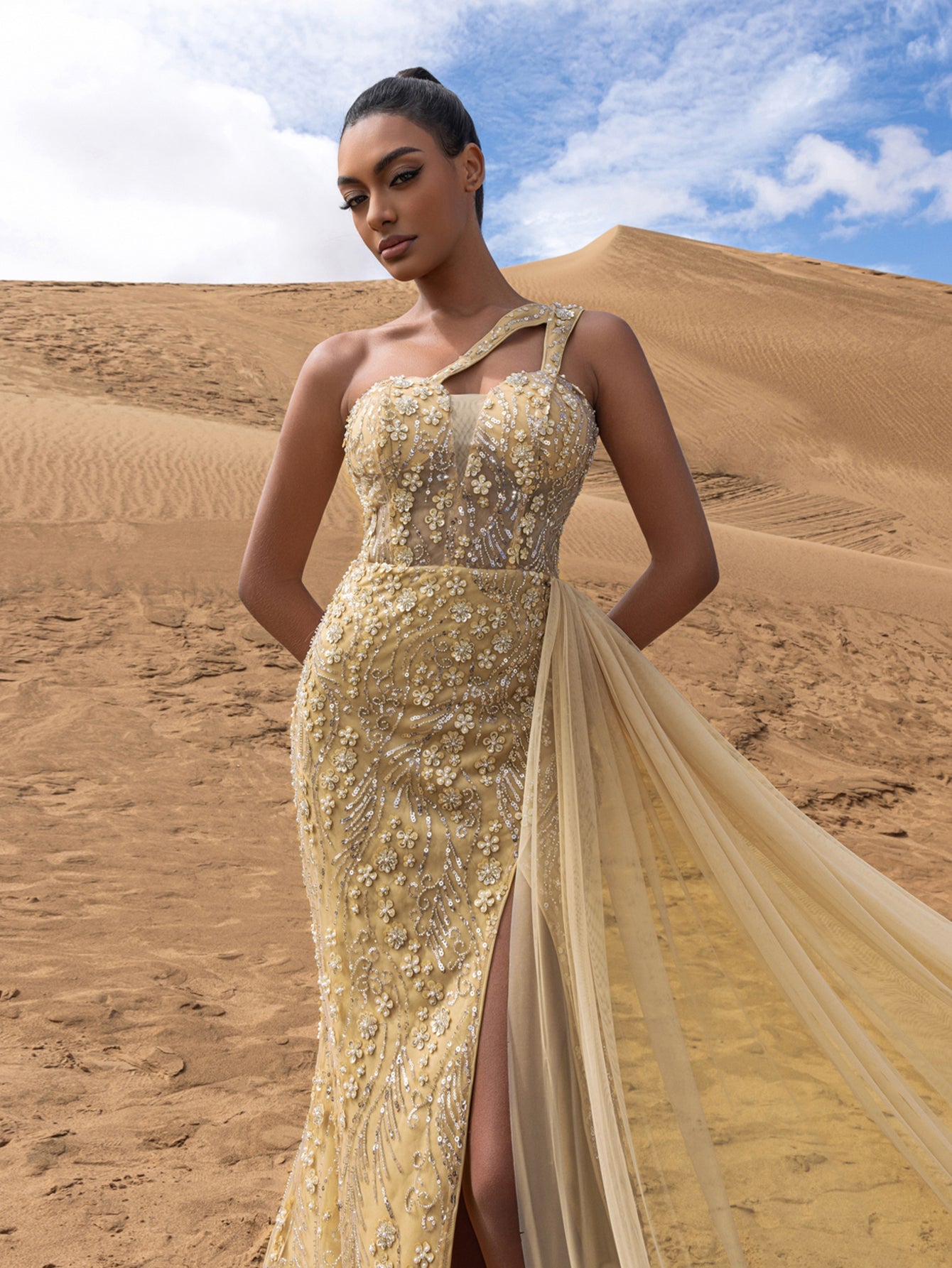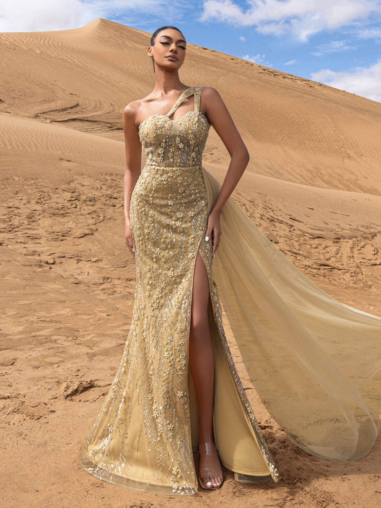 Embrace timeless elegance and luxury with this captivating evening gown, designed to make a striking impression. This stunning piece features intricate beaded sequins arranged in delicate cascading patterns, adding an exquisite shimmer to every step. The sweetheart neckline with an asymmetrical shoulder strap brings soft sophistication to the design, while the fitted silhouette flawlessly hugs the body before gracefully flaring into a mermaid hem. The gown’s ethereal tulle drape adds an enchanting touch, creating a flowing, romantic effect that moves effortlessly.