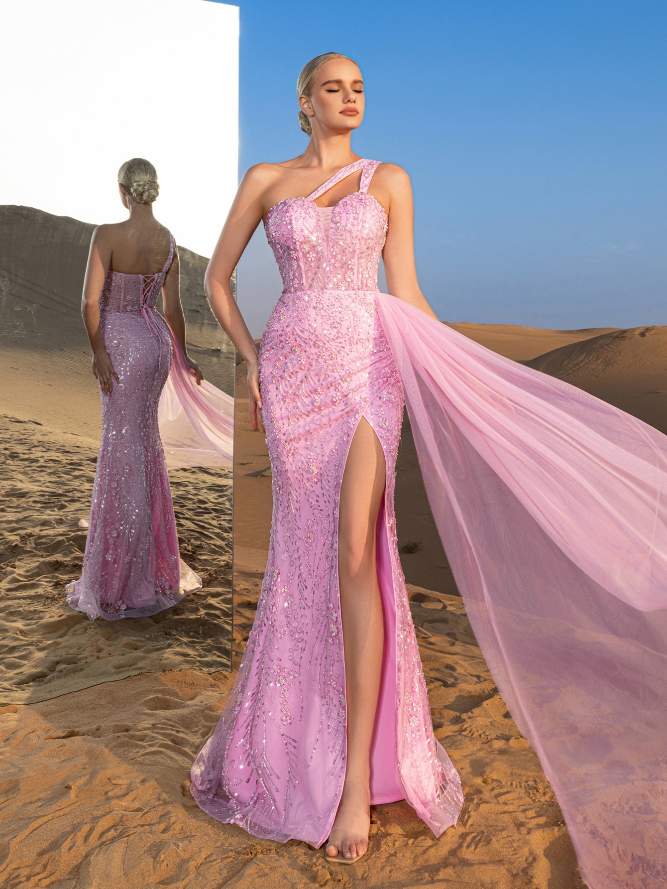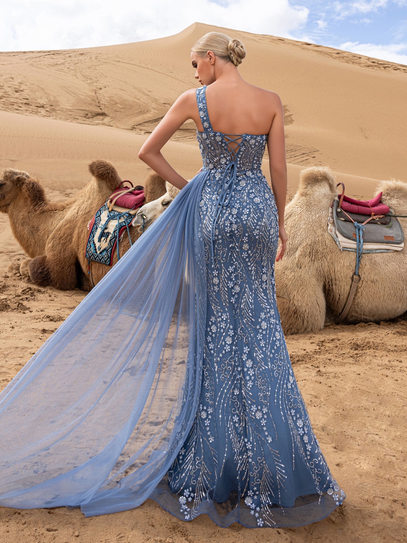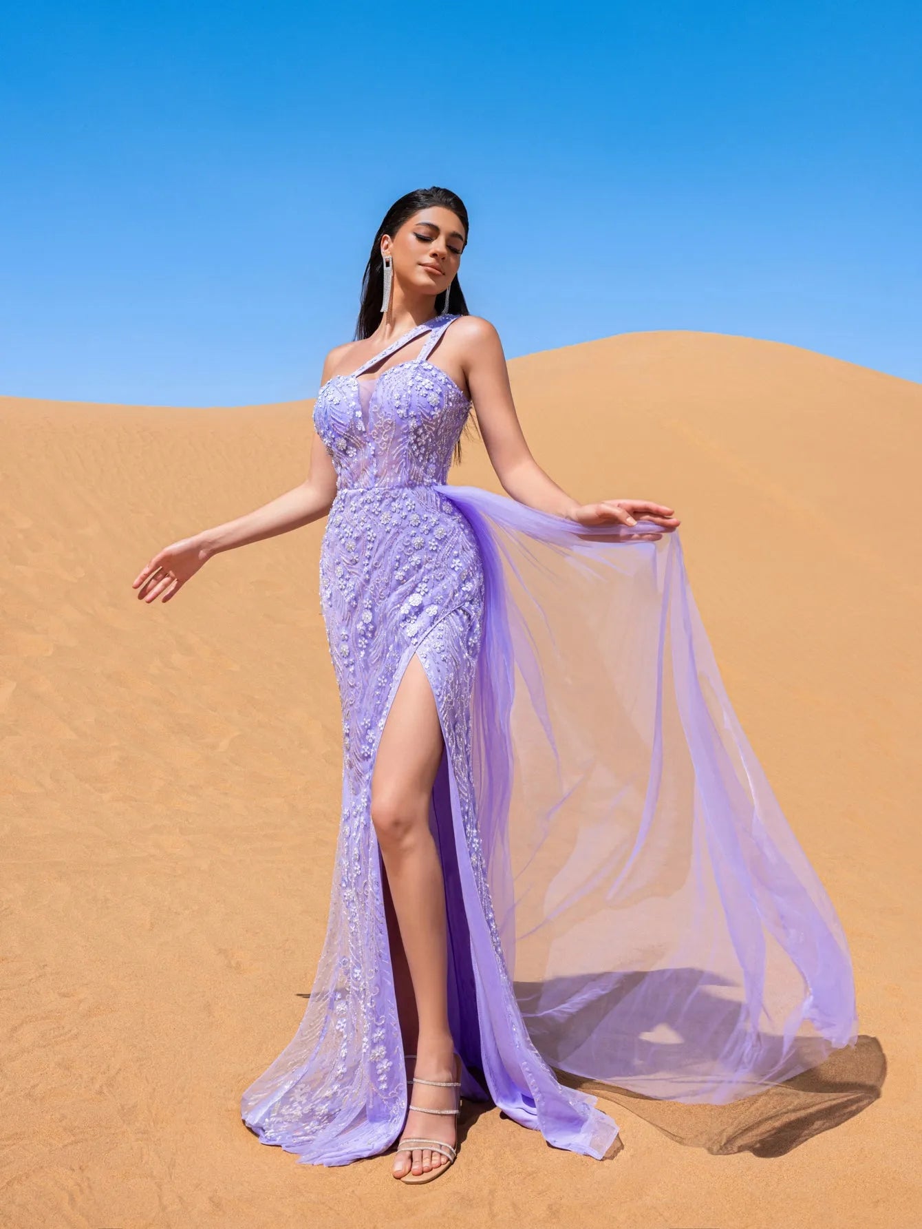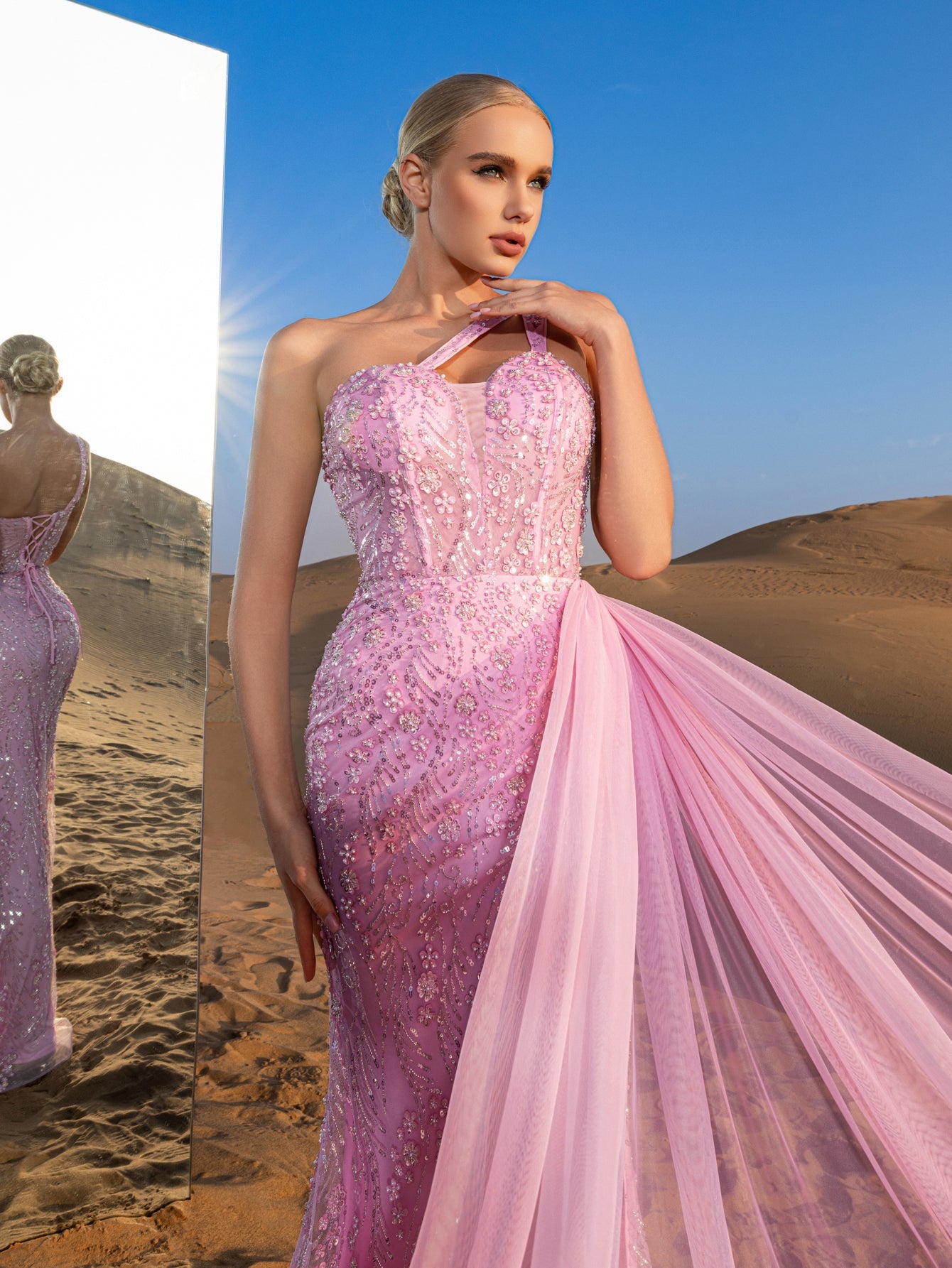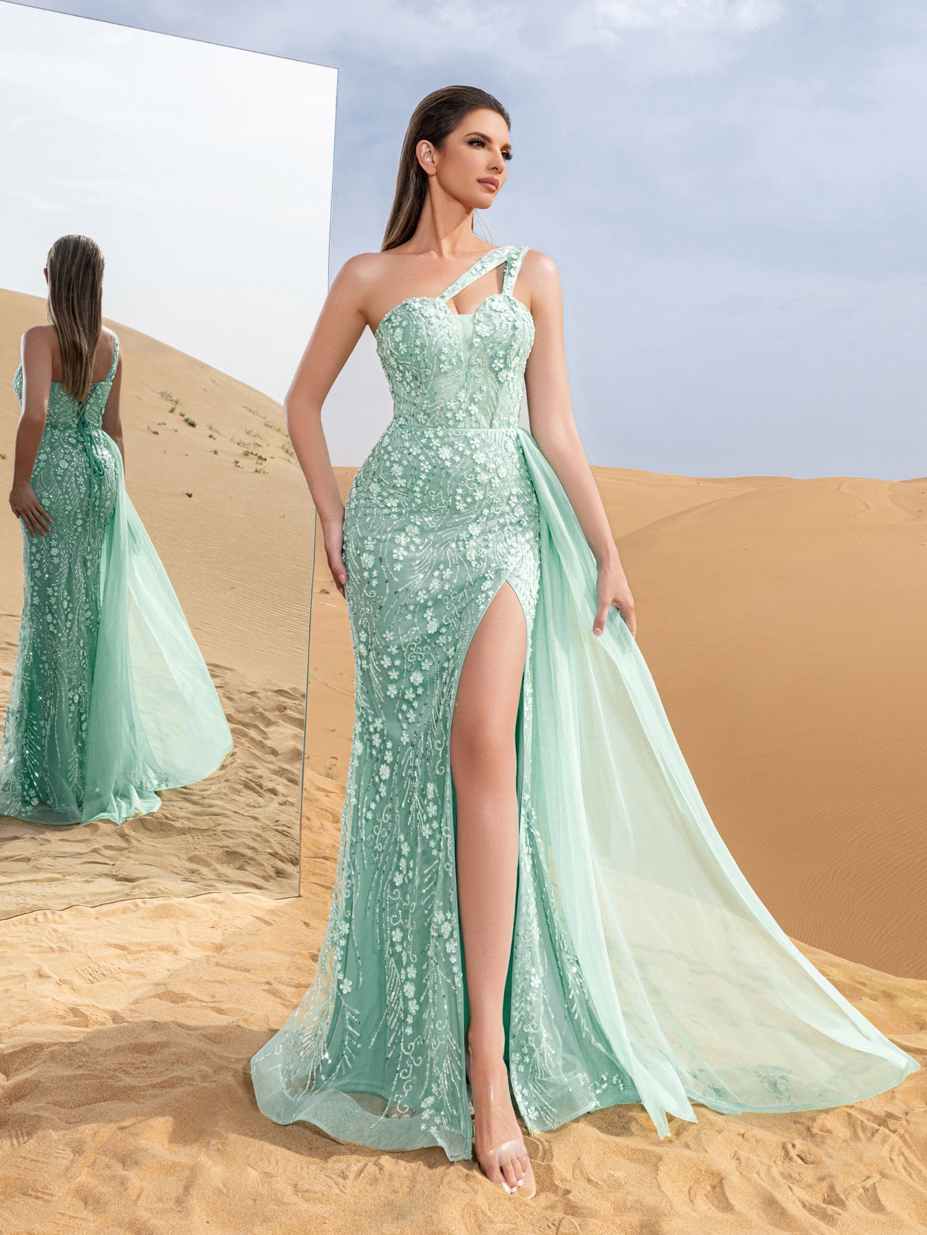 Embrace timeless elegance and luxury with this captivating evening gown, designed to make a striking impression. This stunning piece features intricate beaded sequins arranged in delicate cascading patterns, adding an exquisite shimmer to every step. The sweetheart neckline with an asymmetrical shoulder strap brings soft sophistication to the design, while the fitted silhouette flawlessly hugs the body before gracefully flaring into a mermaid hem. The gown’s ethereal tulle drape adds an enchanting touch, creating a flowing, romantic effect that moves effortlessly.