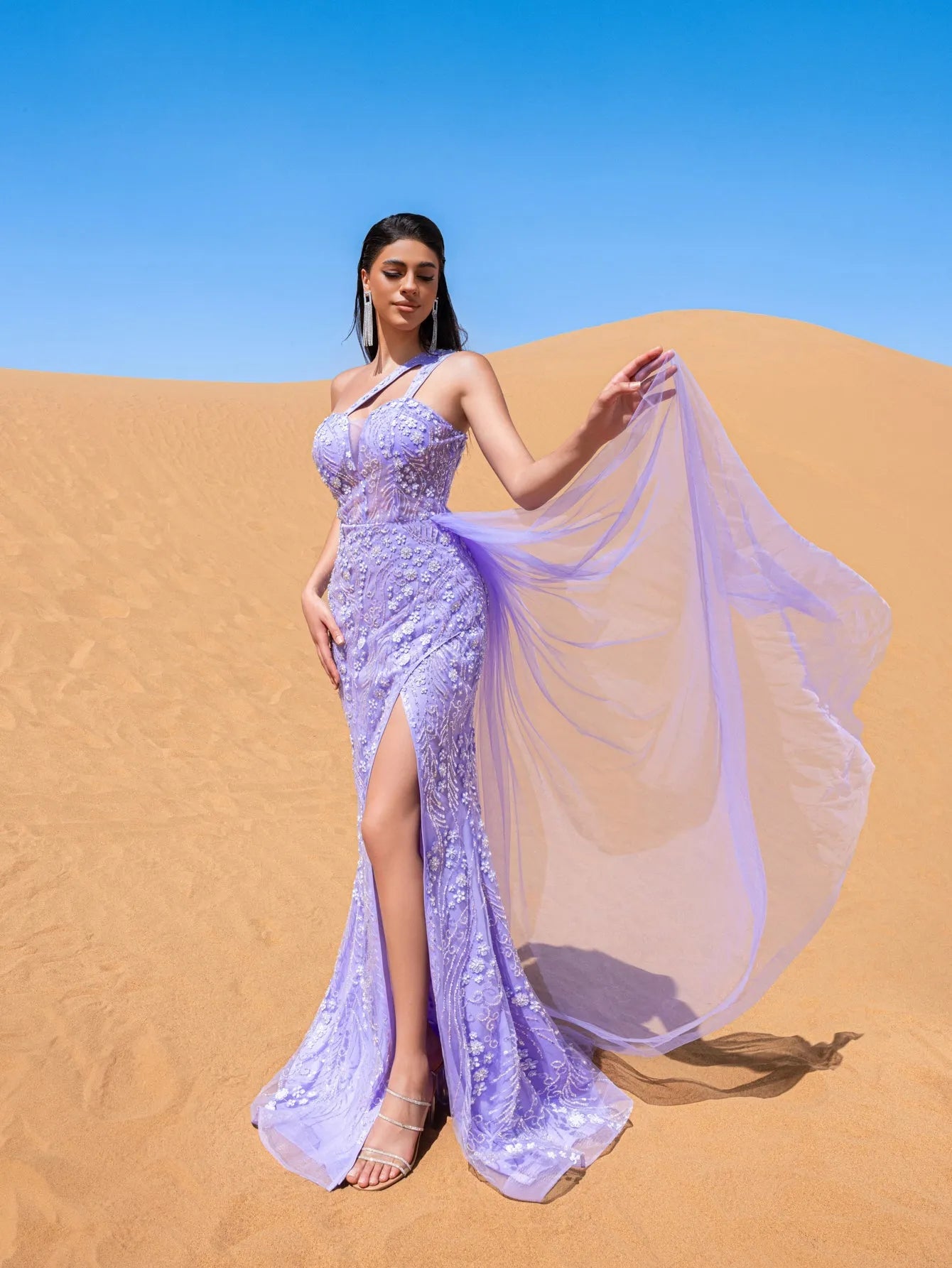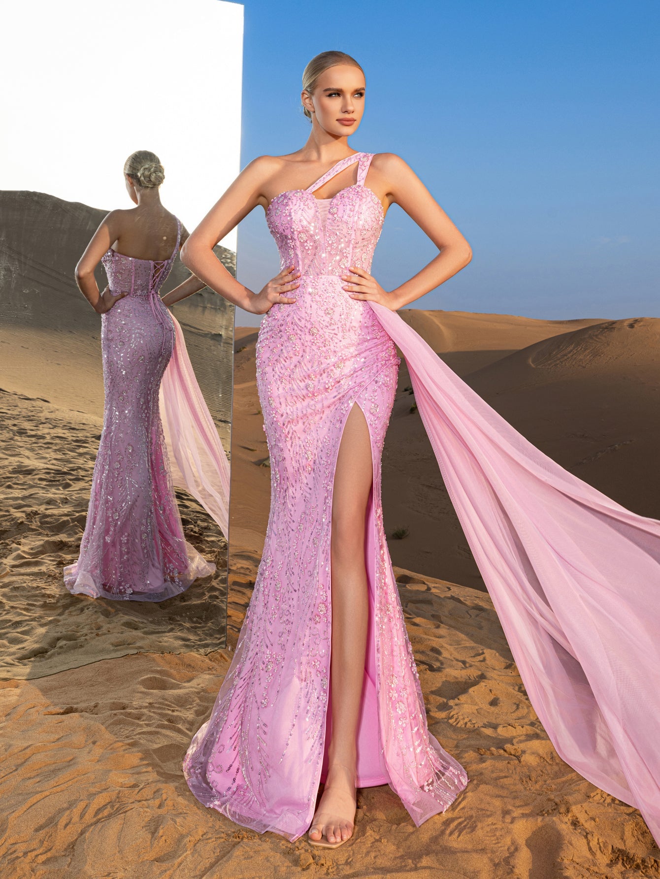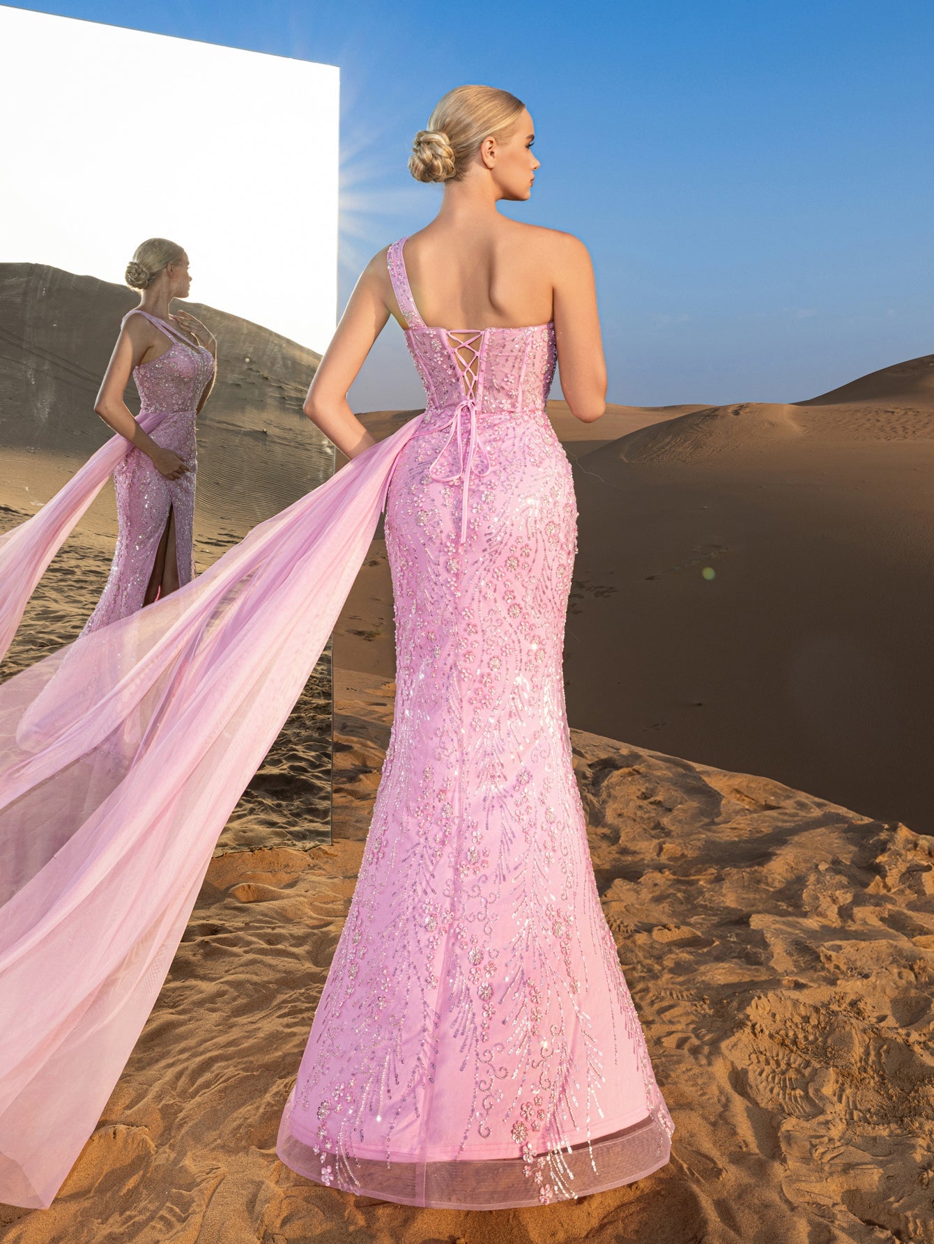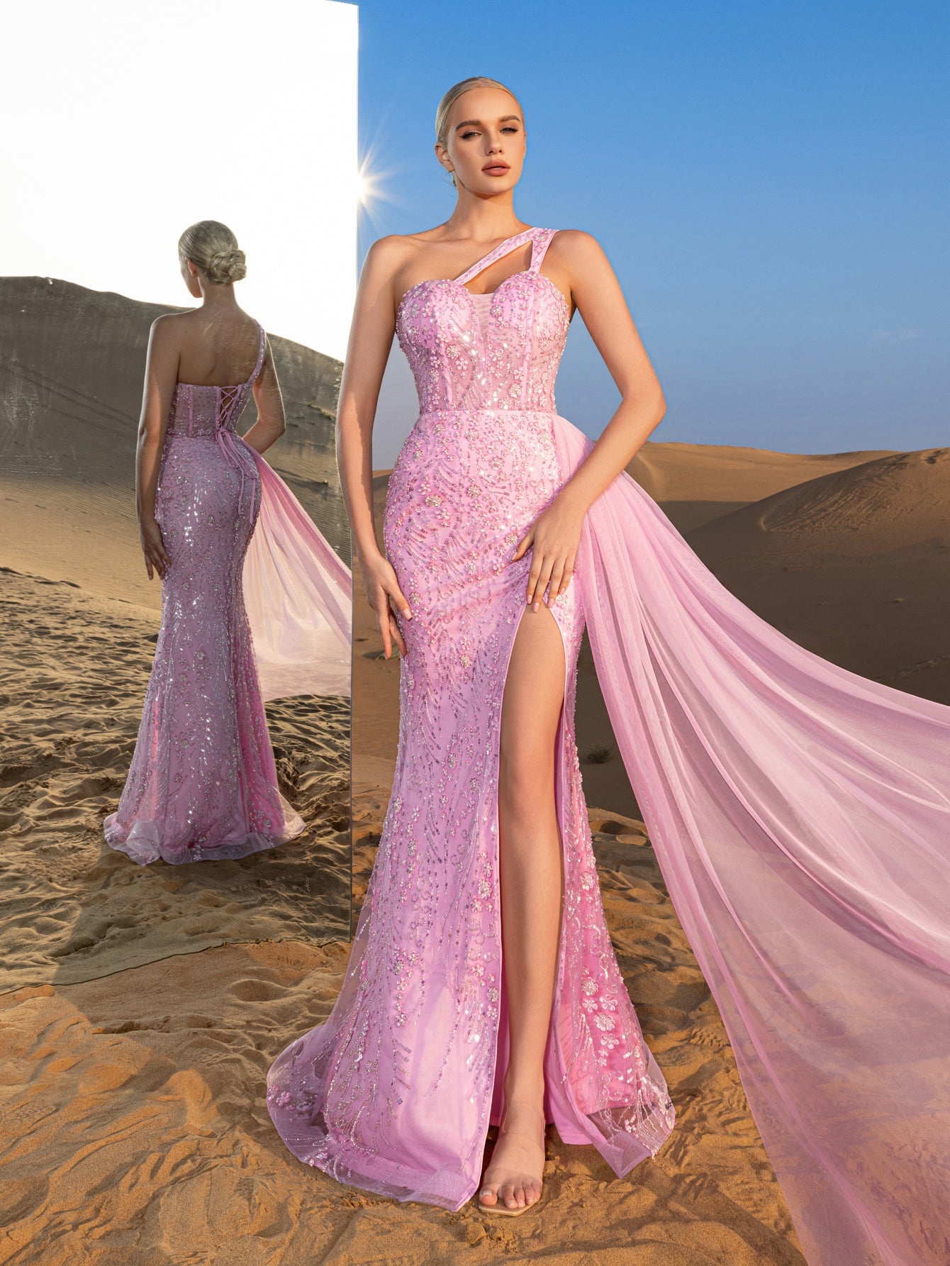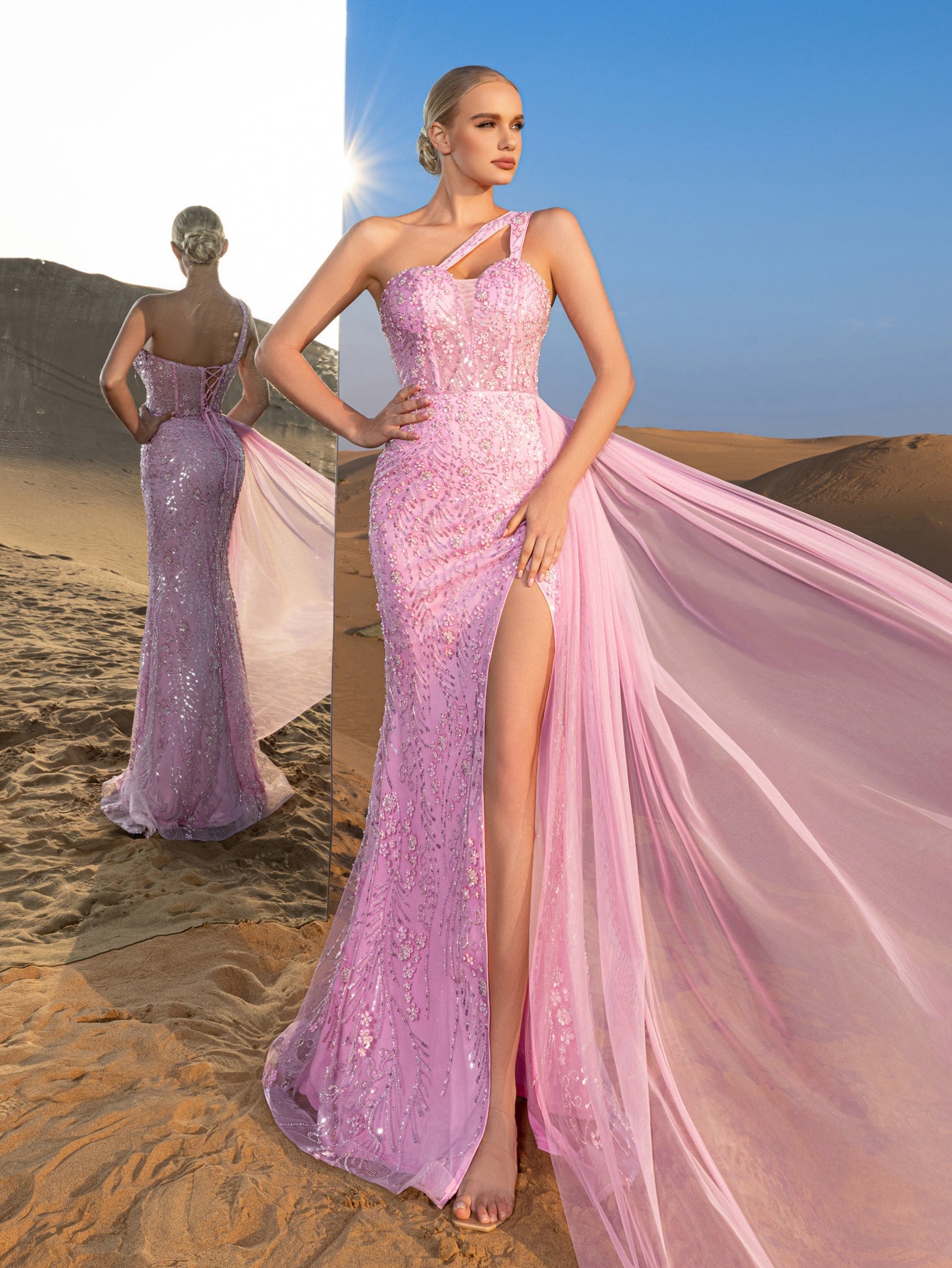 Embrace timeless elegance and luxury with this captivating evening gown, designed to make a striking impression. This stunning piece features intricate beaded sequins arranged in delicate cascading patterns, adding an exquisite shimmer to every step. The sweetheart neckline with an asymmetrical shoulder strap brings soft sophistication to the design, while the fitted silhouette flawlessly hugs the body before gracefully flaring into a mermaid hem. The gown’s ethereal tulle drape adds an enchanting touch, creating a flowing, romantic effect that moves effortlessly.