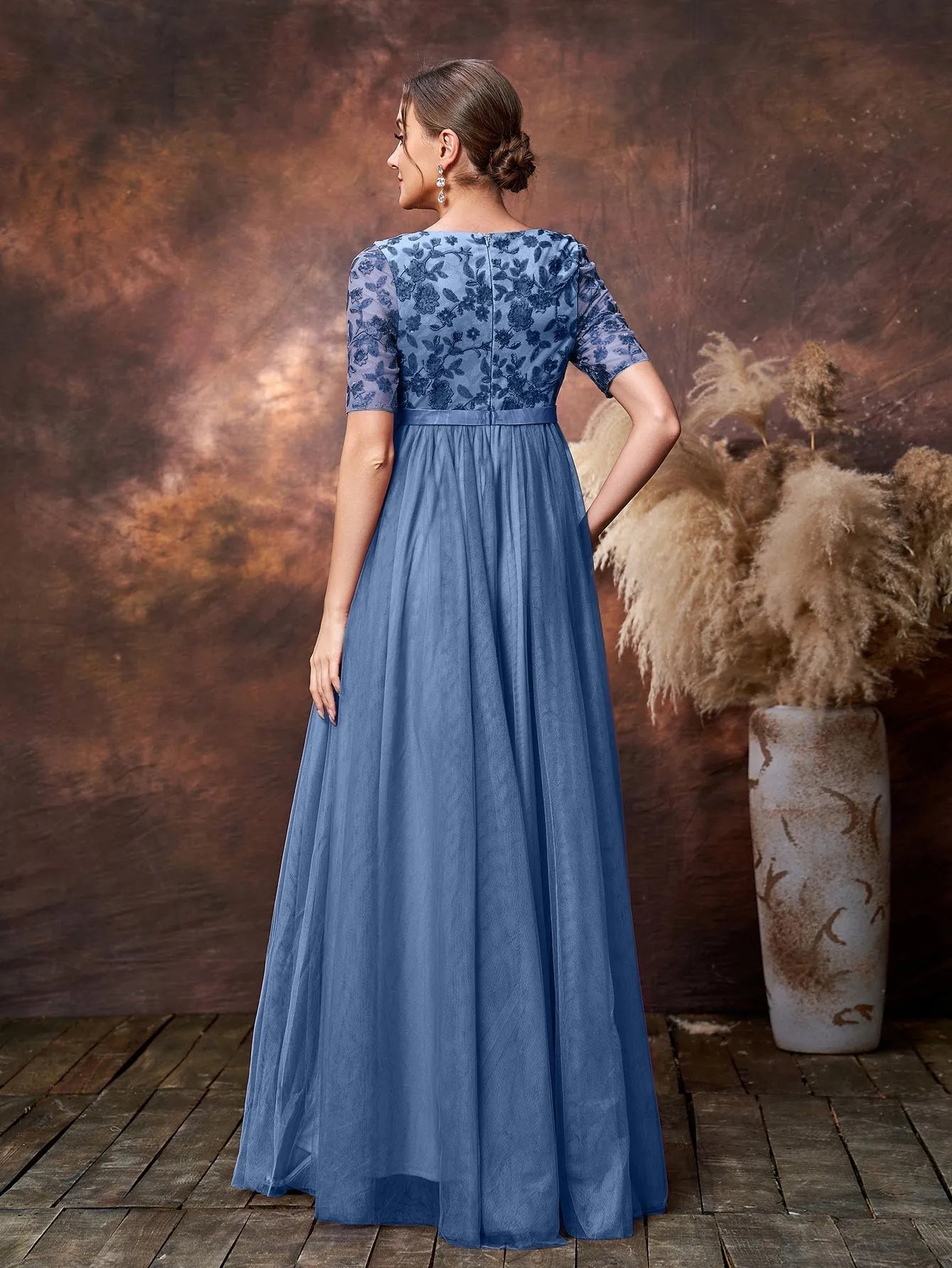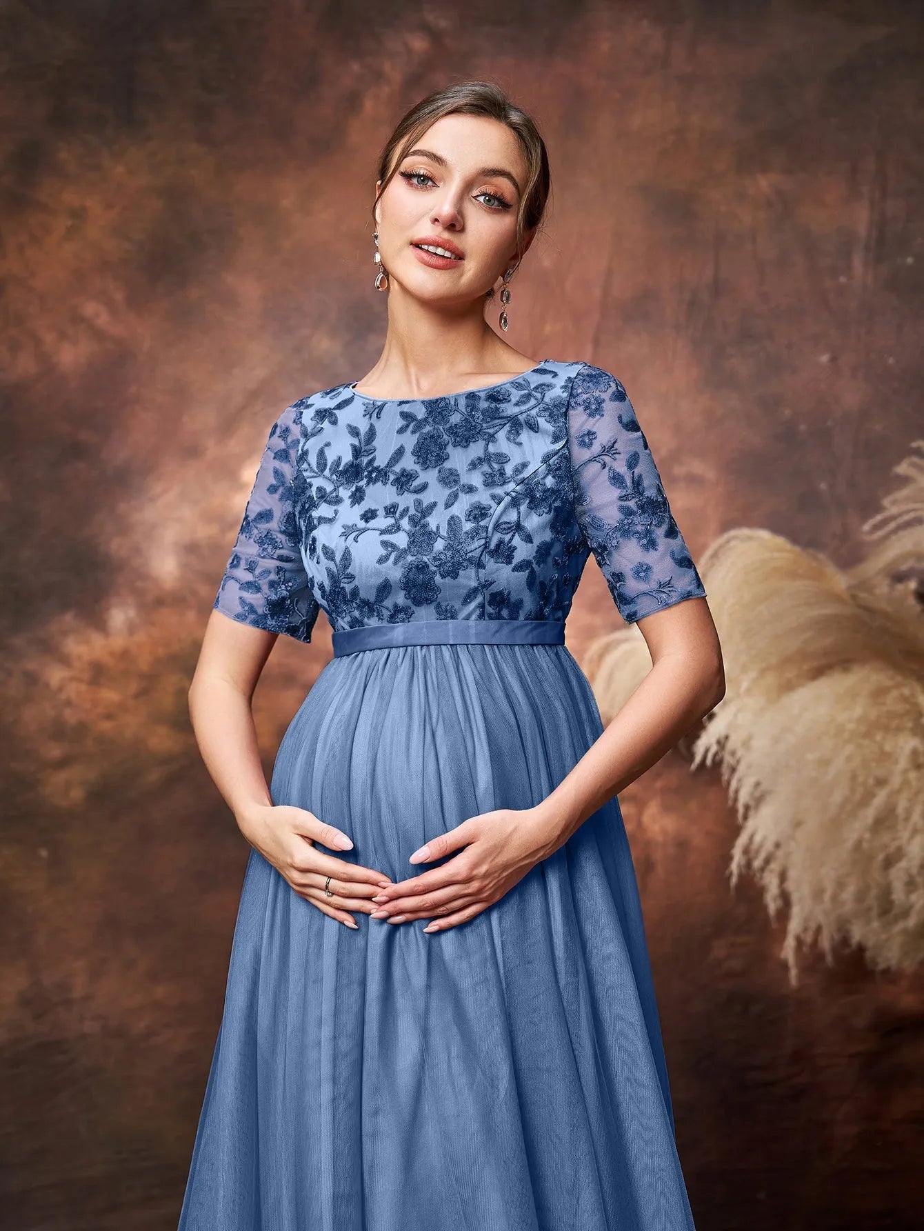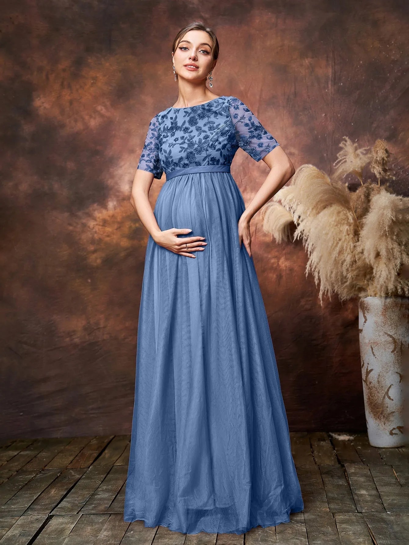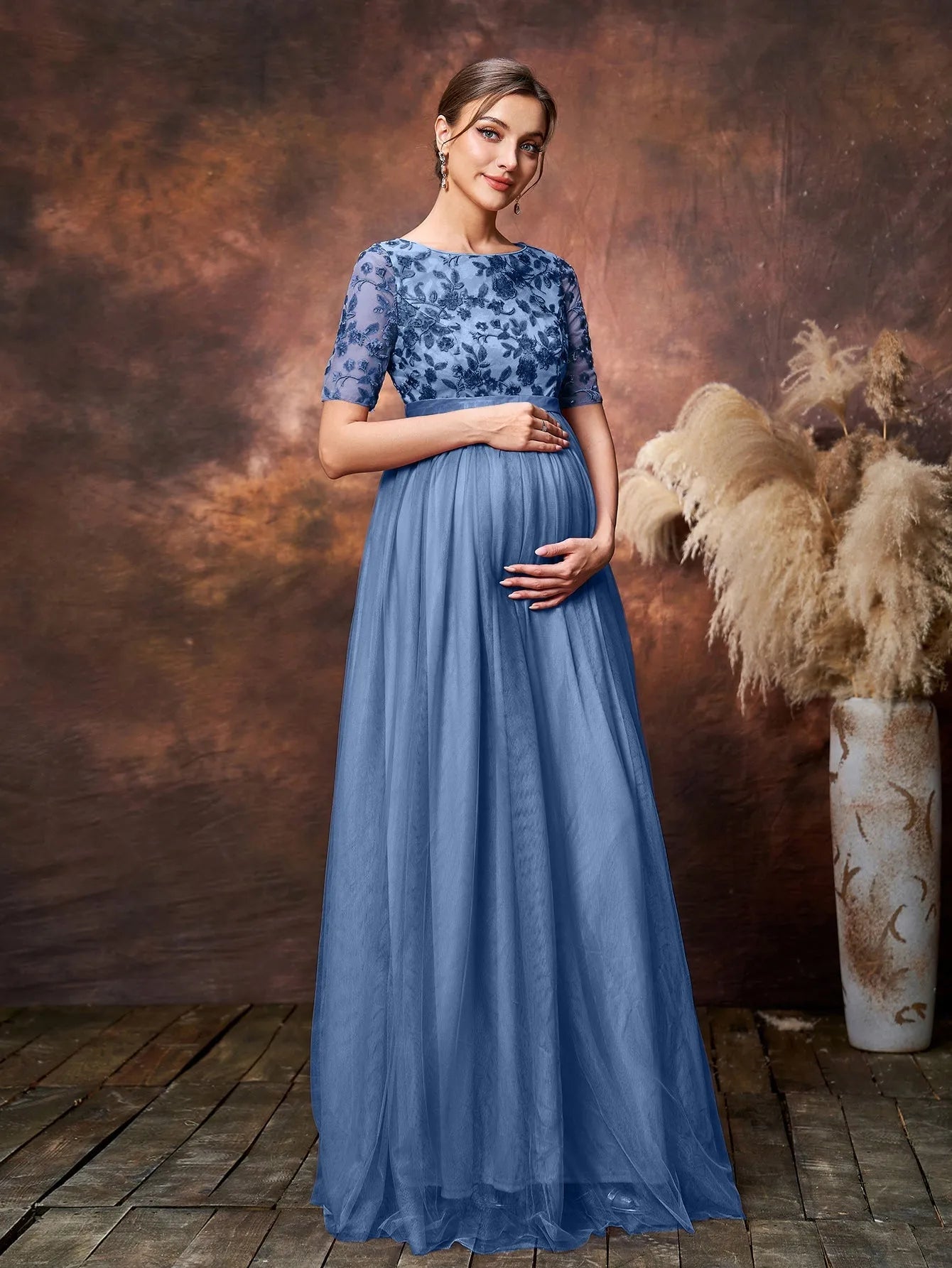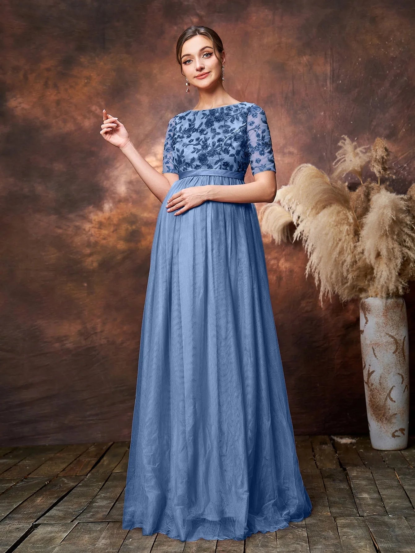 Step into timeless elegance with our exquisite maternity gown, tailored to celebrate your beauty during this special journey. The gown features a soft tulle overlay that drapes gracefully over your growing bump, while the intricately embroidered lace bodice adds a touch of vintage charm. The half sleeves provide a delicate balance of coverage and style, perfect for any season. The empire waistline accentuates your silhouette, allowing the flowing tulle skirt to cascade effortlessly to the floor, creating a dreamy and ethereal look.