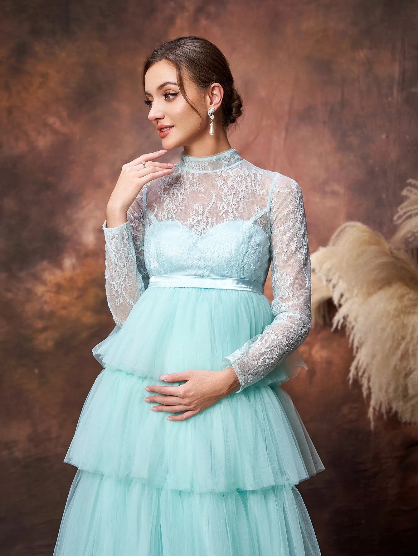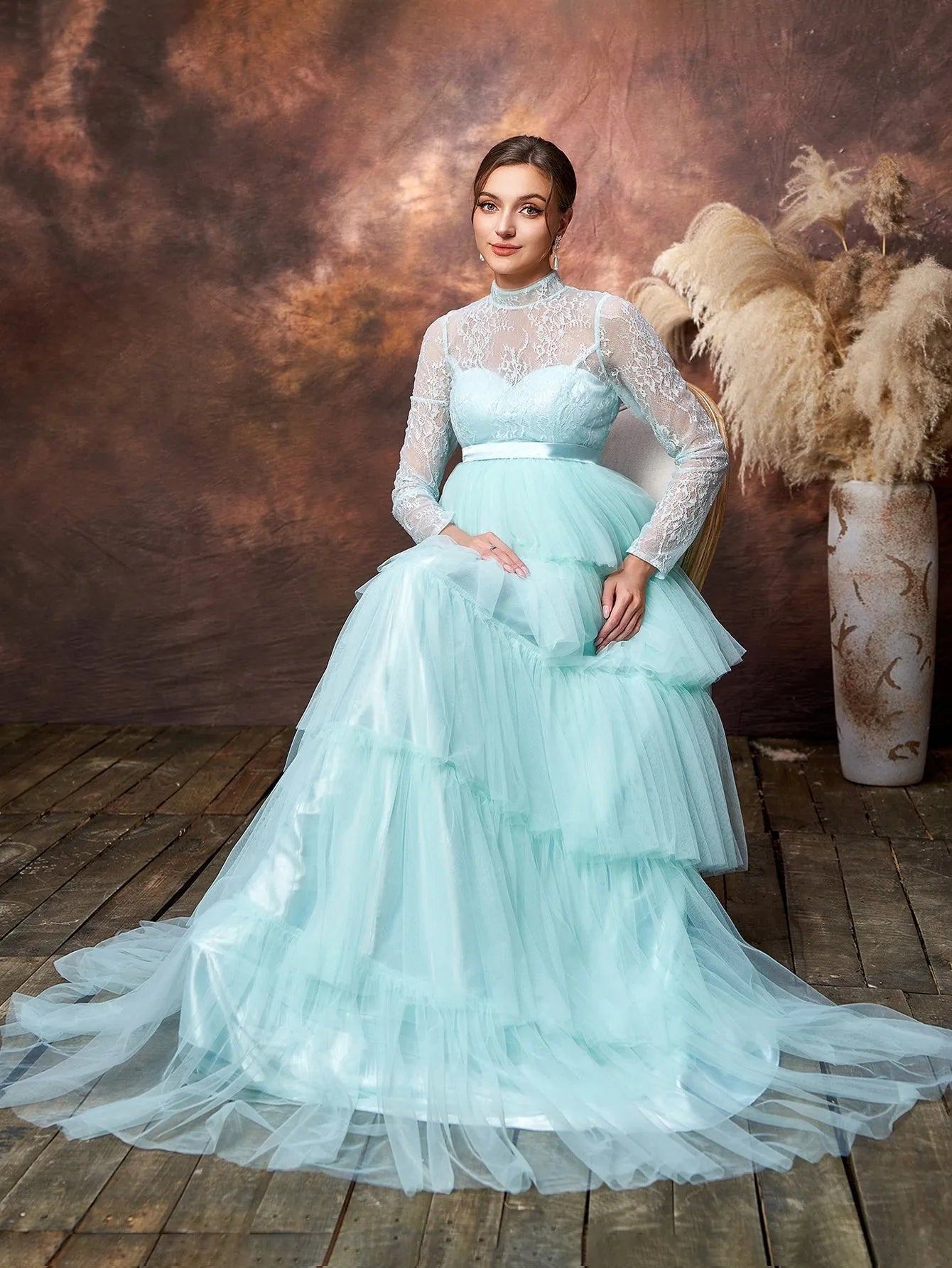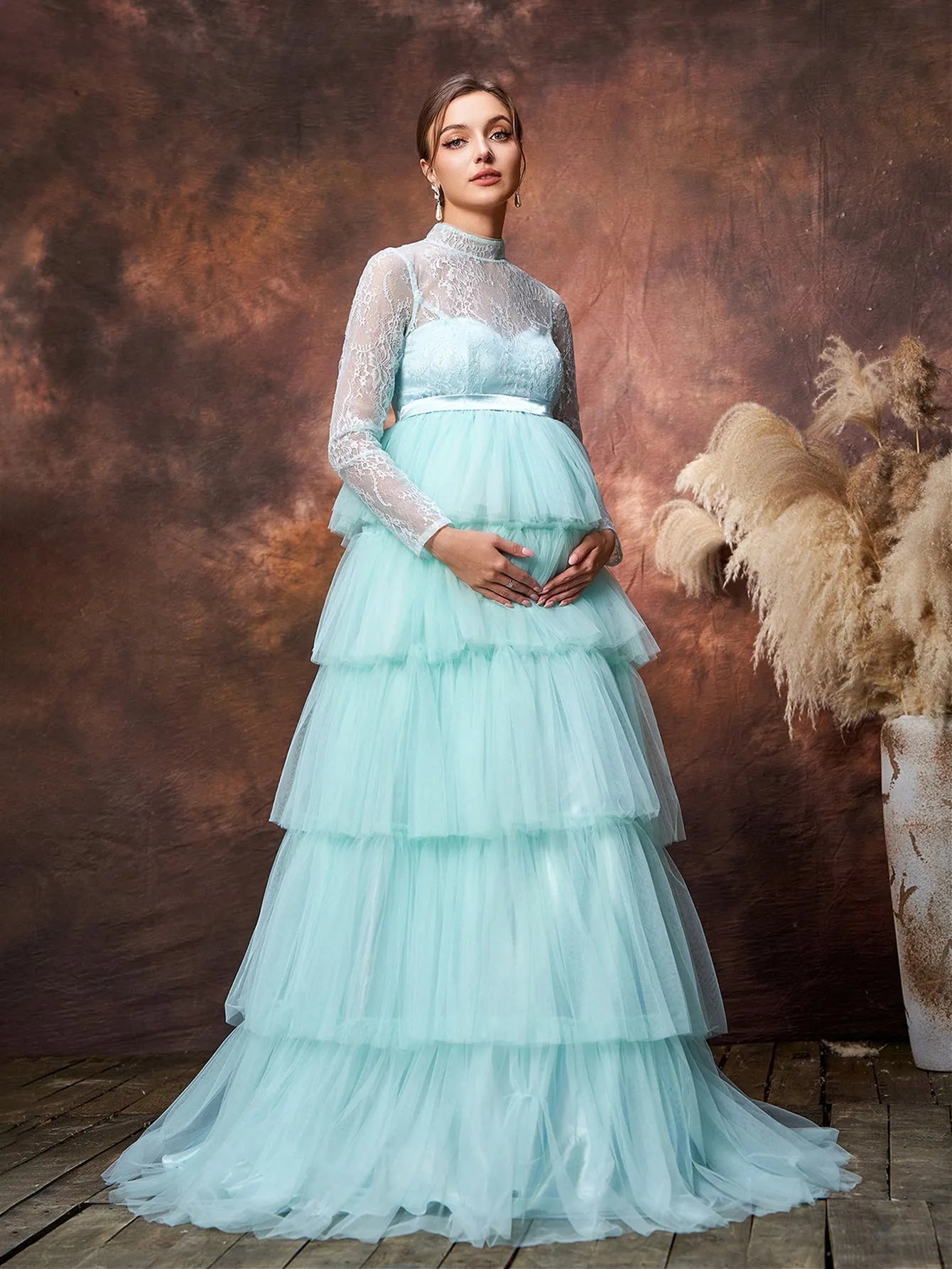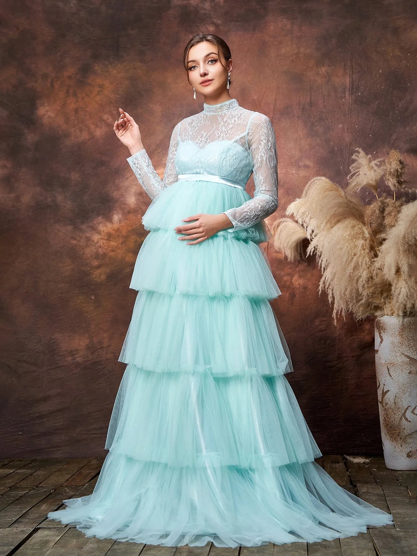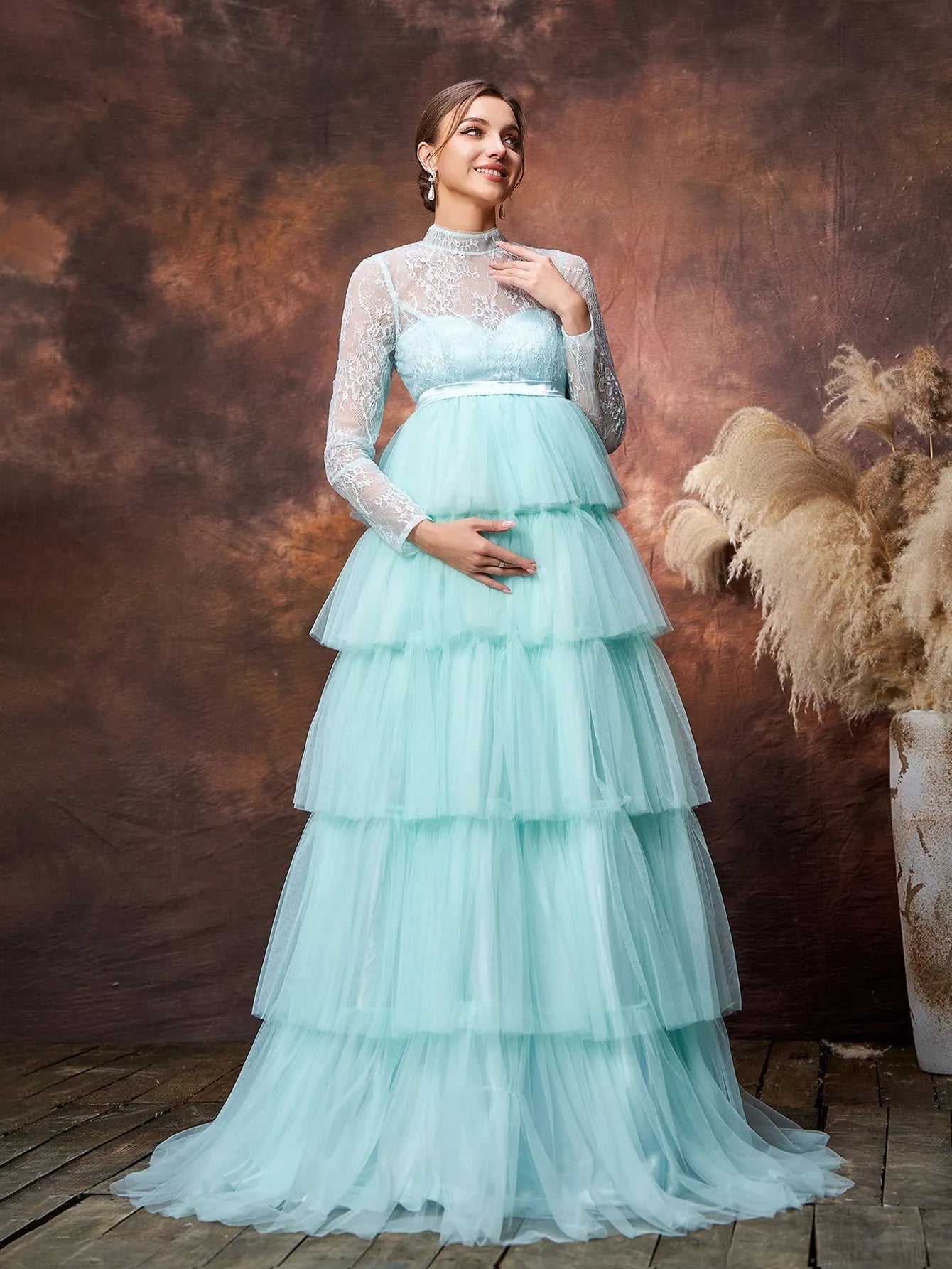 Step into the spotlight with this ethereal maternity gown, designed to make you feel like a true goddess during this magical time. The gown features a delicate lace bodice with a high neckline, offering a touch of vintage elegance while providing coverage and support. The highlight of this gown is its tiered tulle skirt, cascading gracefully to the floor in layers that add both volume and movement. The soft color enhances the dreamy quality of the dress, making it perfect for any occasion where you want to feel both graceful and glamorous.