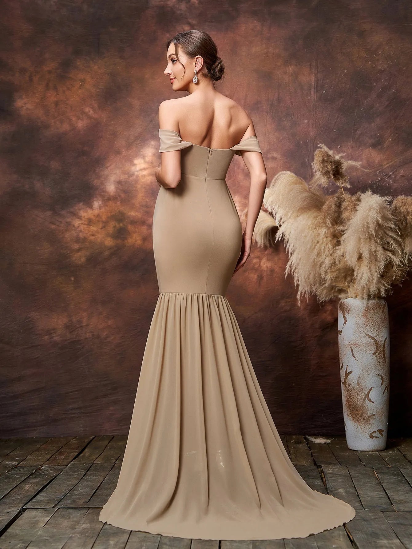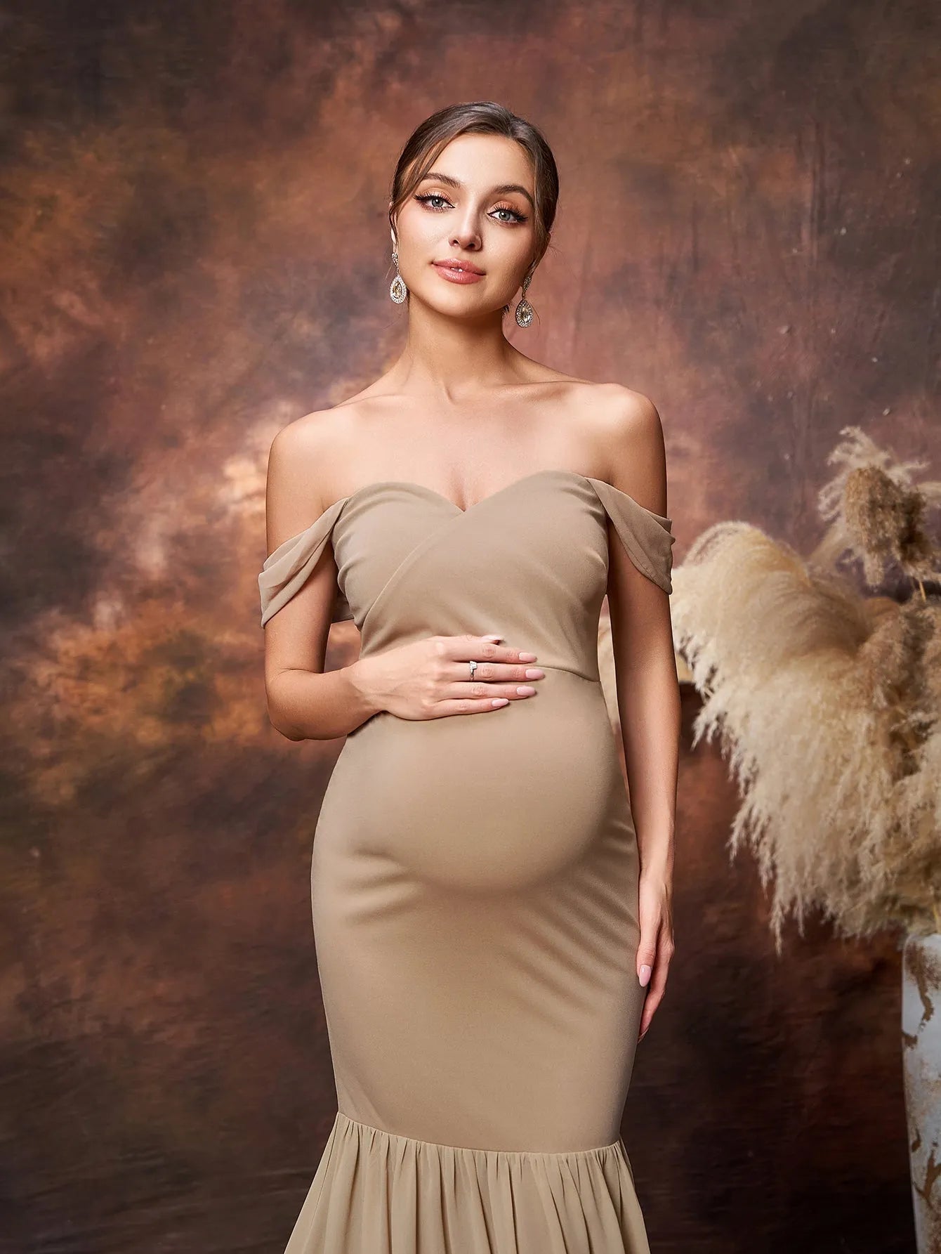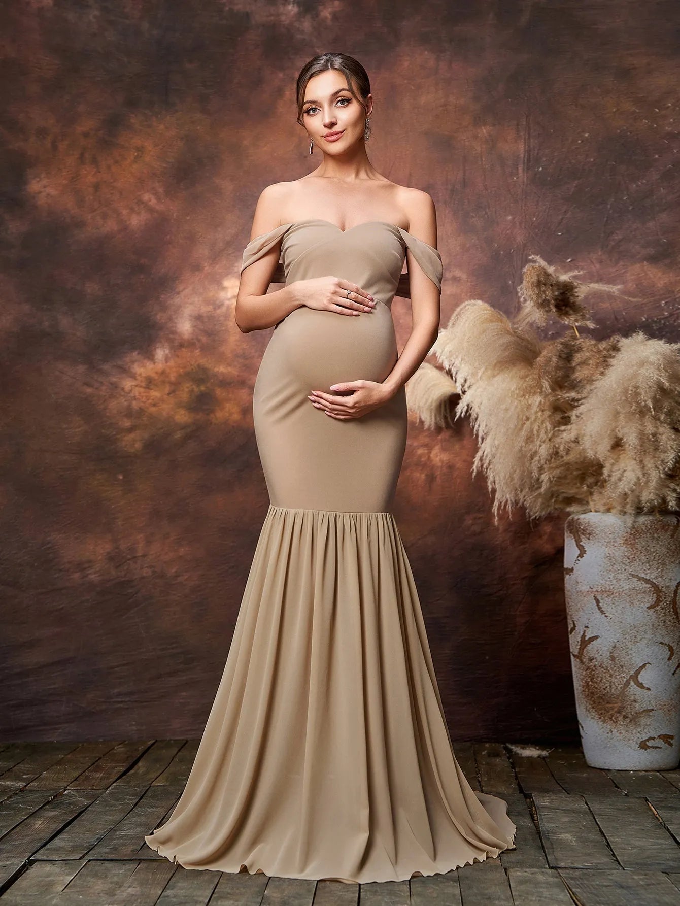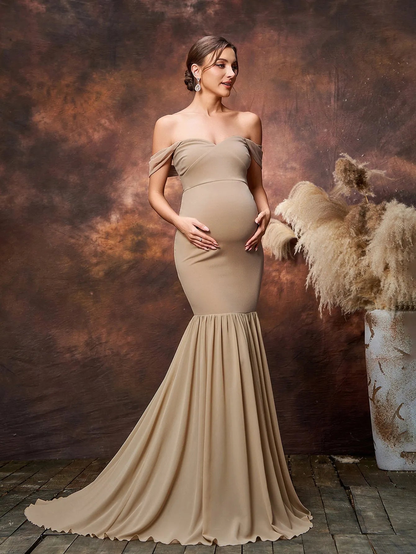 Celebrate your pregnancy in timeless elegance with this stunning maternity gown. The dress features a sophisticated off-the-shoulder neckline that beautifully frames your shoulders and collarbone, complemented by a form-fitting bodice that accentuates your baby bump. The sleek mermaid silhouette flows into a graceful, floor-length chiffon skirt, adding a touch of drama with its subtle train. Crafted from soft, stretchy knit fabric, this gown ensures comfort without compromising on style.