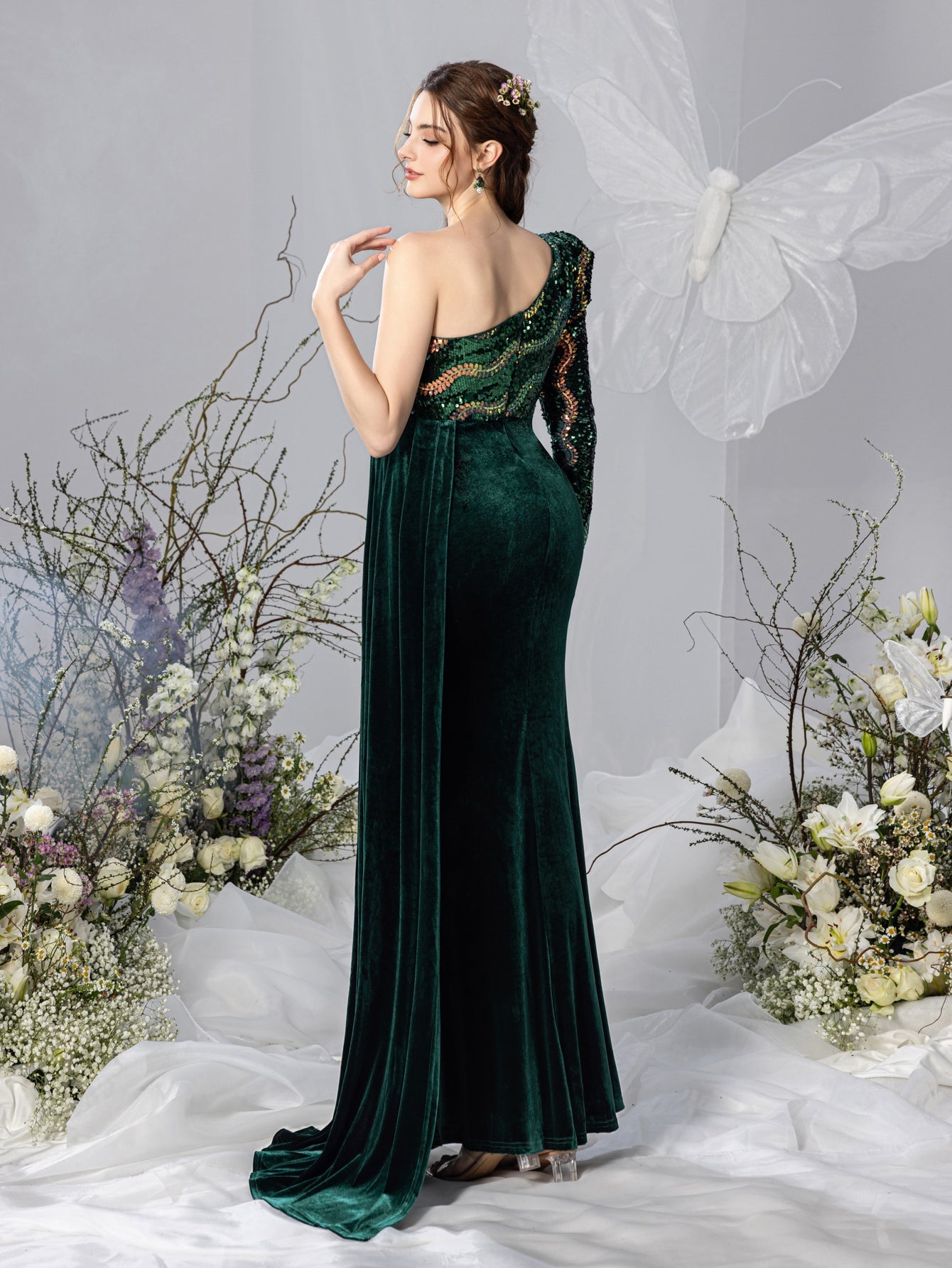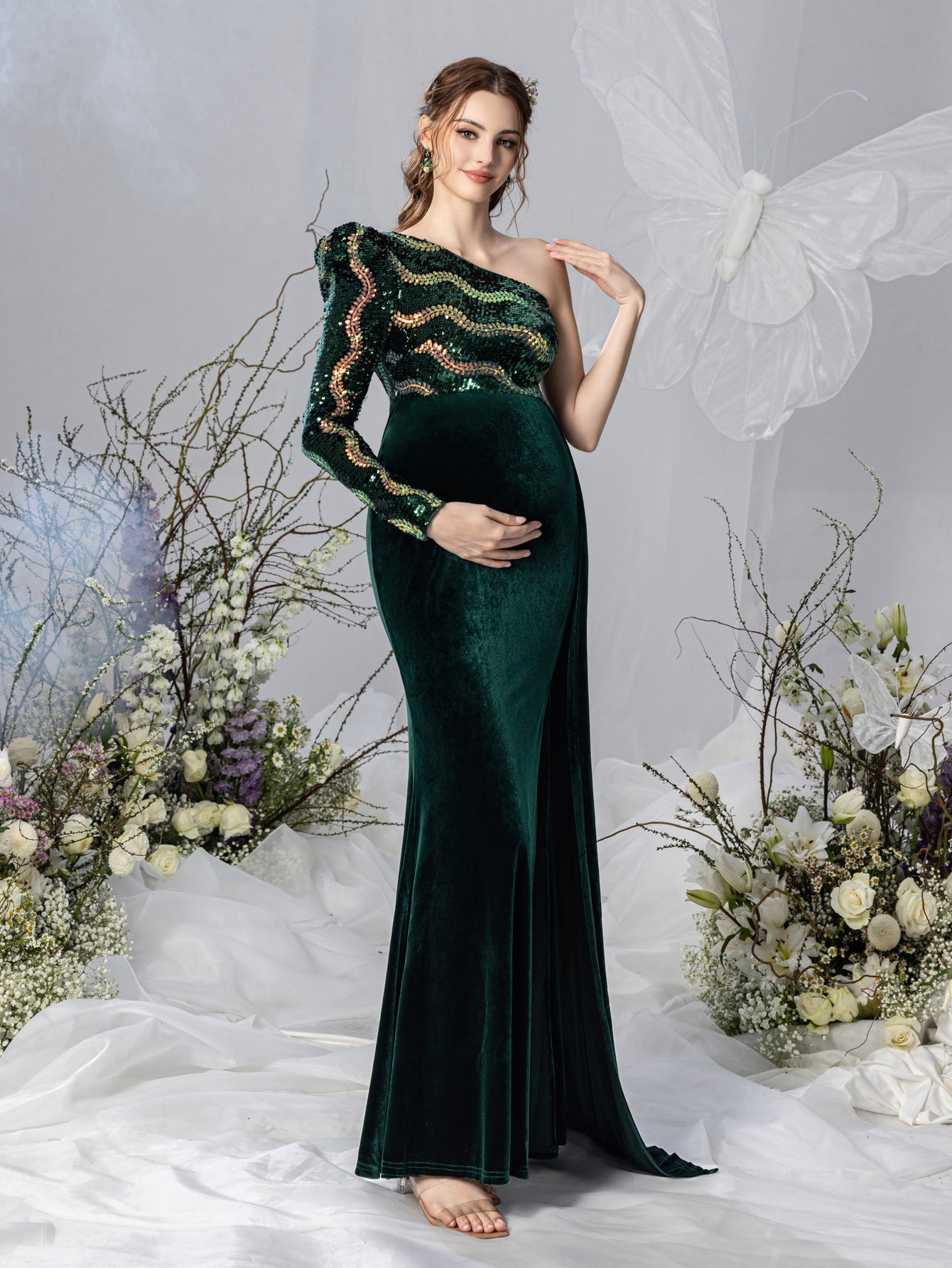 Maternity One Shoulder Split Mermaid Hem Contrast Sequin Velvet Evening Dress