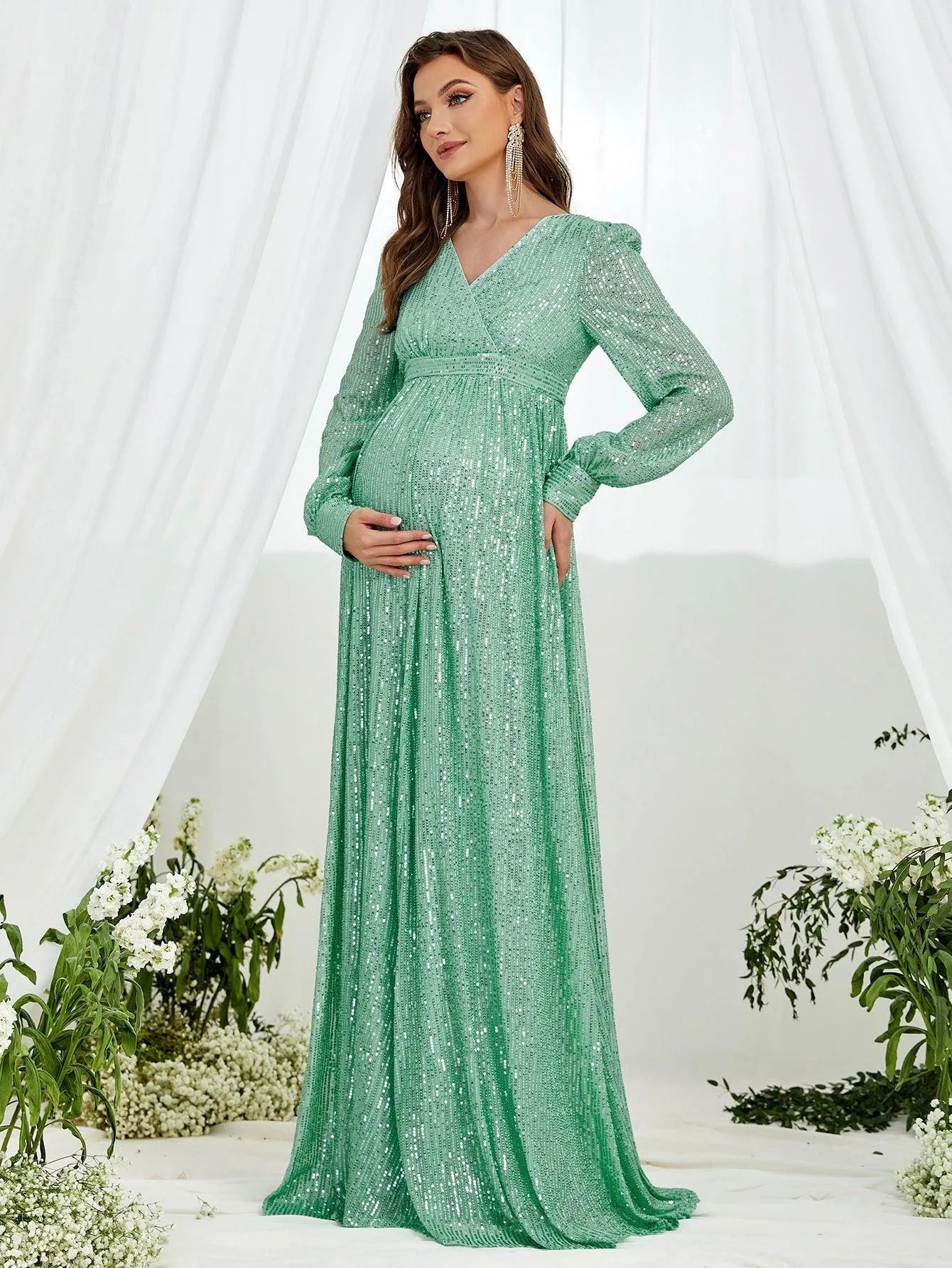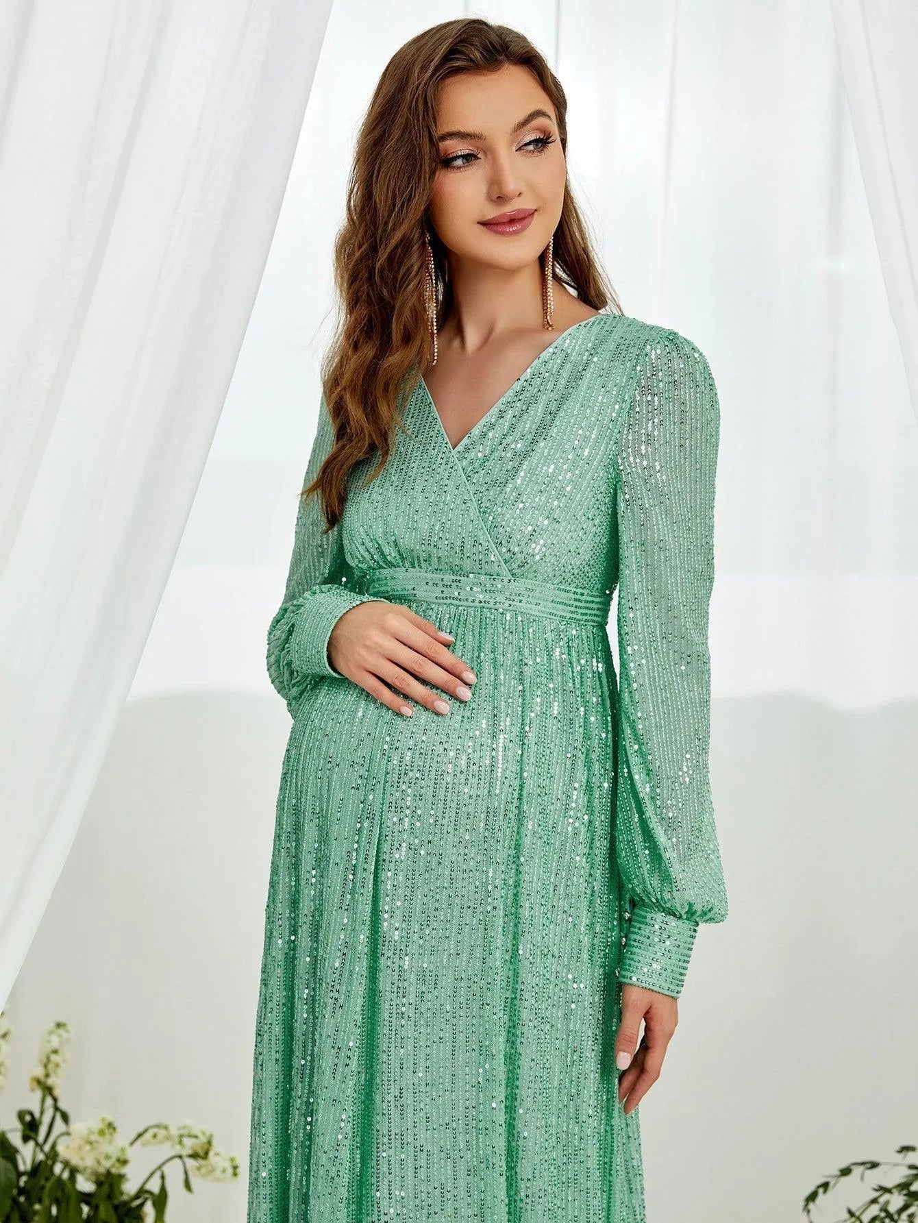 Maternity V Neck Lantern Sleeve Sequin Formal Dress