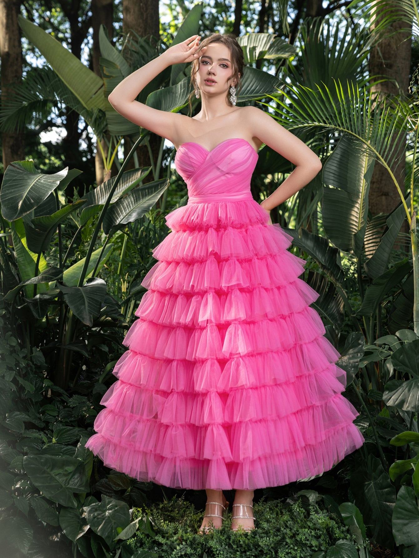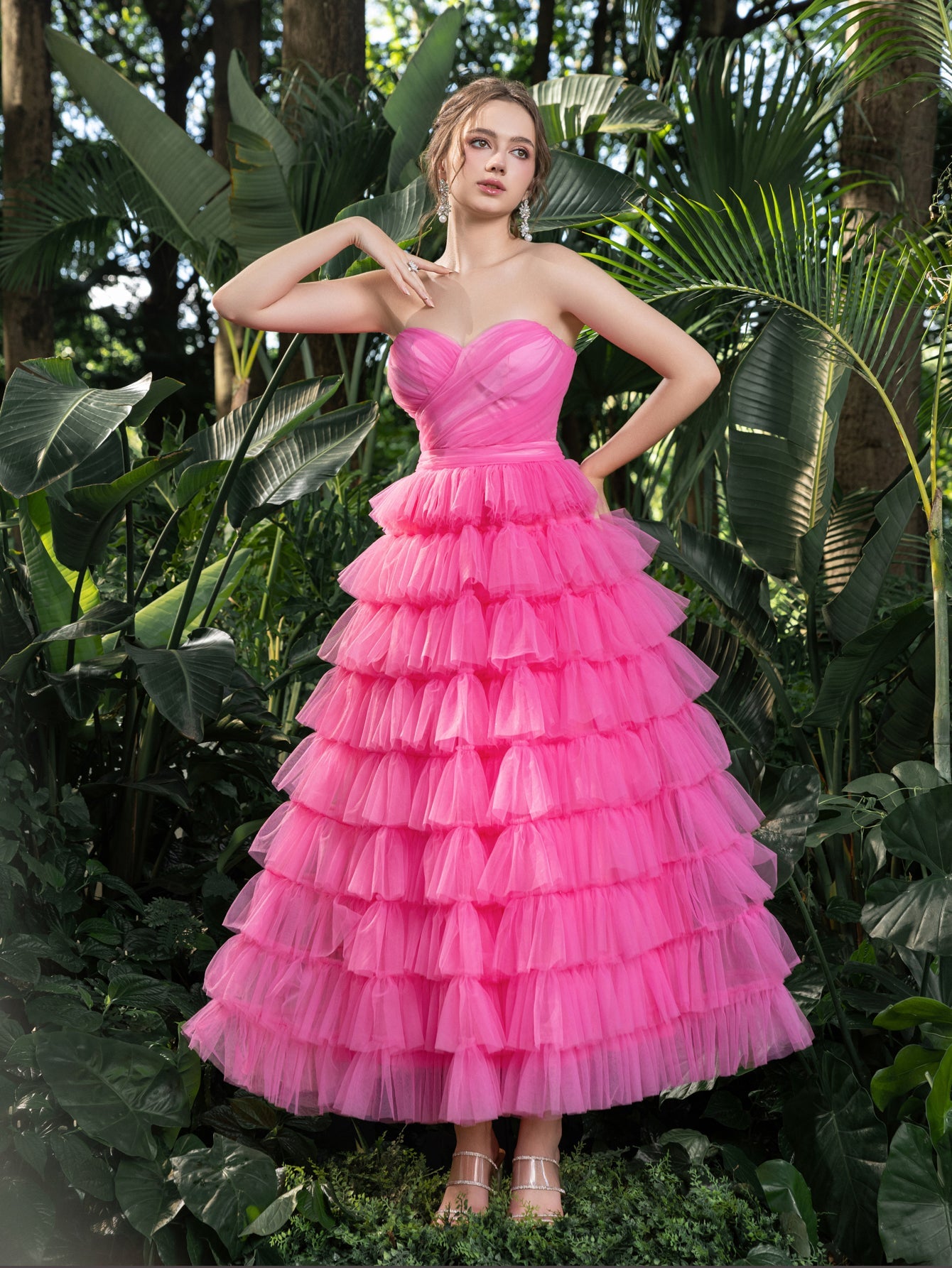 ✨ Breathtaking Volume & Elegance: This strapless tulle gown captivates with its dramatic ruffled layers and a flowing A-line silhouette. The cascading pleats create a sense of opulence, while the fitted bodice add sophistication, balancing femininity with boldness. Designed for movement, the lightweight tulle flows gracefully in tropical breezes.