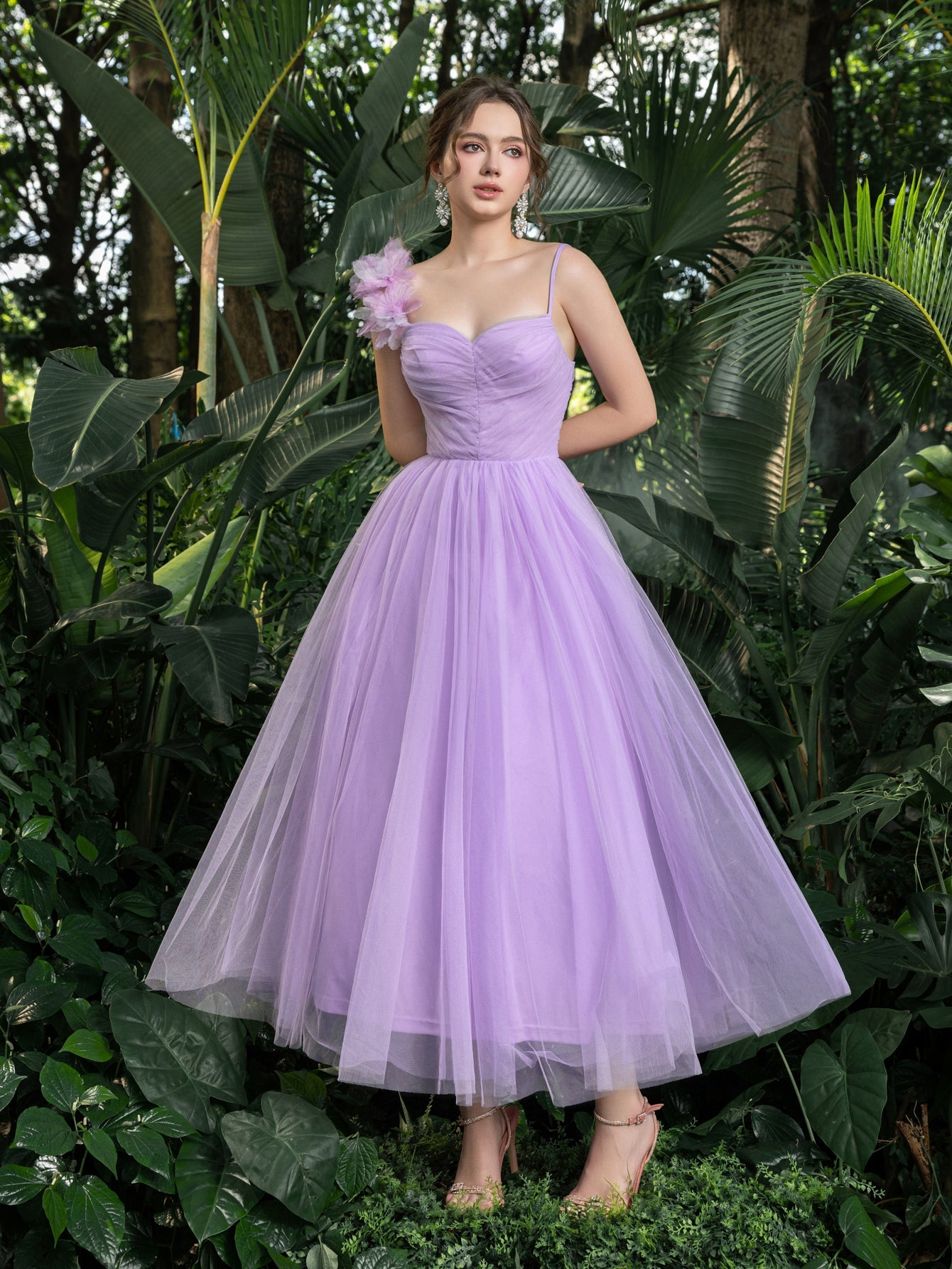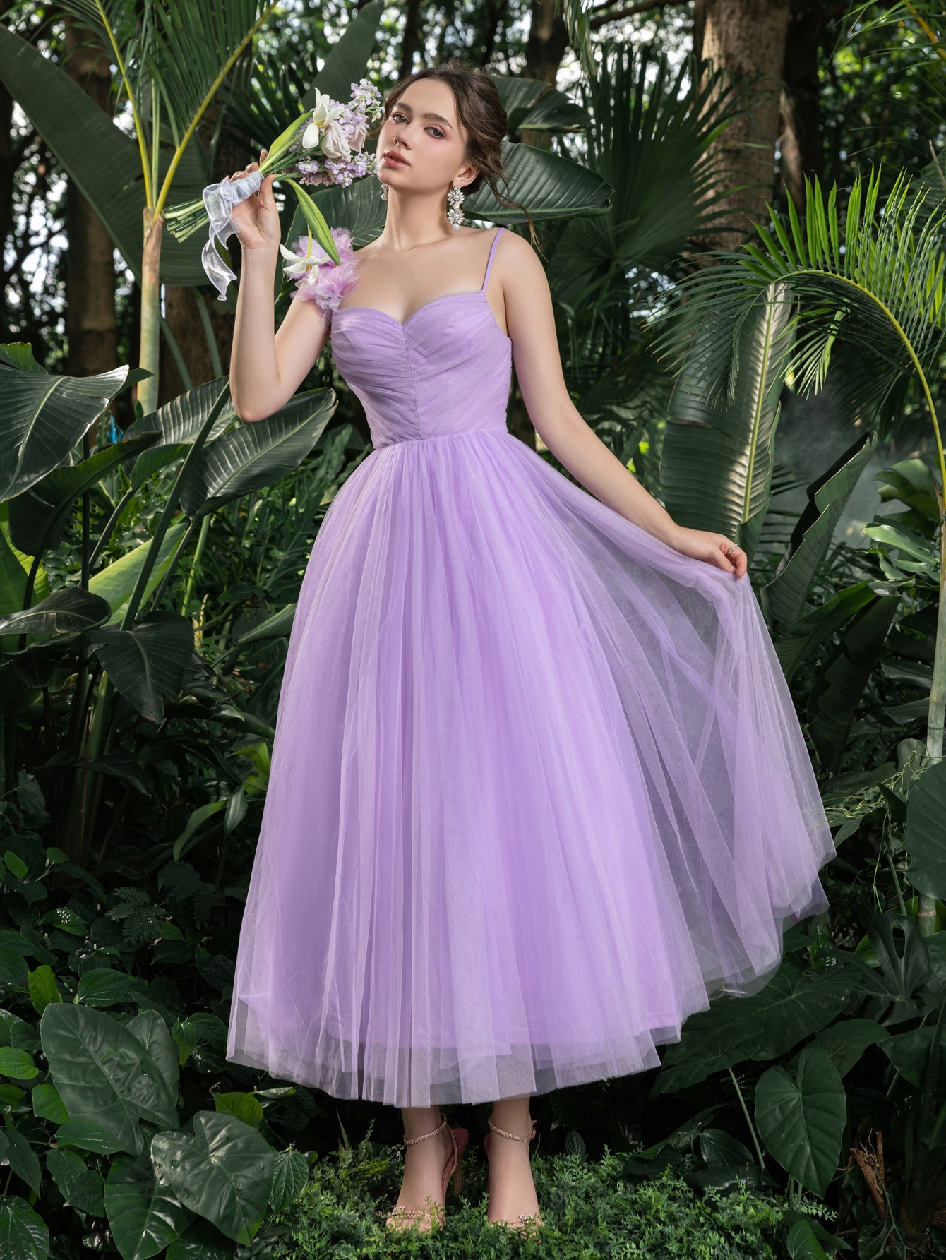 ✨ Enchanting Fairytale Silhouette: This tulle midi gown combines timeless romance with modern elegance. The sweetheart neckline and fitted bodice sculpt the waistline, while the voluminous layered skirt flows like a cascading garden bloom.