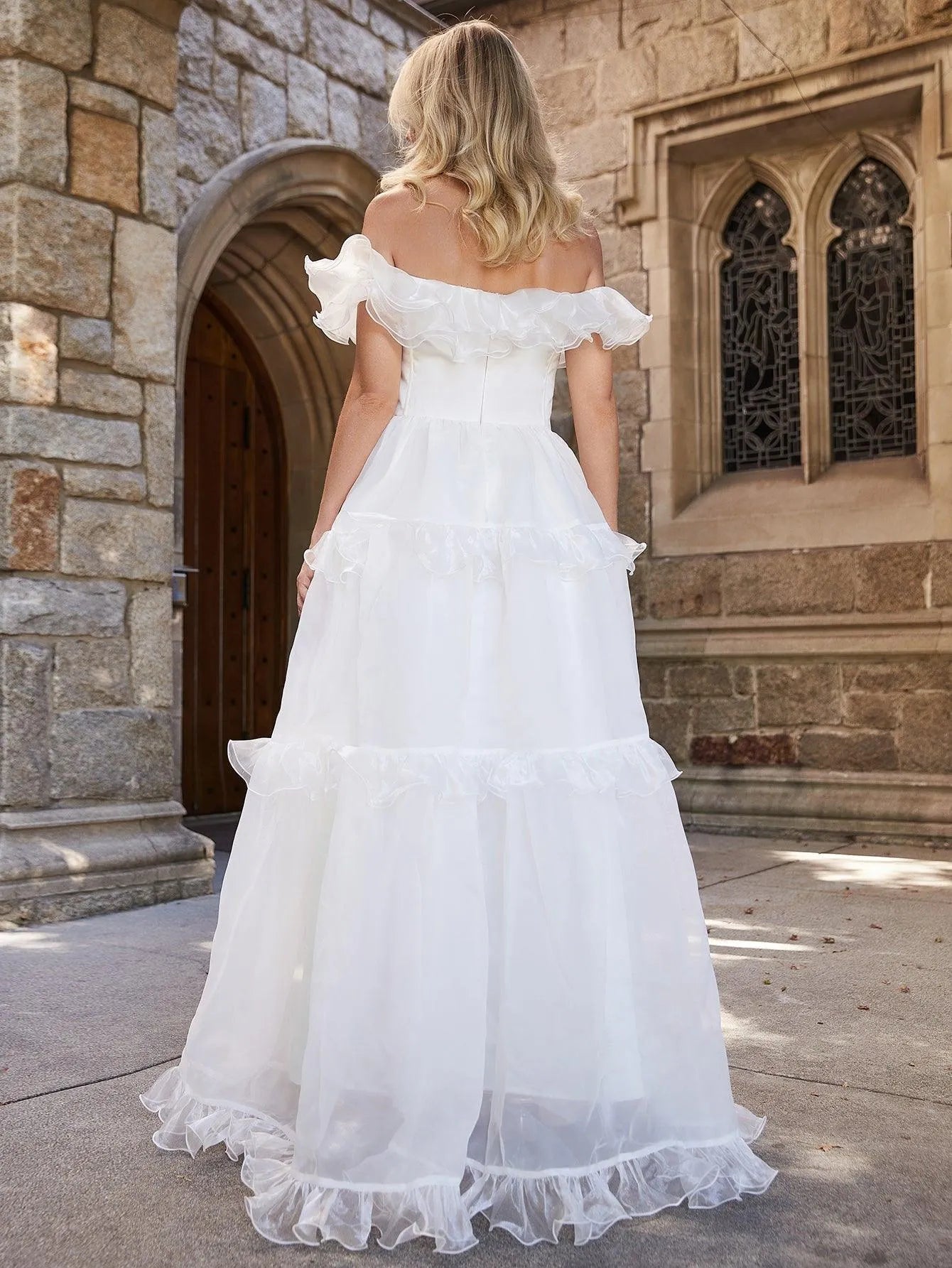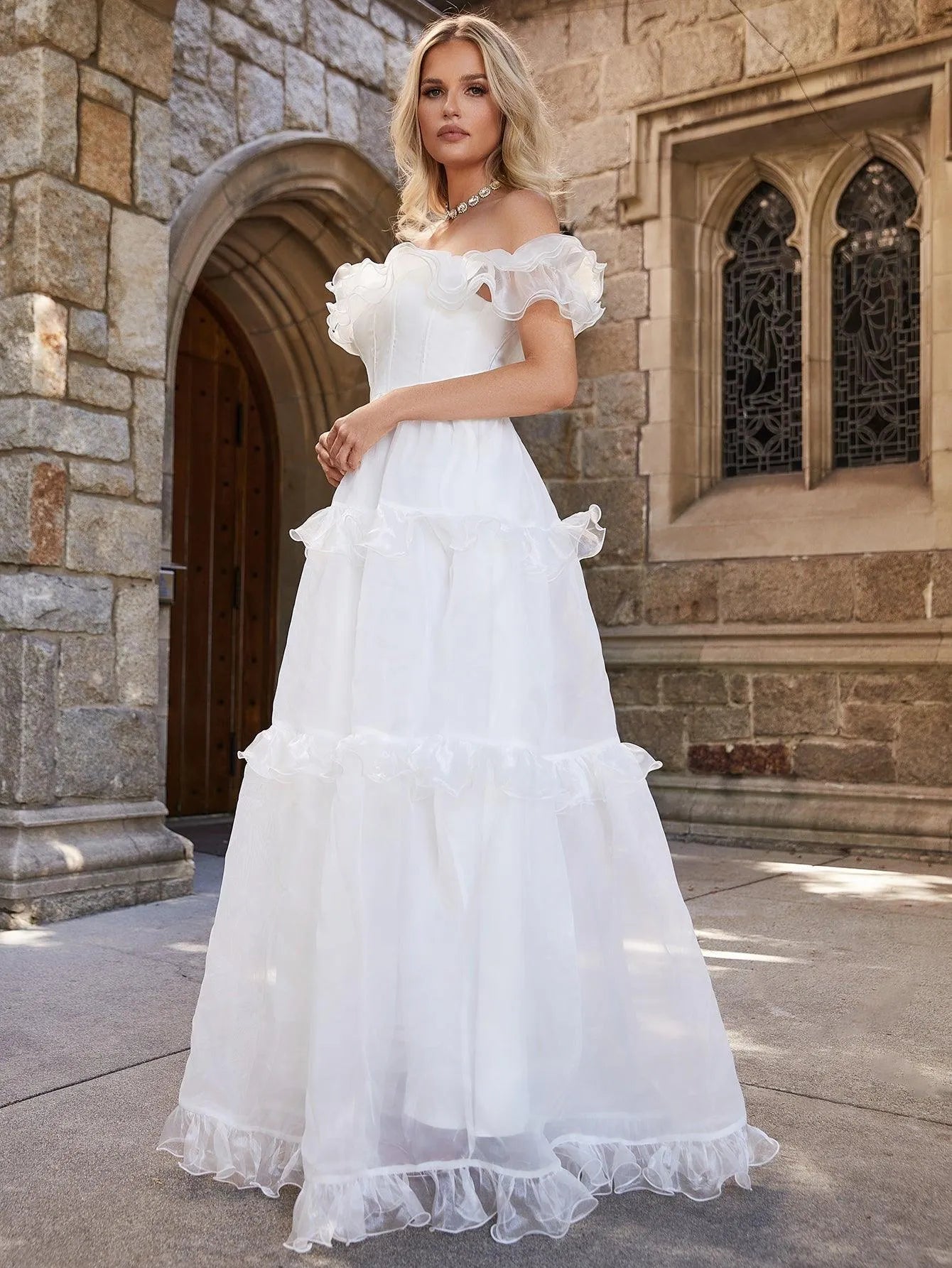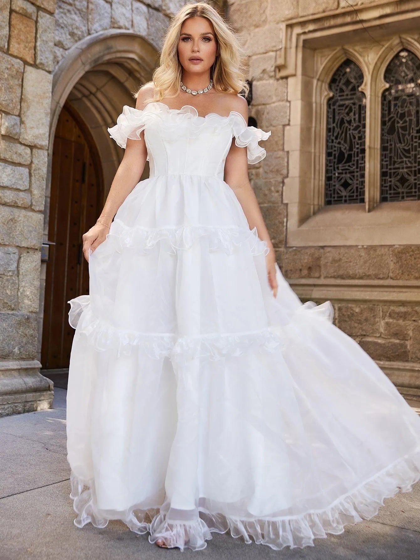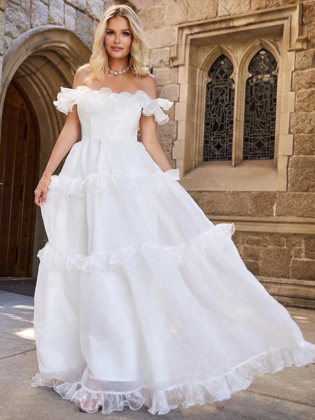 A romantic reverie brought to life, this enchanting bridal gown is a true vision of fairy-tale grace. The off-the-shoulder ruffles add a touch of soft, poetic charm, framing the bride's shoulders with a cascade of delicate tulle. The bodice, fitted and structured, gives way to a tiered skirt that flows with whimsical ease, each layer edged with playful ruffles that dance in the light. This gown captures the essence of youthful romance, its full silhouette echoing the timeless stories of love's sweet innocence. Ideal for a storybook ceremony, this dress is a celebration of love at its most joyful and carefree.