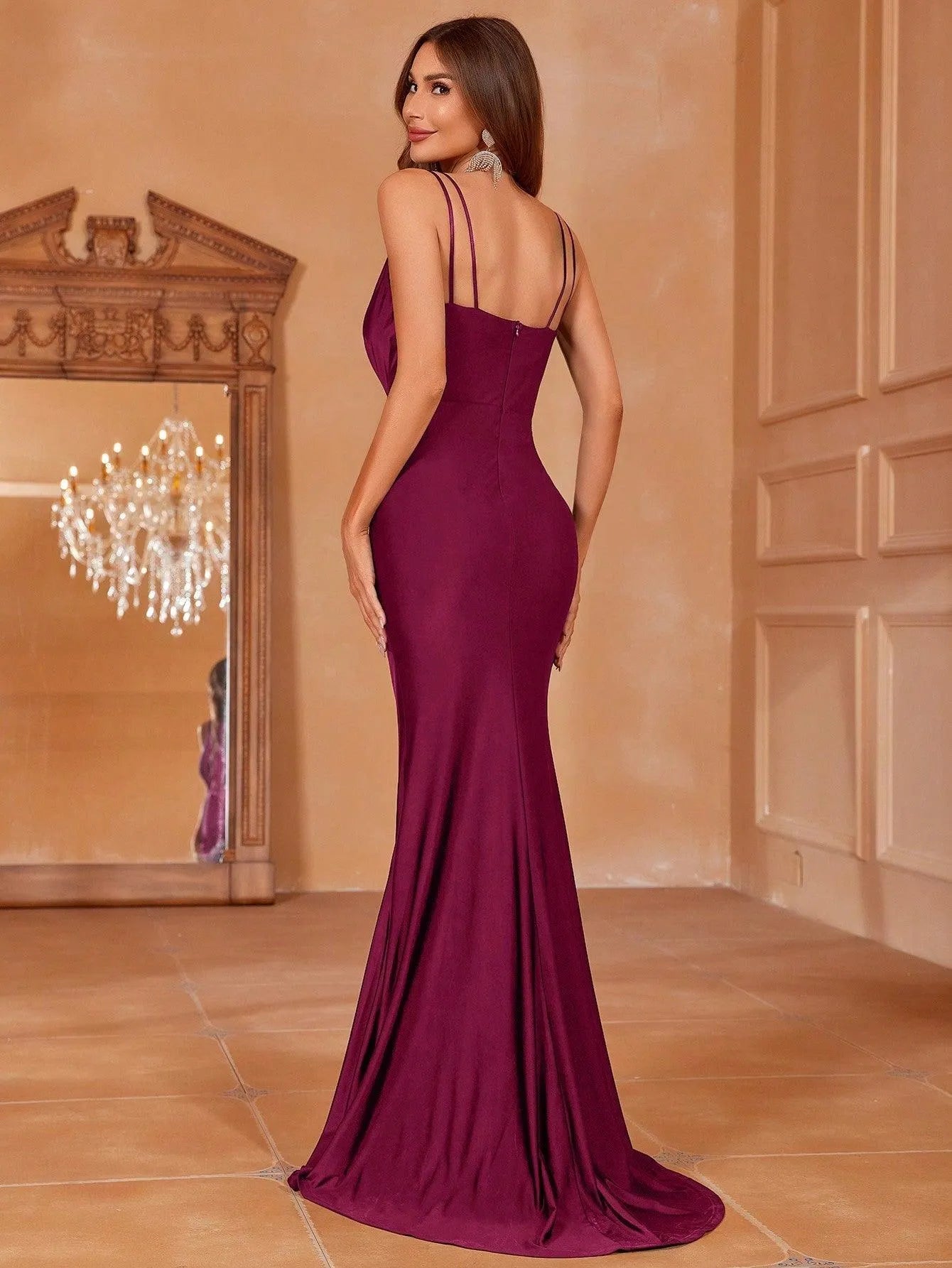Define your evening with the sleek sophistication of our black evening gown, a flawless combination of allure and elegance. This statuesque piece features a plunging neckline tempered by a sheer inset, offering a bold yet tasteful statement. The fitted bodice flows into a graceful mermaid silhouette, culminating in a court train that whispers elegance with each step. Strategic ruching at the waist enhances the figure, while the daring thigh-high slit promises a striking reveal of leg as you move. The gown's slender straps cross delicately at the back, creating an alluring open design that is sure to captivate. Perfect for upscale galas, red-carpet events, or any night where glamour is a must, this dress is a testament to timeless style and seductive charm.
