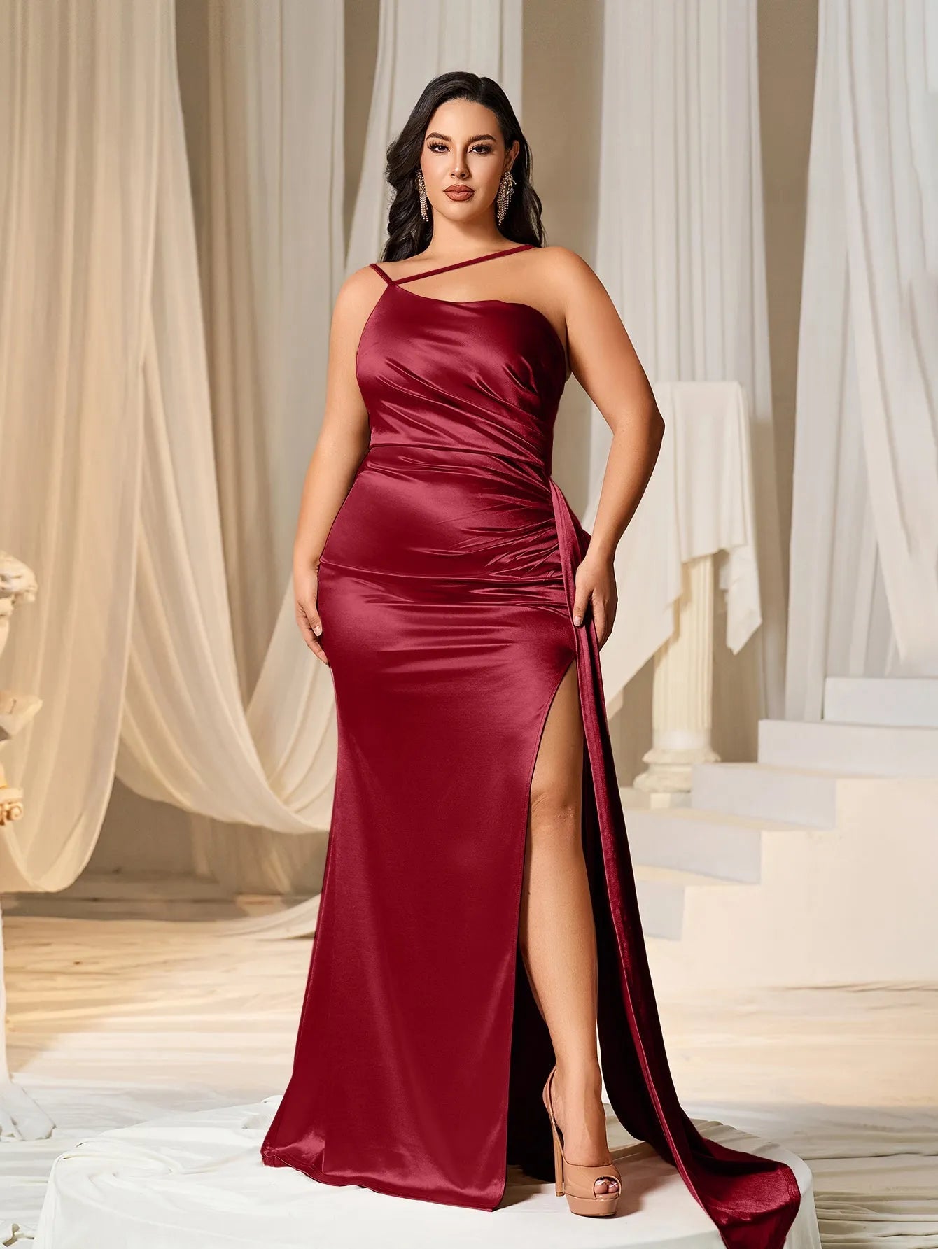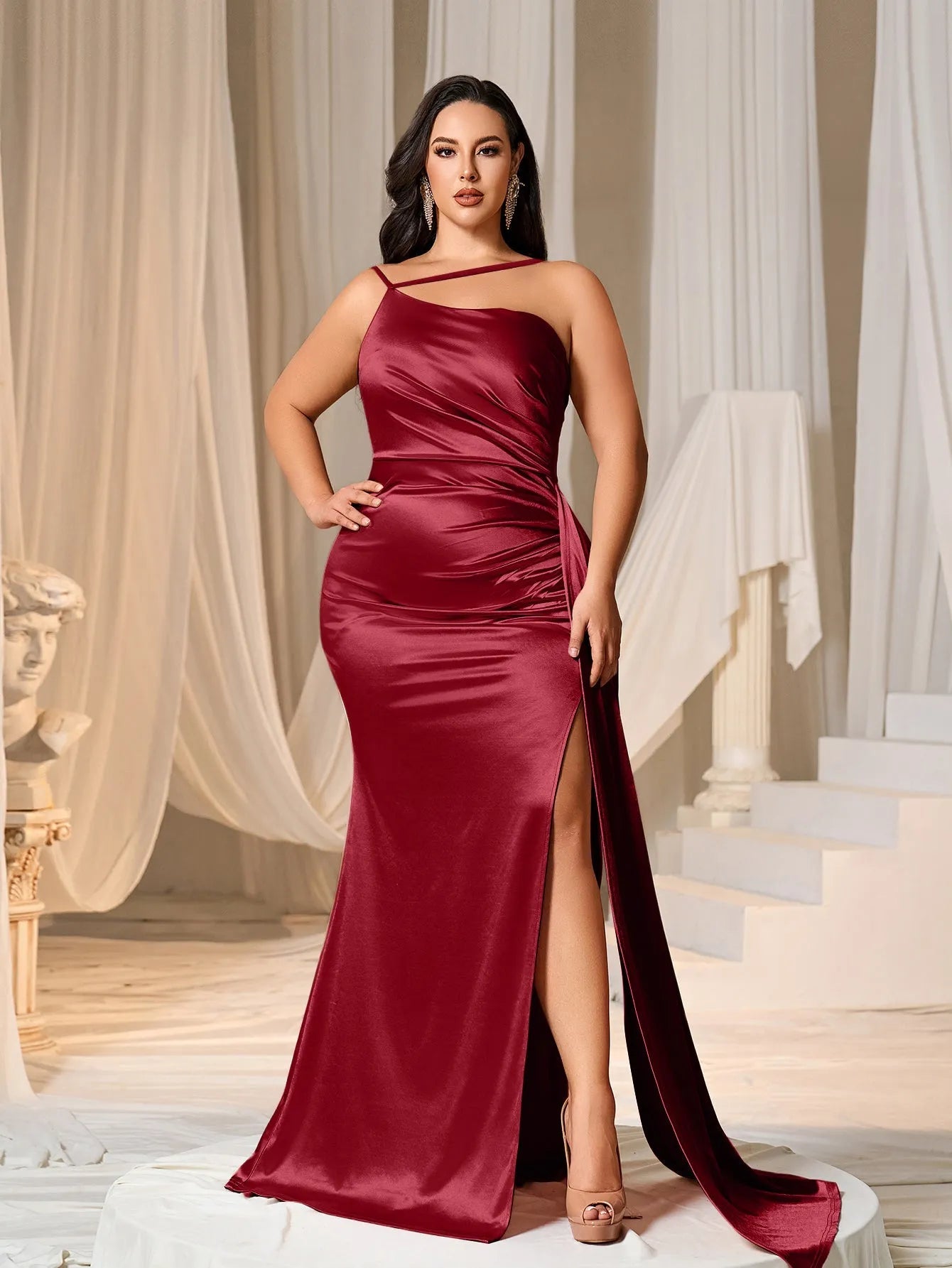 Steal the spotlight with this luxurious satin evening gown. The gown features a stunning one-shoulder neckline that exudes elegance and sophistication. The draped bodice enhances your natural curves, while the high slit adds a daring touch to your look. The flowing skirt provides graceful movement, perfect for making a grand entrance at any event. Ideal for formal events, evening galas, and special occasions, this gown promises to make you the center of attention.