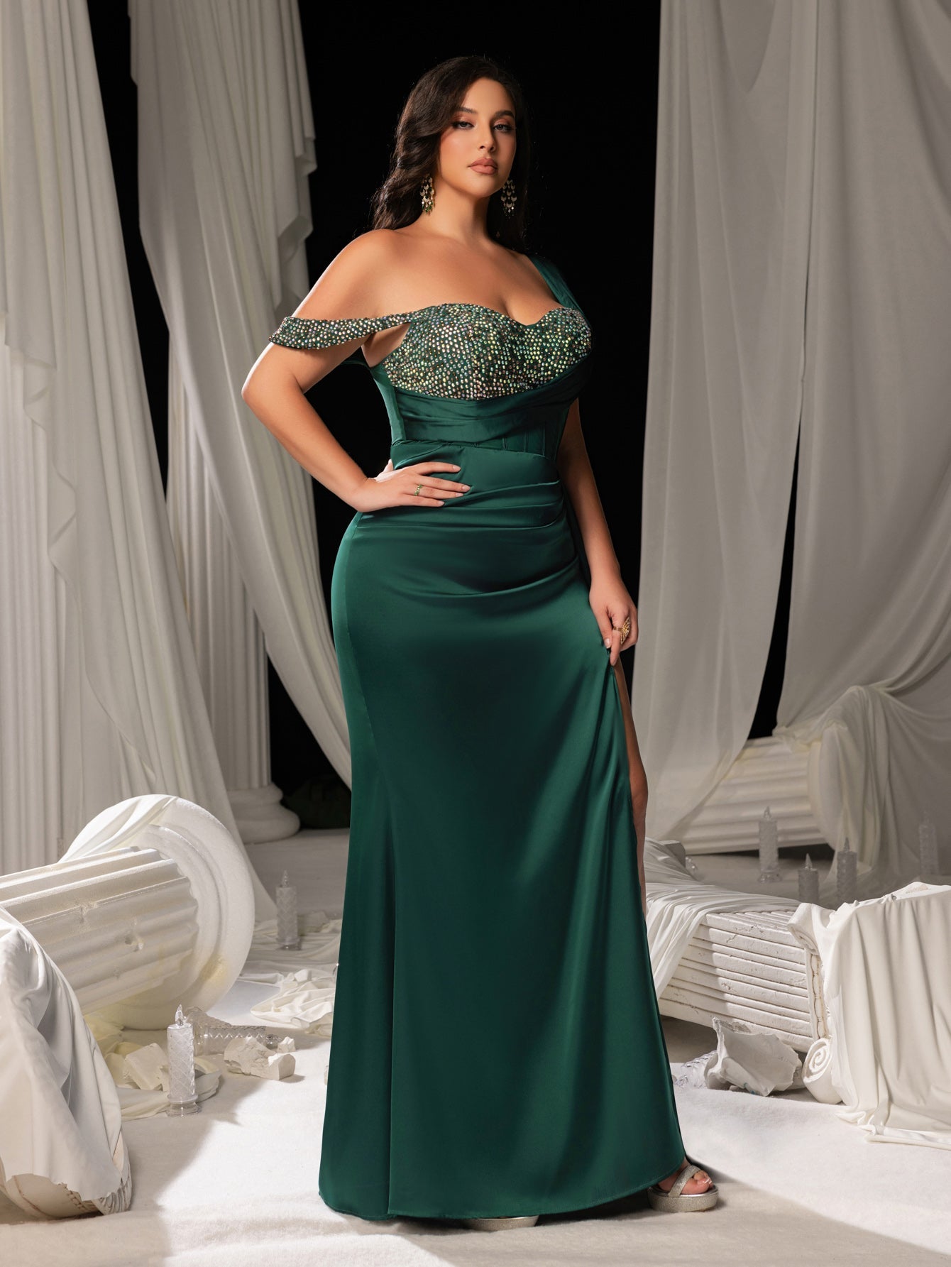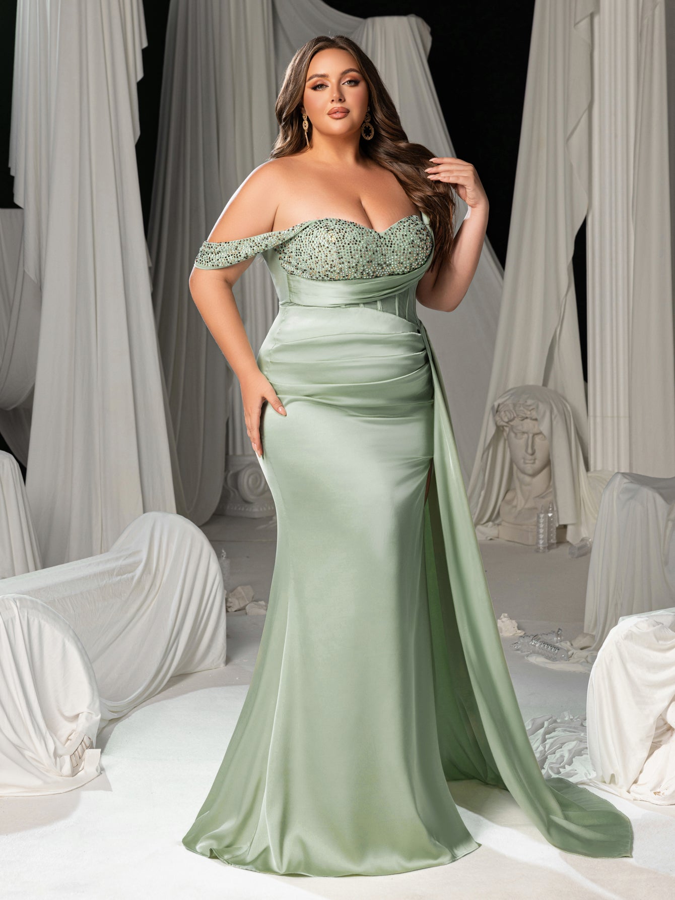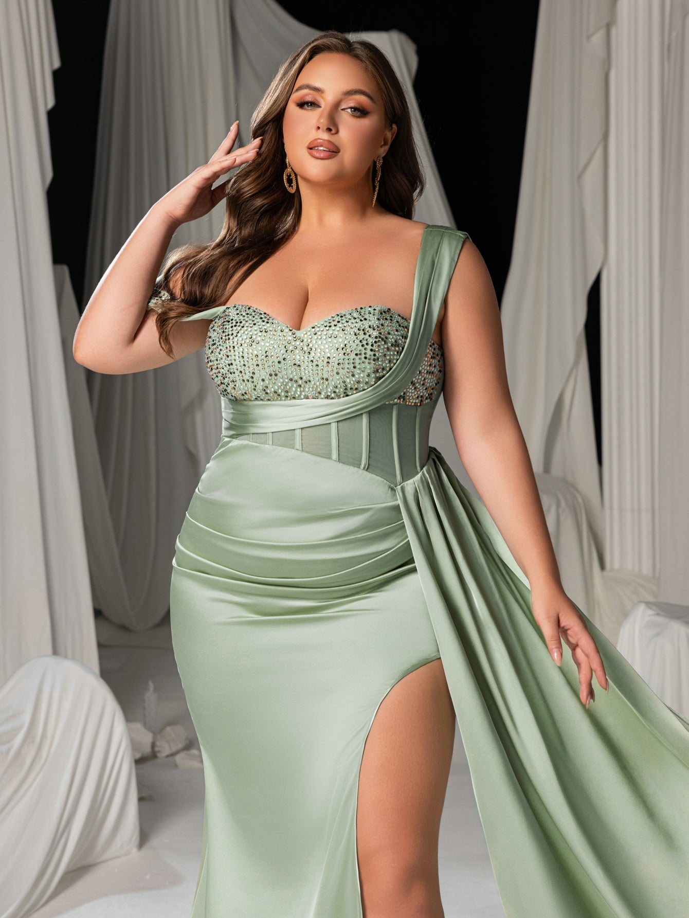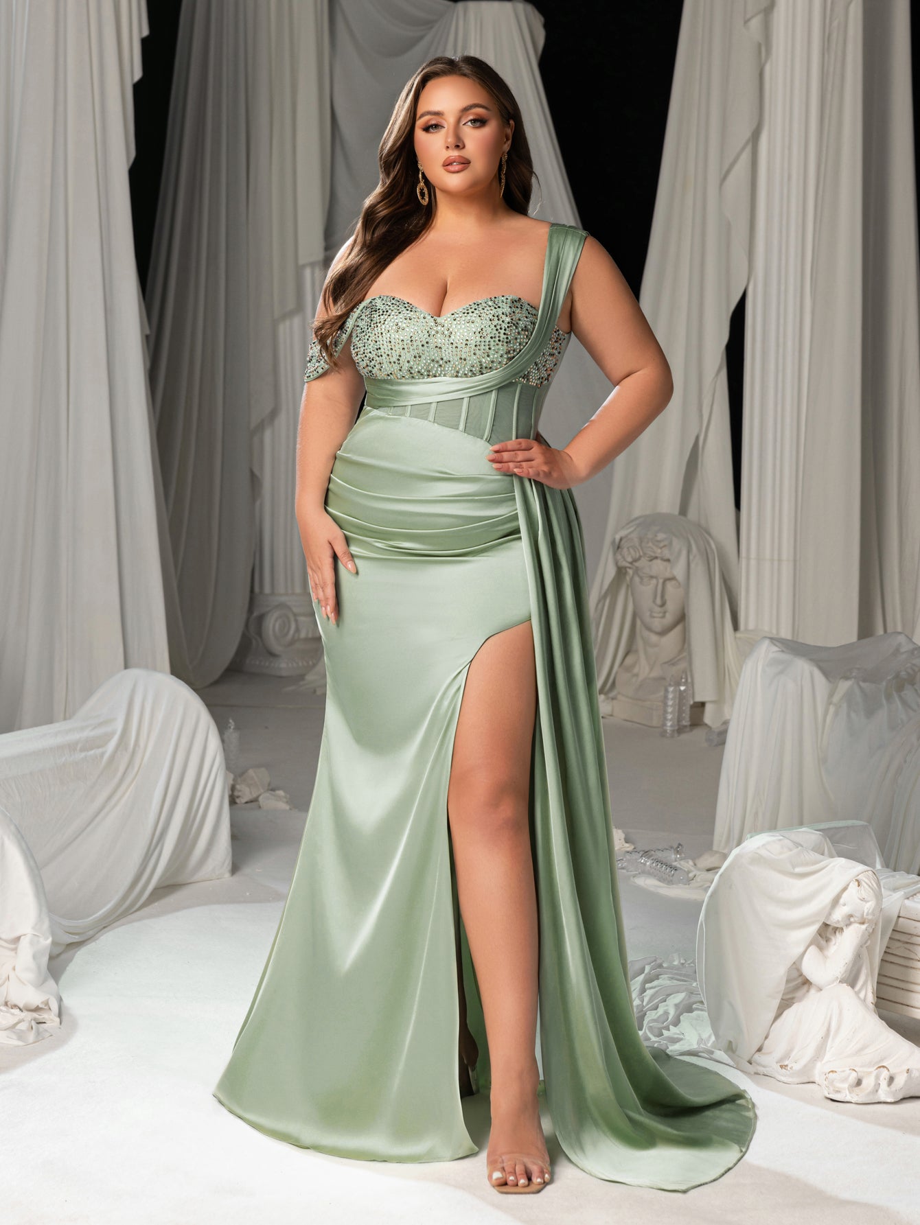Plus Asymmetrical Neck Split Thigh Satin Mermaid Dress Evening Dress