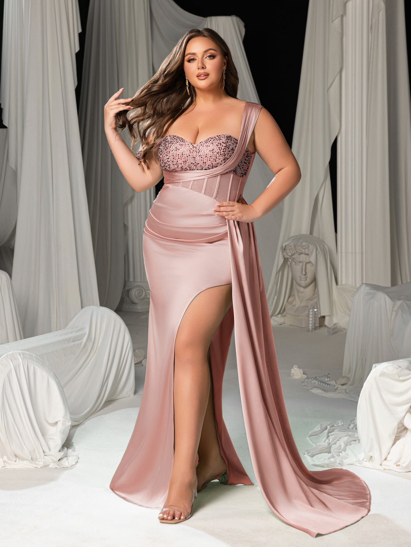 • Design: One-shoulder neckline with a fitted bodice, intricate sequins, dramatic thigh-high slit, and flowing draped panel