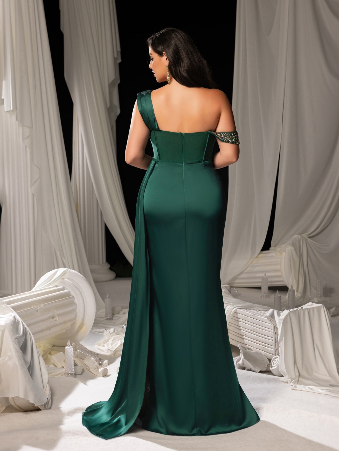 Turn heads at your next event with this luxurious one-shoulder evening gown. Designed for those who love to make a statement, this dress features an elegant one-shoulder neckline and a fitted bodice adorned with intricate sequins that beautifully accentuates your curves. The floor-length silhouette is enhanced with a dramatic thigh-high slit and a flowing draped panel, adding a touch of modern sophistication. Perfect for galas, red carpet events, or any special occasion, this gown combines classic glamour with contemporary style.