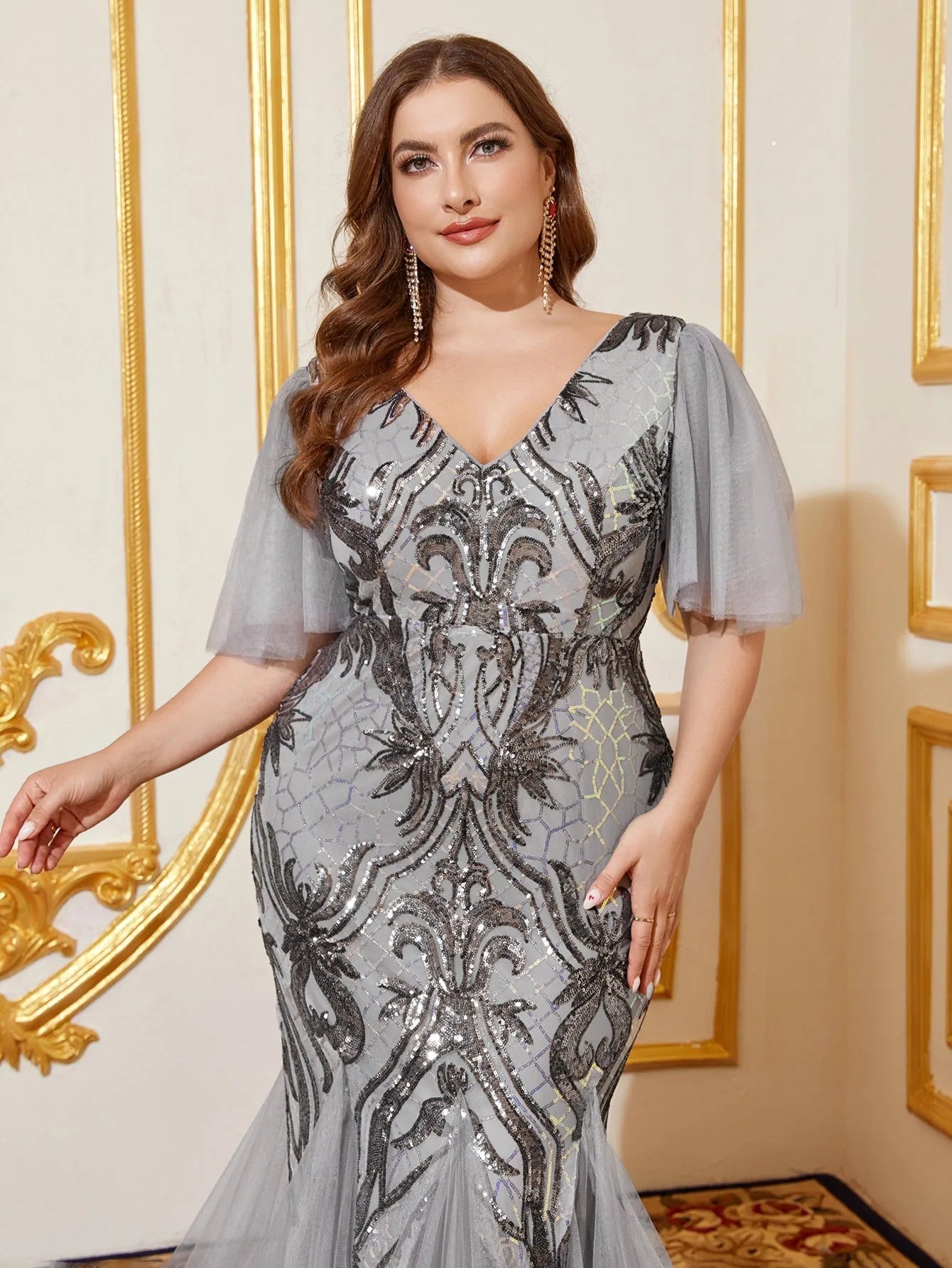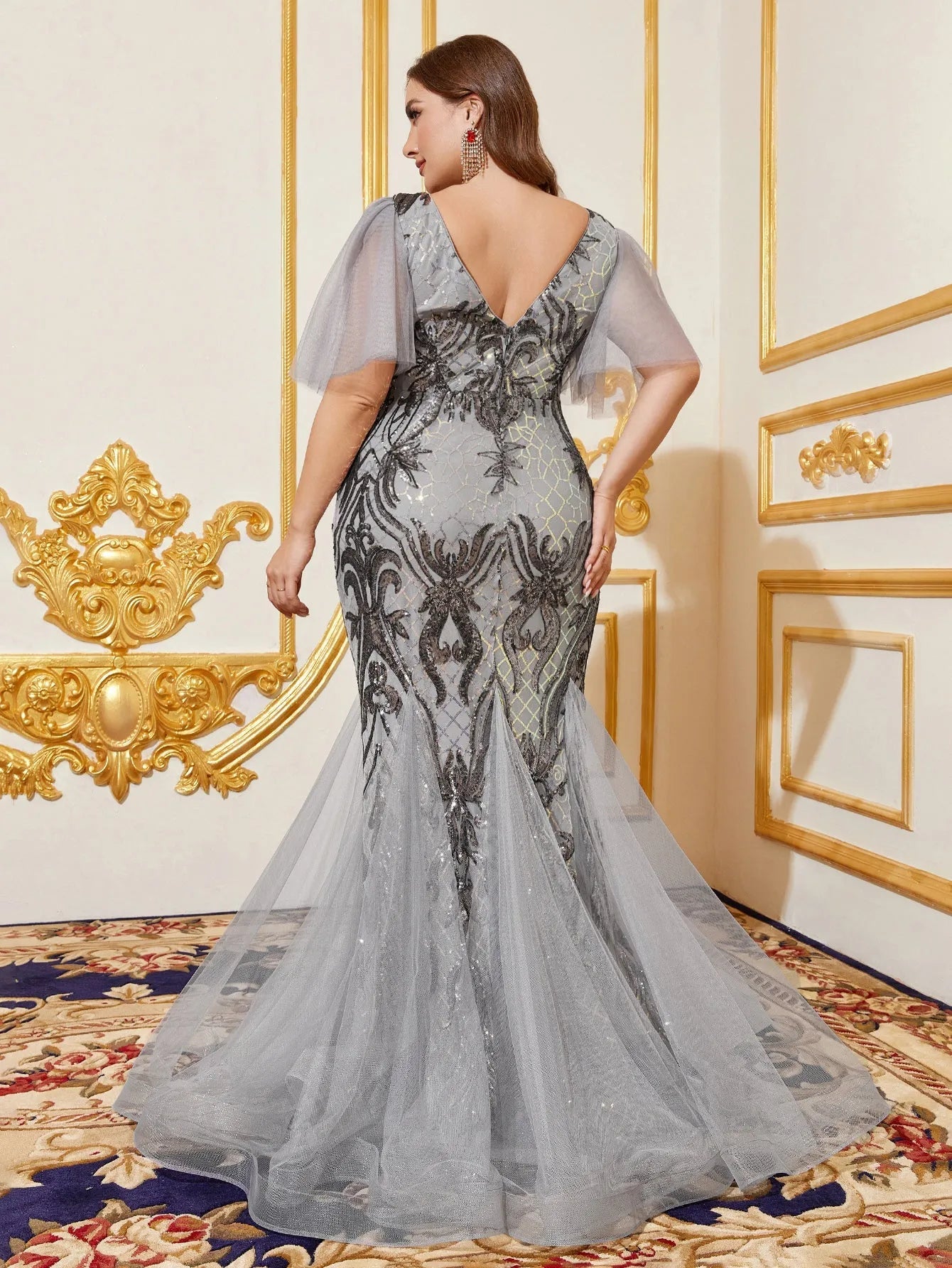 Step into elegance with this captivating evening gown, designed to make an unforgettable statement. Featuring a luxurious combination of sequins overlaid on soft gray tulle, this dress offers a striking contrast and a refined silhouette. The gown’s fitted bodice elegantly transitions into a flared mermaid skirt, enhanced by delicate tulle layers that create a soft and graceful train.