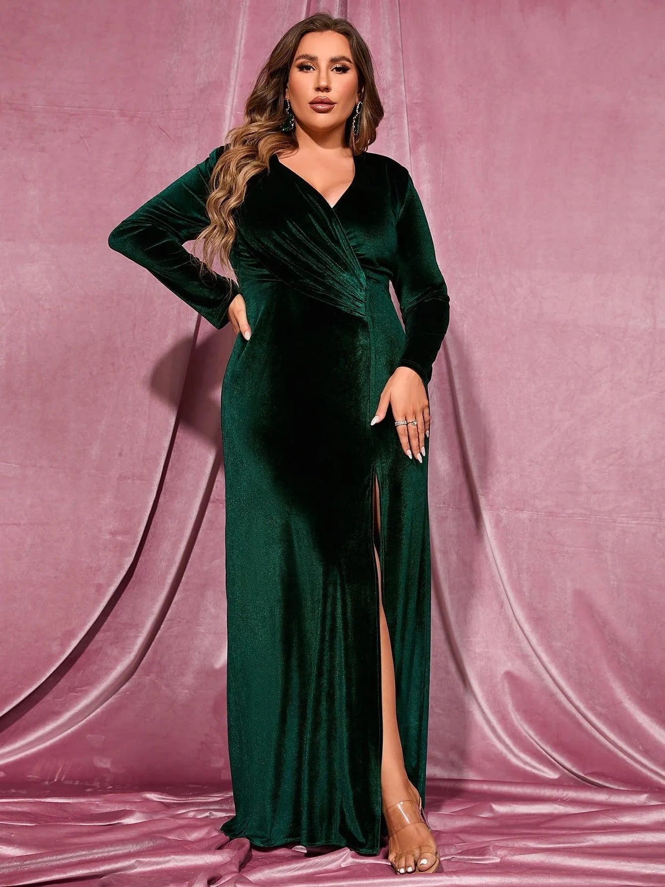 Channel elegance and timeless sophistication with this Plus Size V-Neck Long Sleeve Velvet Slit Dress. Crafted from luxurious velvet fabric, this floor-length gown beautifully enhances your curves while providing a figure-flattering silhouette. The V-neck design paired with long sleeves exudes understated glamour, perfect for colder evening events. A daring thigh-high slit adds just the right amount of allure, making this dress a showstopper for any formal gathering or black-tie affair.