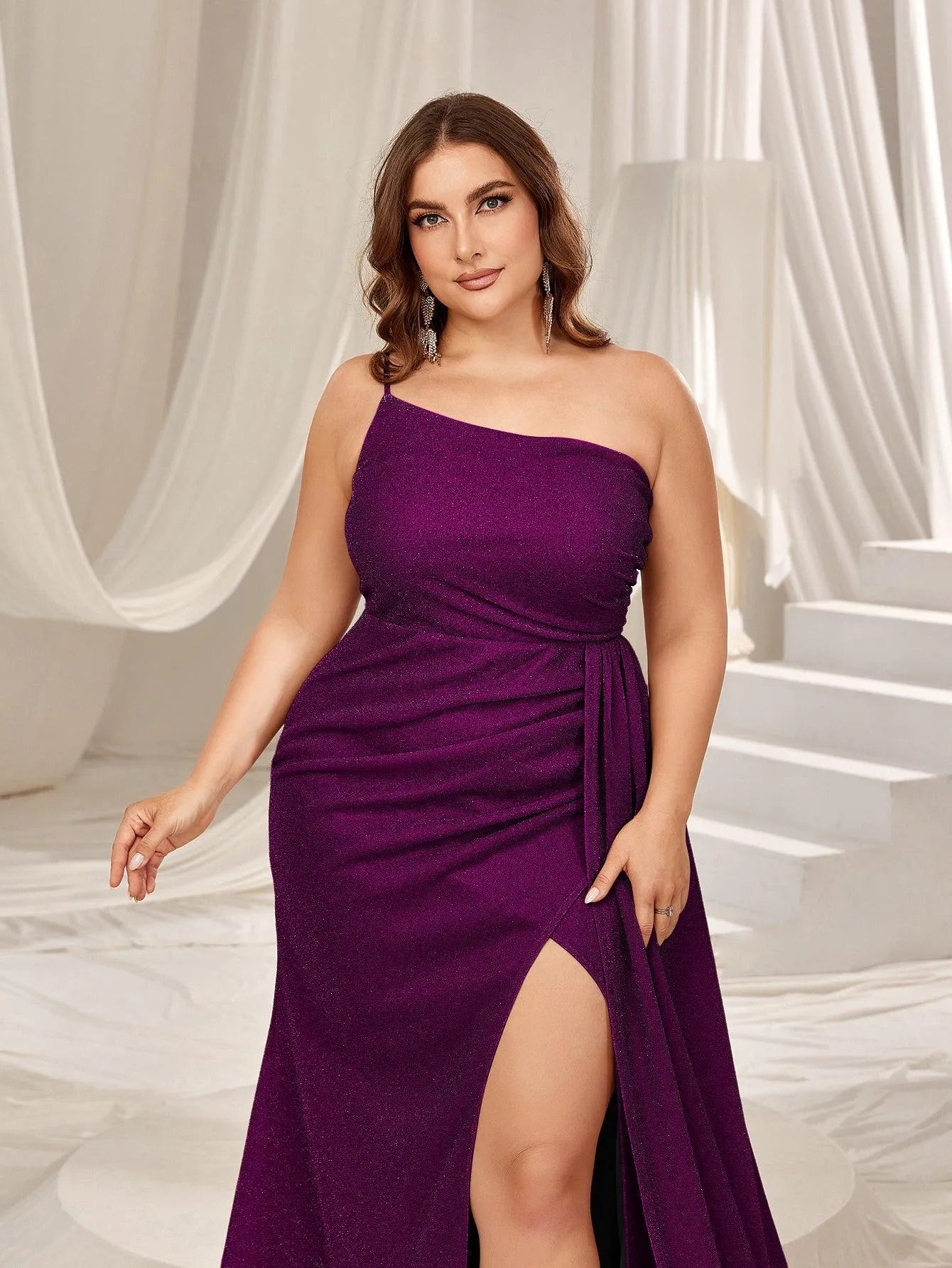 Turn heads at your next event with this luxurious shimmer evening gown. Designed for those who love to make a statement, this dress features an elegant one-shoulder neckline and a fitted bodice that beautifully accentuates your curves. The floor-length silhouette is complemented by a flowing side drape, adding a touch of modern sophistication. Perfect for galas, red carpet events, or any special occasion, this gown combines classic glamour with contemporary style.