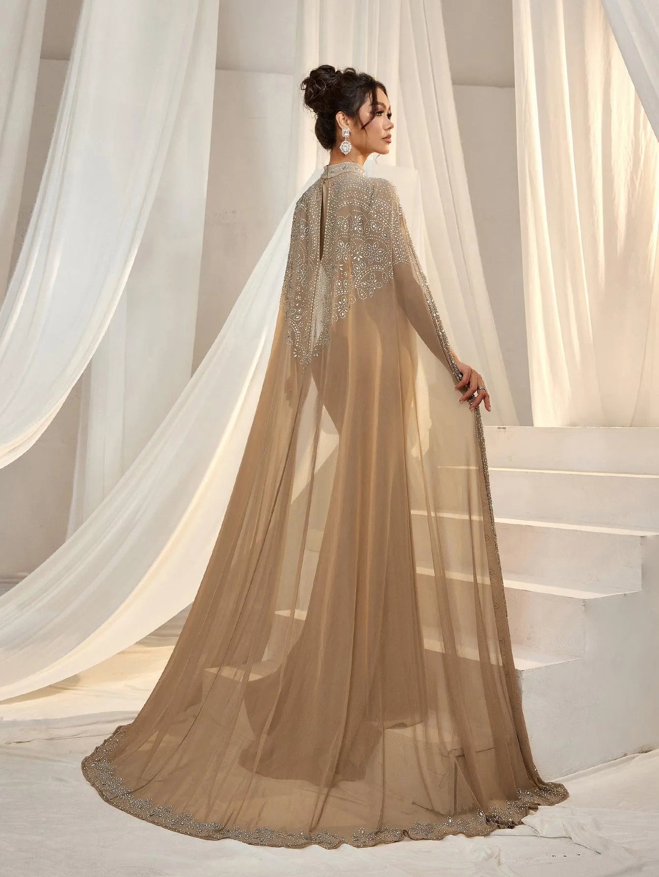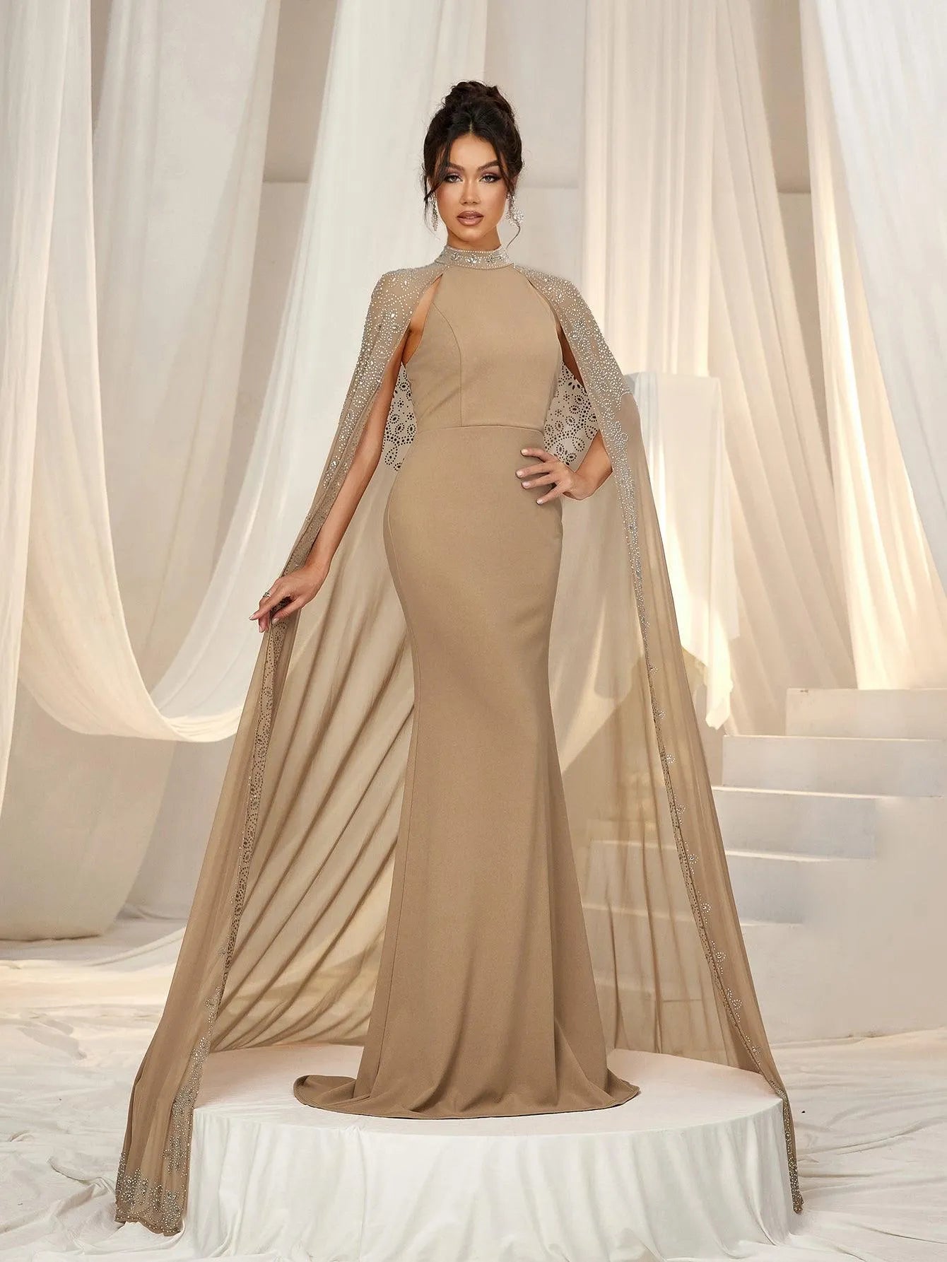 Turn every head at your next event with this captivating evening gown. This gown features a sophisticated high neckline and a fitted bodice that accentuates your curves, ensuring you shine all night long. The dramatic cape, adorned with intricate rhinestones, adds volume and movement, creating a stunning silhouette. The sleek mermaid silhouette offers a touch of allure and sophistication. Perfect for formal events, evening galas, and special occasions, this gown guarantees you make a lasting impression.