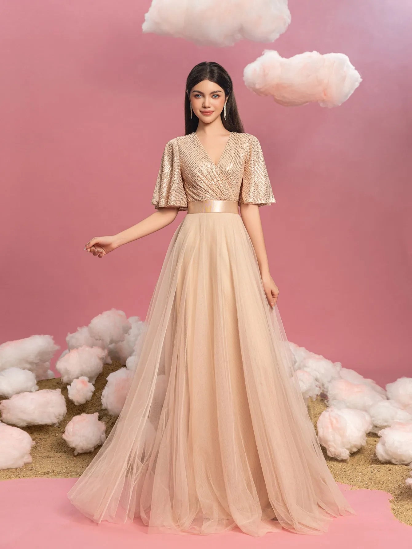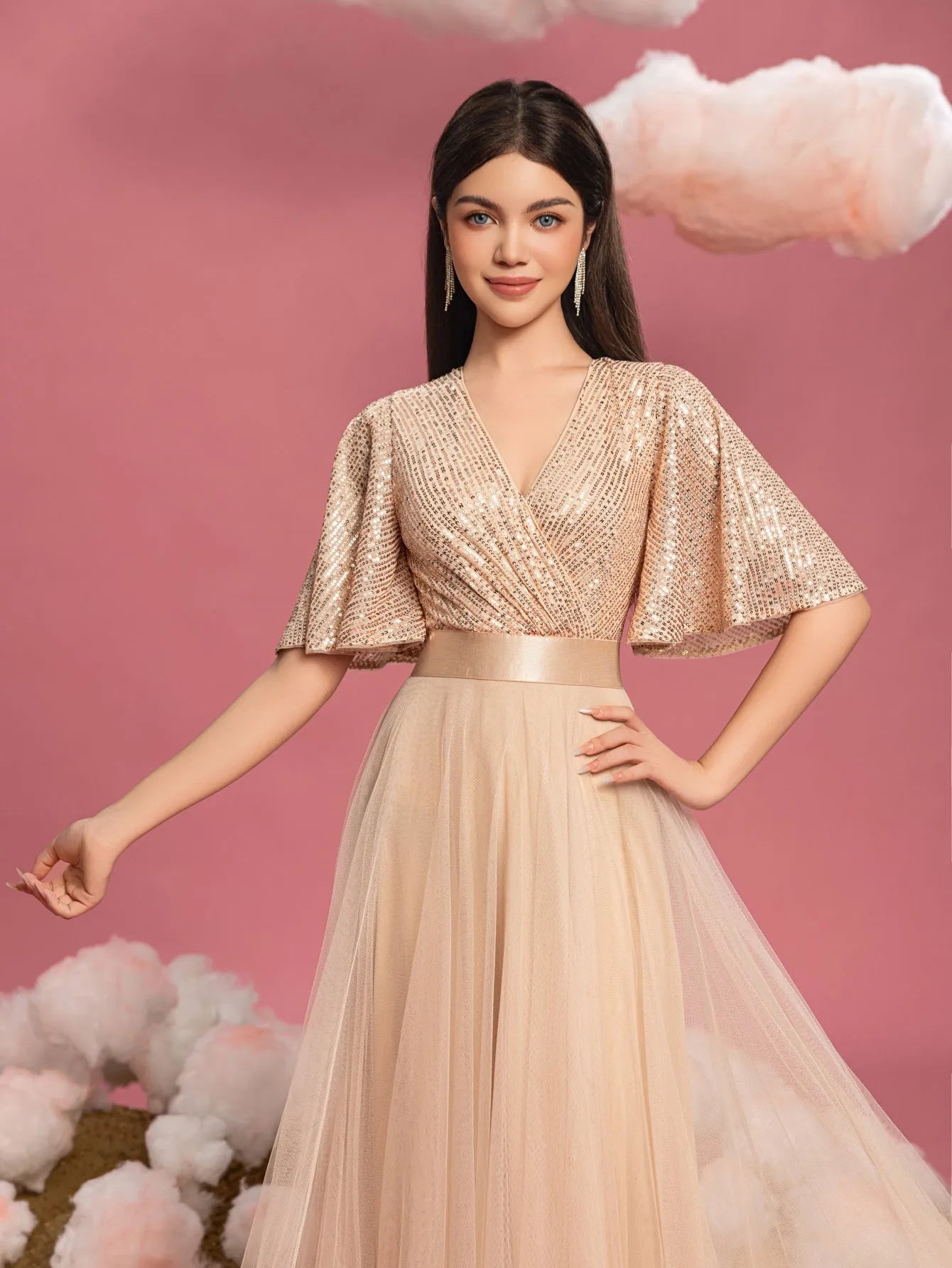Step into elegance with our dreamy A-line gown, designed for those who appreciate a blend of sparkle and softness. This gown features a shimmering sequin bodice with a wrap-style V-neckline, offering a touch of glam to the ensemble. Flowing from the waist, the full tulle skirt creates a delicate and ethereal effect, enhanced by a satin belt that cinches the waist for a flattering silhouette. The elbow-length flutter sleeves add a whimsical touch, making this dress perfect for enchanting occasions.