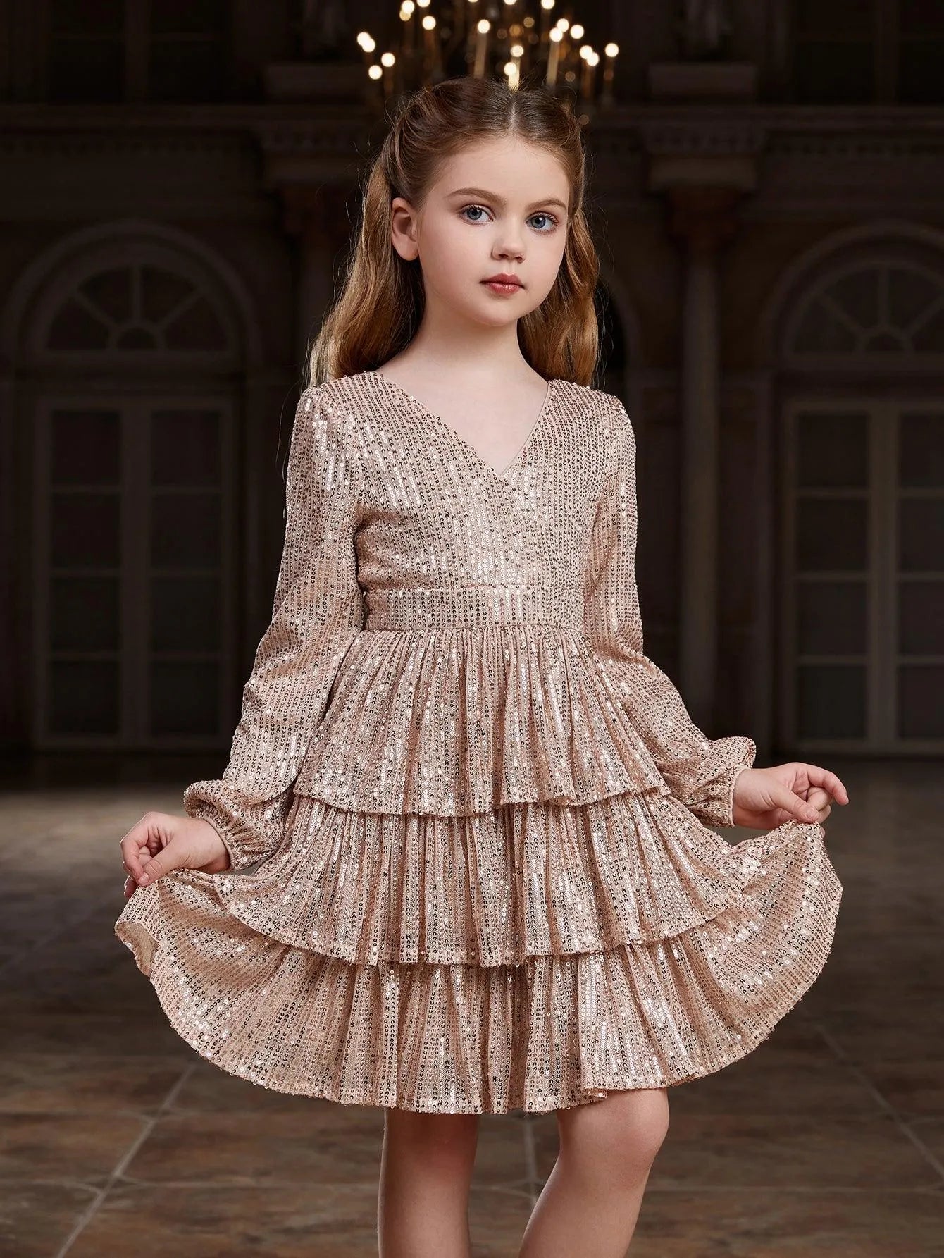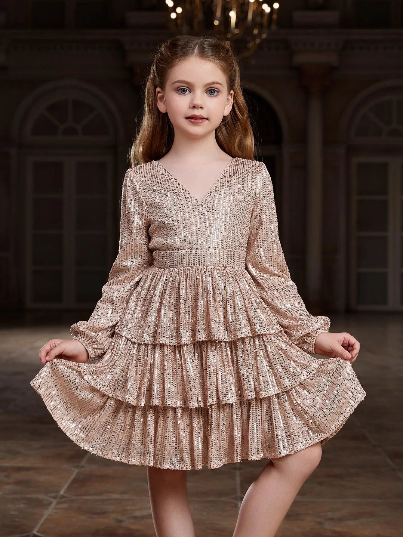 Dazzle at any event with this sparkling sequin dress for girls. The dress features a deep V-neckline and elegant long sleeves, offering a sophisticated yet youthful look. The bodice is beautifully fitted, while the tiered skirt adds playful movement and charm. Each layer is adorned with shimmering sequins that catch the light, making your little one shine bright. Perfect for parties, holidays, and special occasions, this dress combines glamour with comfort, ensuring she feels like a star from every angle. A stunning choice for memorable moments and stylish celebrations.