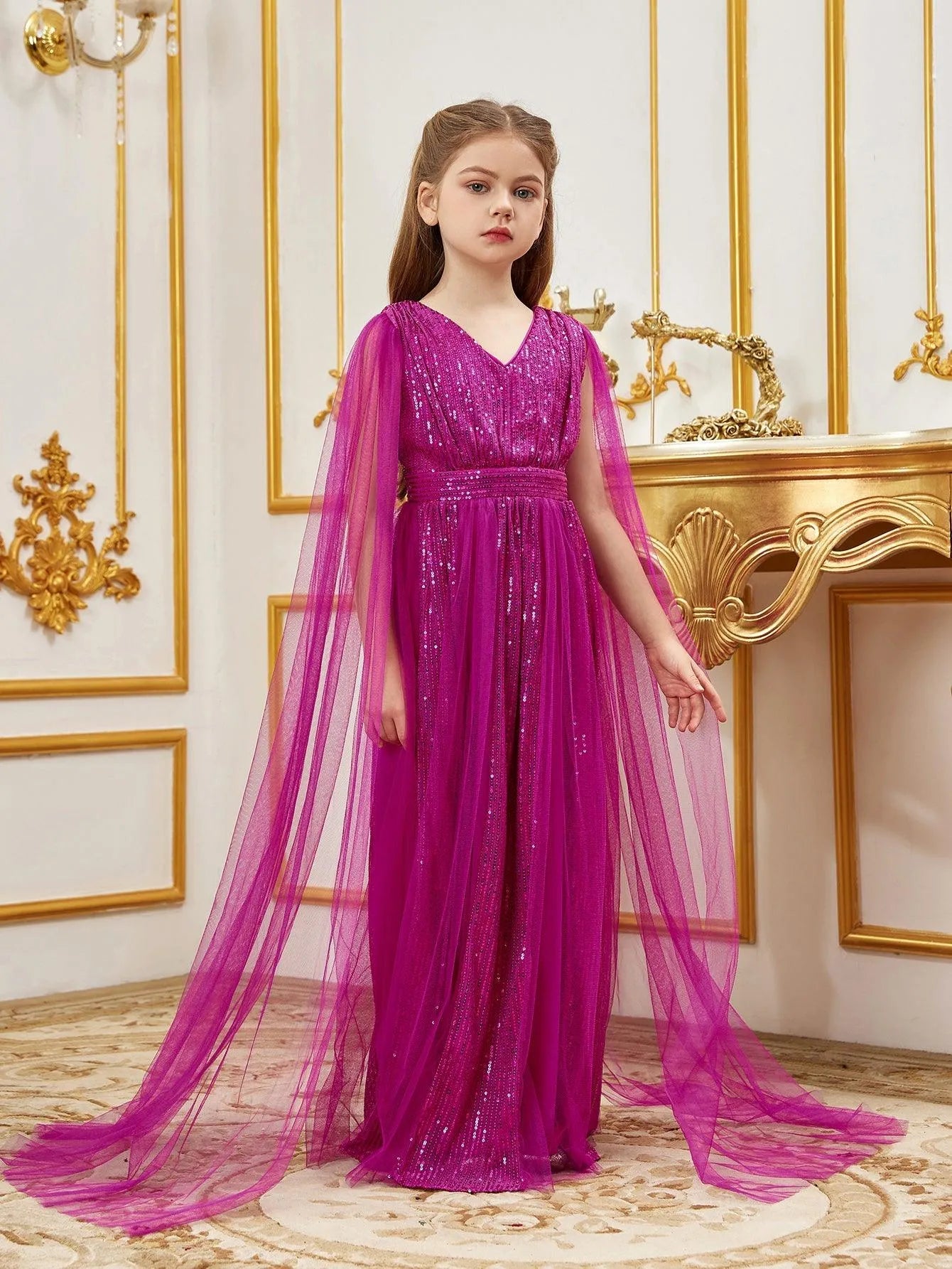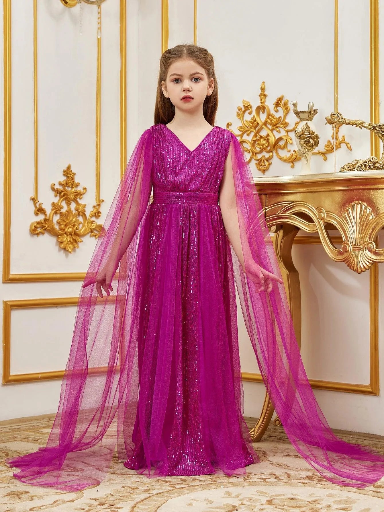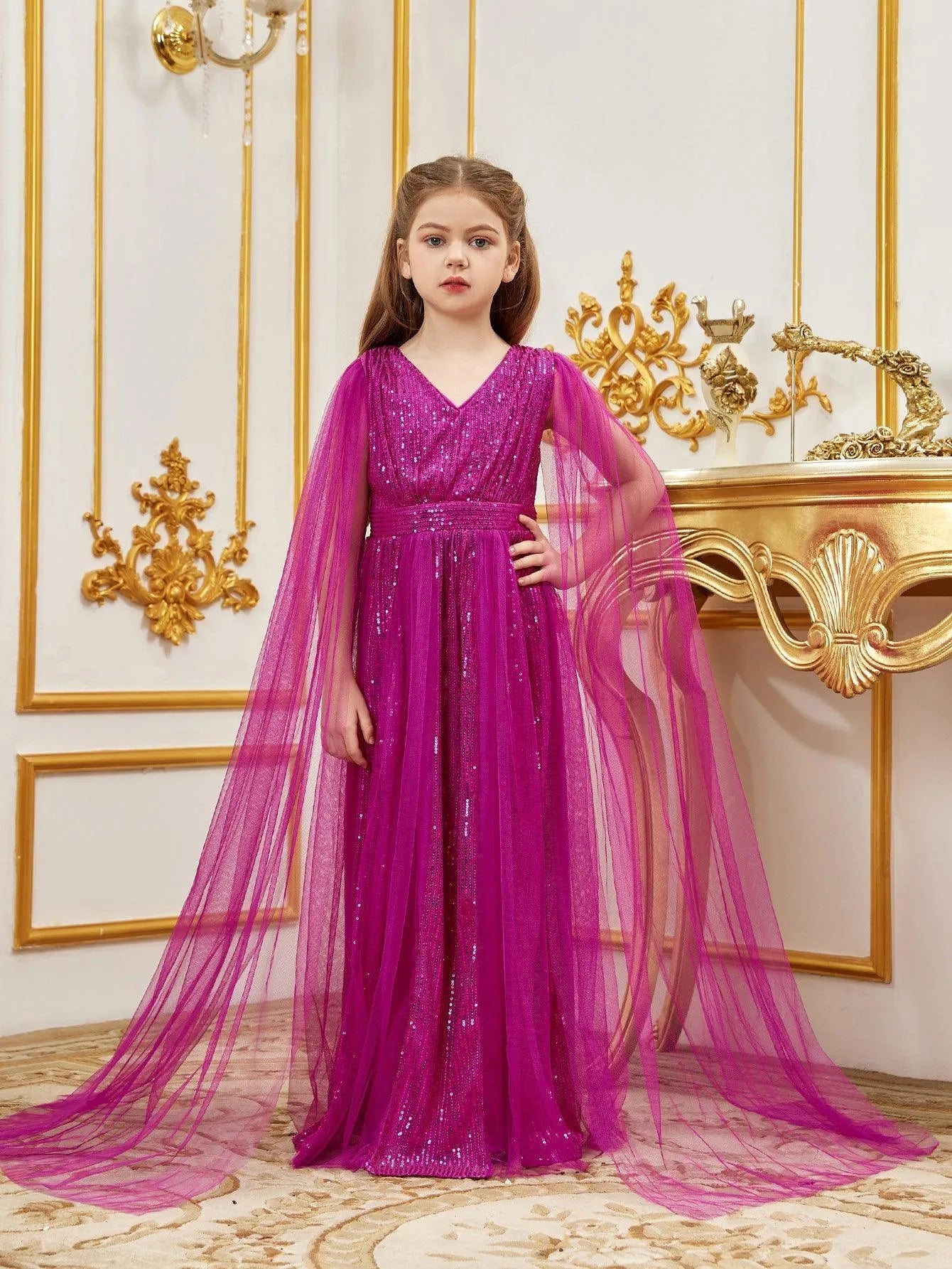 This breathtaking evening gown for young girls exudes elegance and sophistication, perfect for any special occasion. The dress features a fitted bodice adorned with shimmering sequins that create a radiant, sparkling effect. The V-neckline adds a touch of classic refinement, while the floor-length skirt flows gracefully, enhanced by layers of soft tulle that add volume and an ethereal touch. The dress is beautifully accented with long, sheer cape sleeves that drape from the shoulders, providing a dramatic and regal look. Ideal for pageants, formal events, or celebrations, this gown combines luxurious materials and intricate design to ensure your young one stands out with grace and confidence.