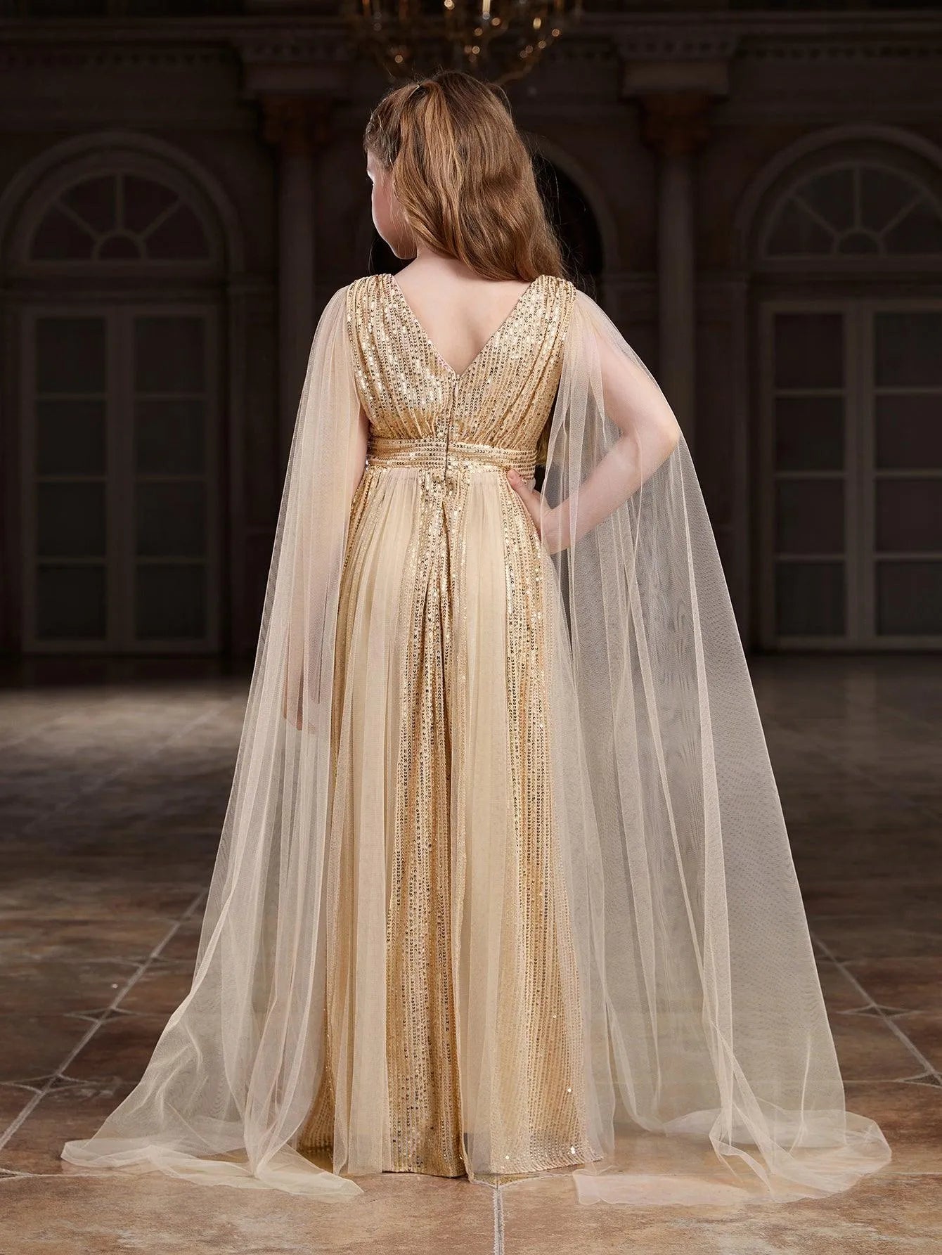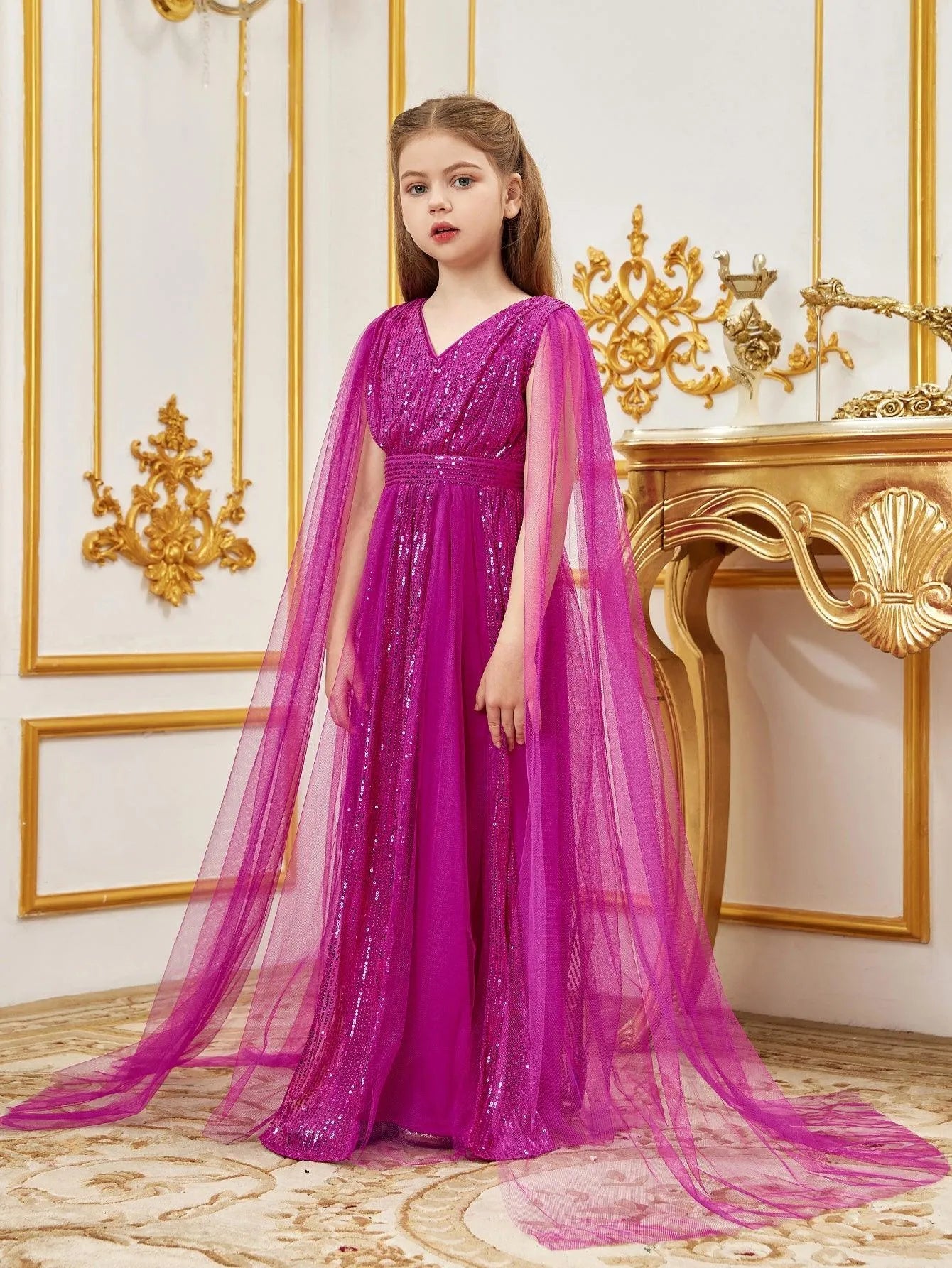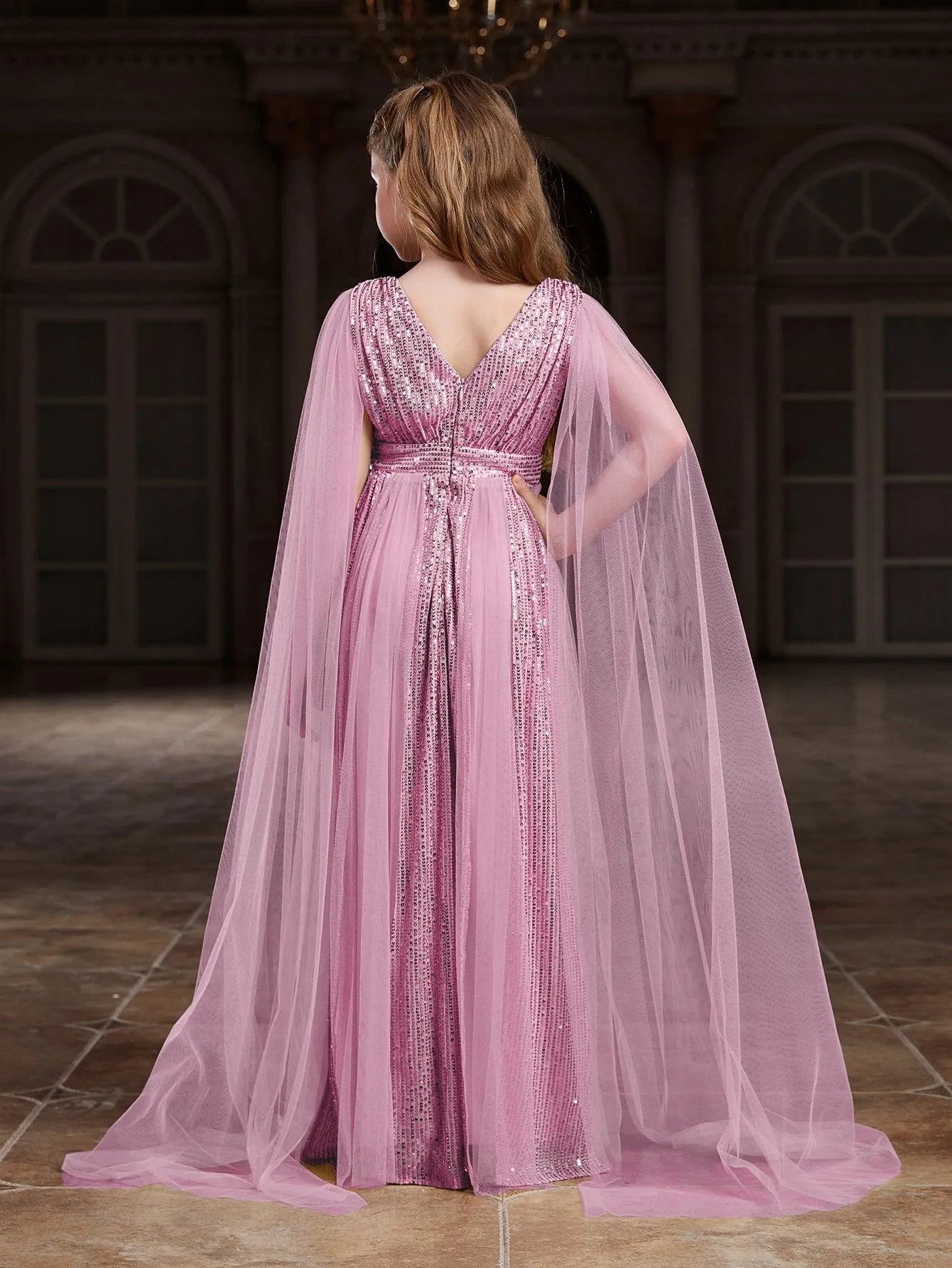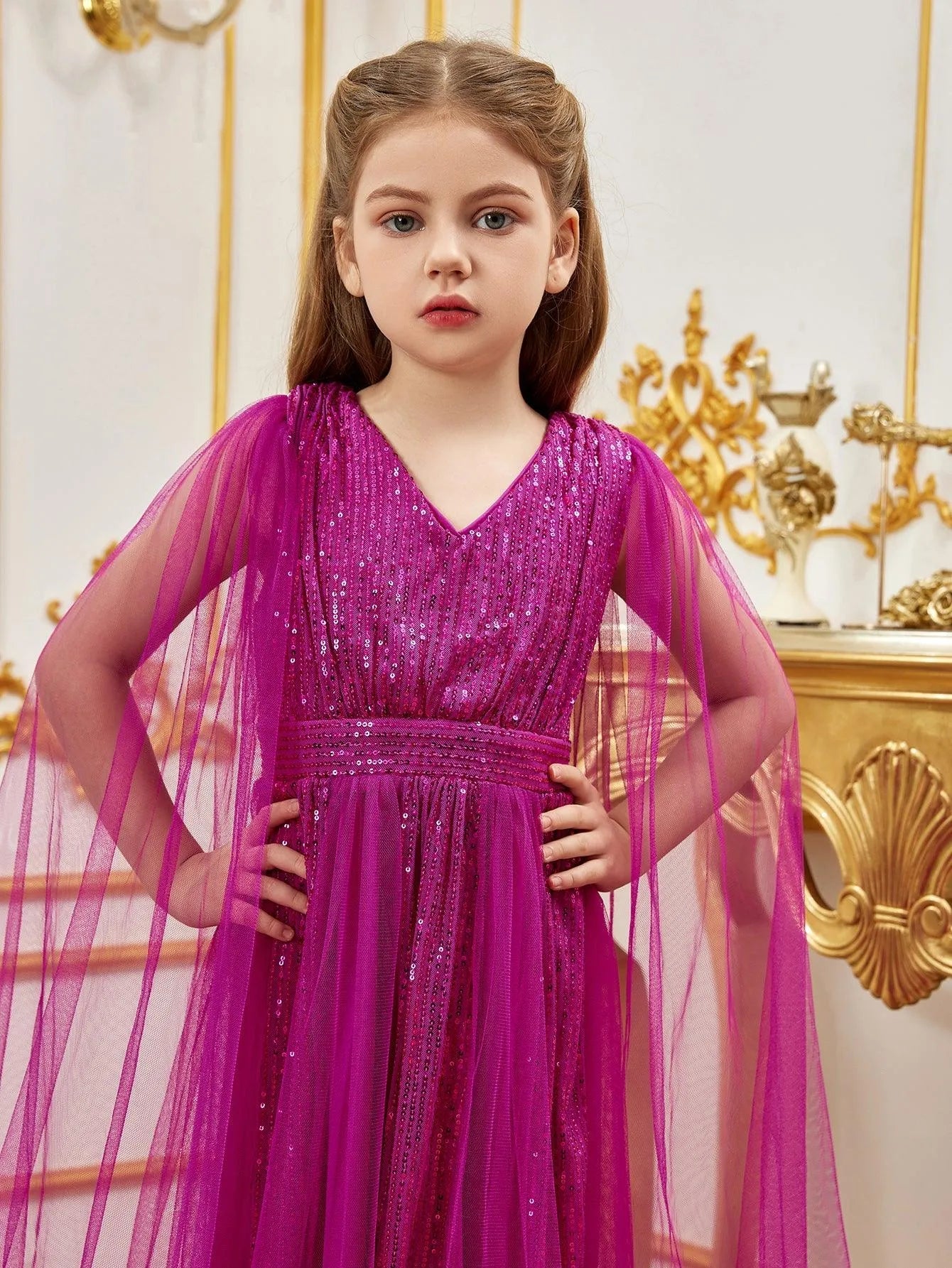 This breathtaking evening gown for young girls exudes elegance and sophistication, perfect for any special occasion. The dress features a fitted bodice adorned with shimmering sequins that create a radiant, sparkling effect. The V-neckline adds a touch of classic refinement, while the floor-length skirt flows gracefully, enhanced by layers of soft tulle that add volume and an ethereal touch. The dress is beautifully accented with long, sheer cape sleeves that drape from the shoulders, providing a dramatic and regal look. Ideal for pageants, formal events, or celebrations, this gown combines luxurious materials and intricate design to ensure your young one stands out with grace and confidence.